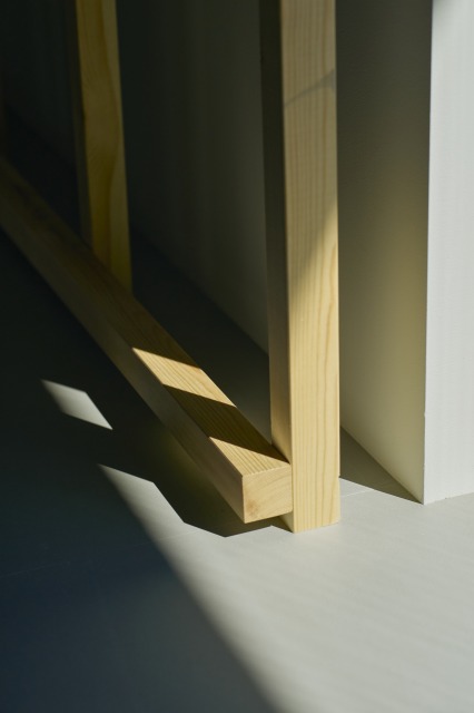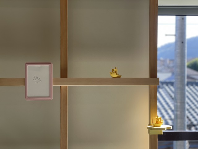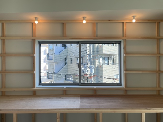窓際をびっしりと埋める格子は、作った作品を掛けるなり、はめるなり、おくなり、貼るなり、できてしまう什器。