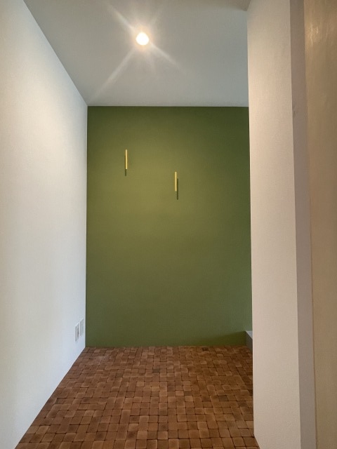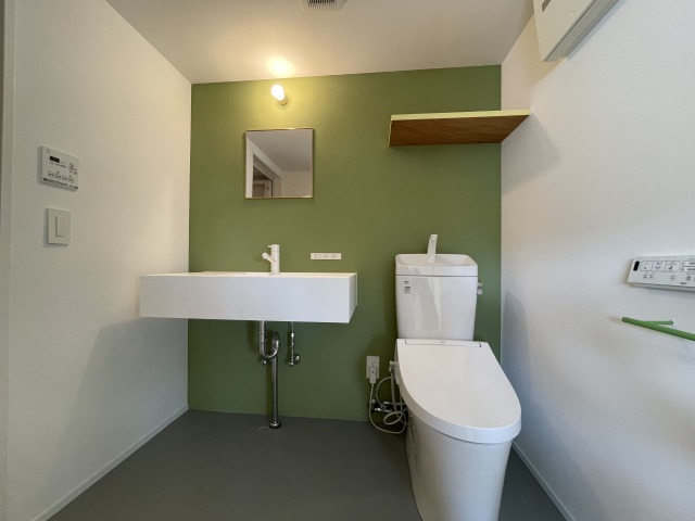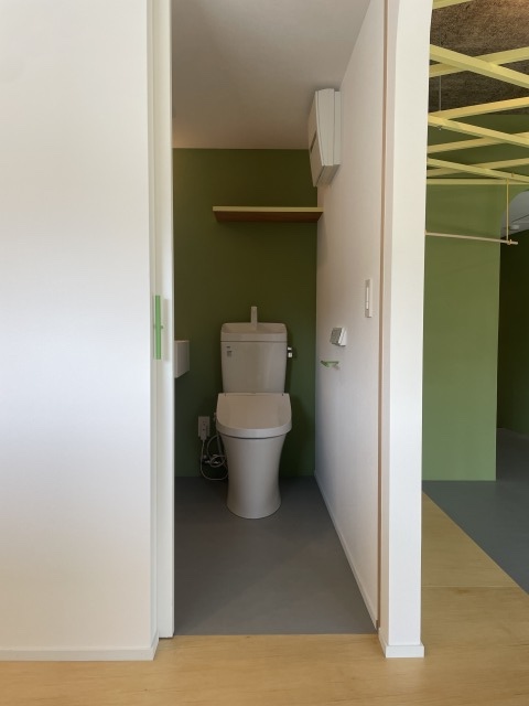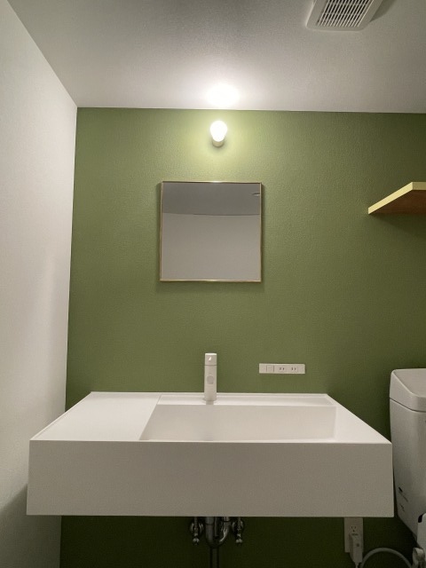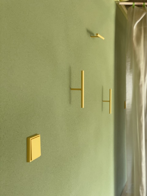 選ぶ色:淡い黄緑と黄色を主として、ドアノブやフック、スイッチプレートまで色を揃えるこだわり。