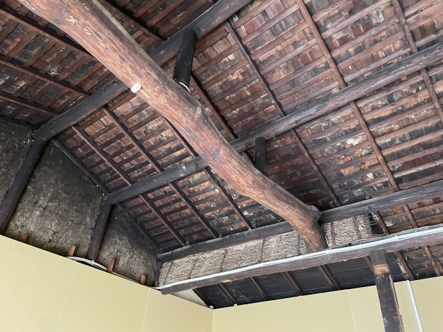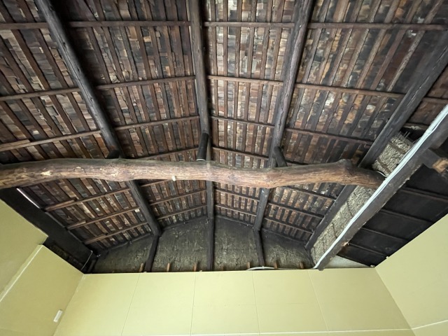 丸太の梁と屋根裏の木の皮たちがかっこいい。