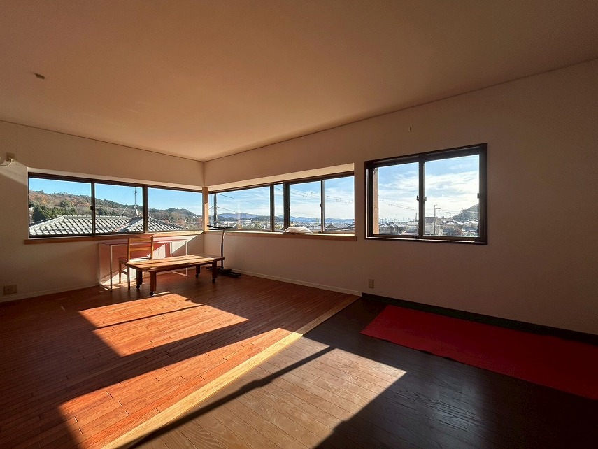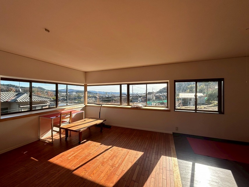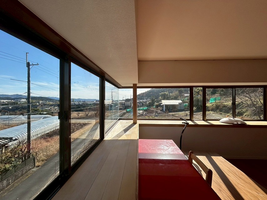 建物も景色を堪能できるような意匠になっており、L字型に出窓部分を設けており、室内は光や風が気持ち良く入ってきて、とても居心地が良い空間です。間仕切り壁がほとんど設けておらずスカッとした間取になっております。