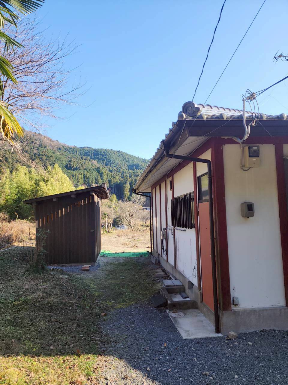 敷地内の真ん中に建物があるので物件をグルッと一周でき、建物横には農機具小屋もあり、整理・保管ができます