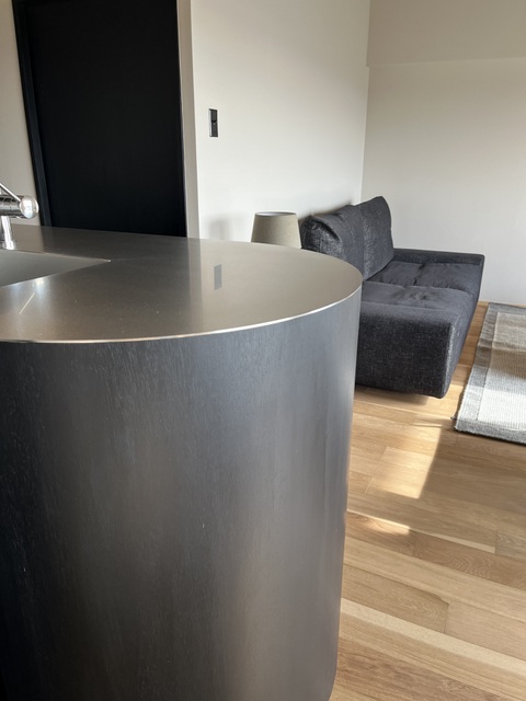 アールの部分が素敵な造作キッチン。もう素敵すぎて撫でまわしたいです。キッチンの床はマーモリウムっていう天然素材が主原料の床材で、これが無茶苦茶、足触りが良いんです。気持ちよくて、ちょうどいいクッション性でキッチンの作業も快適。