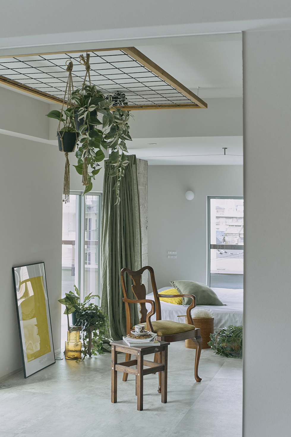 靴を脱ぎ何気に横を見ると、天井から床まである大きな一枚の鏡が設置されていた。映った自分の姿に思わずビクッと反応したが、鏡の奥には両手を広げ喜ぶ彼女の背中が写っていて、部屋をより広く感じさせる。反対側の天井に目をやると、そこには花や植物が吊り下げれる様に格子が付いている。