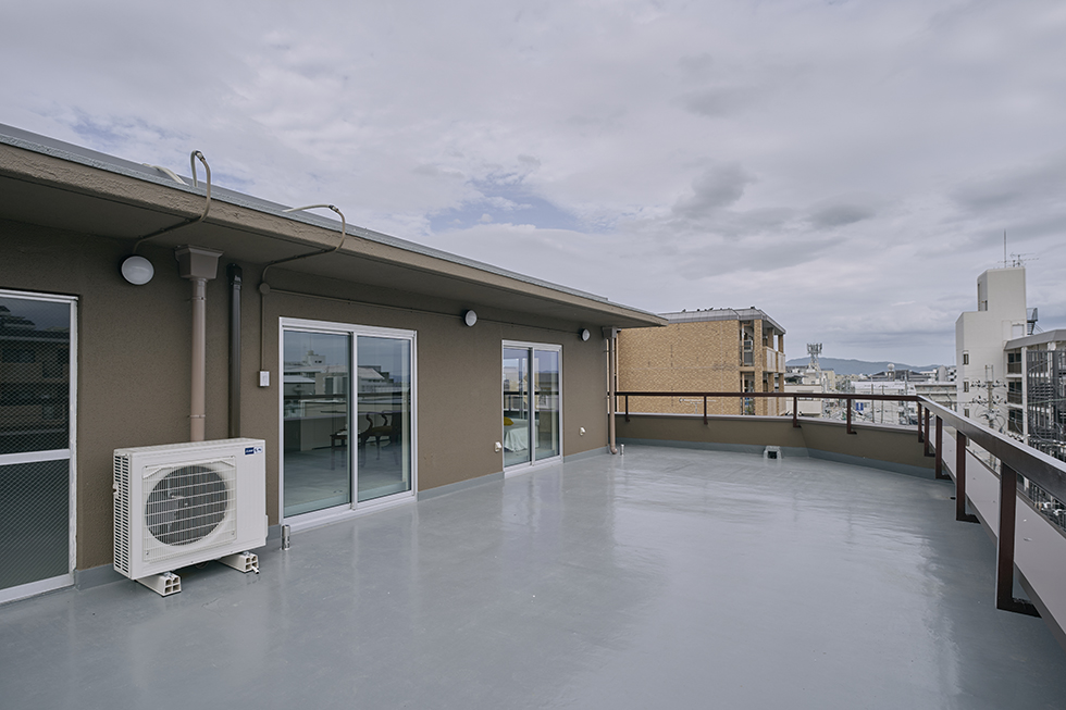 「是非、見てください。この物件、ベランダの方が部屋より大きいんですよ。周りにもそんなに大きな建物がないから、景色も最高で、京都をぐるっとほぼ一望できますし。外でBBQしようがプールを置こうが人目気にせず、なんでもできますよ。」