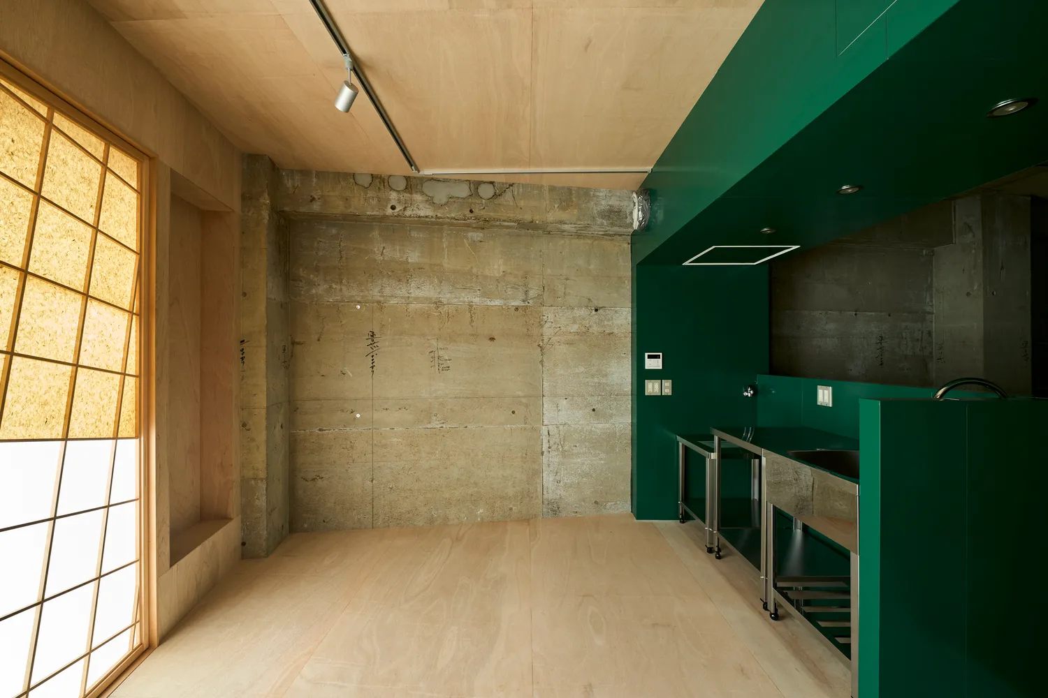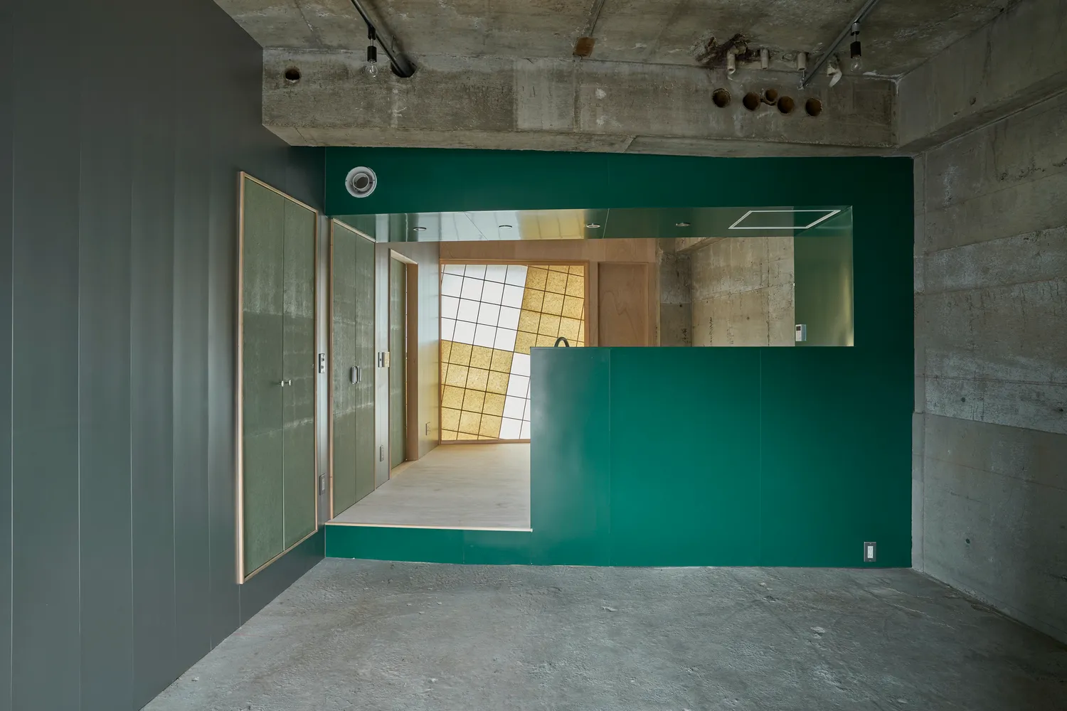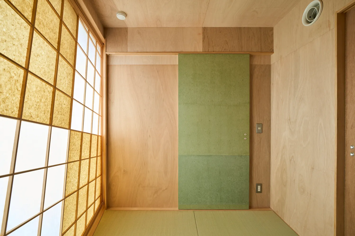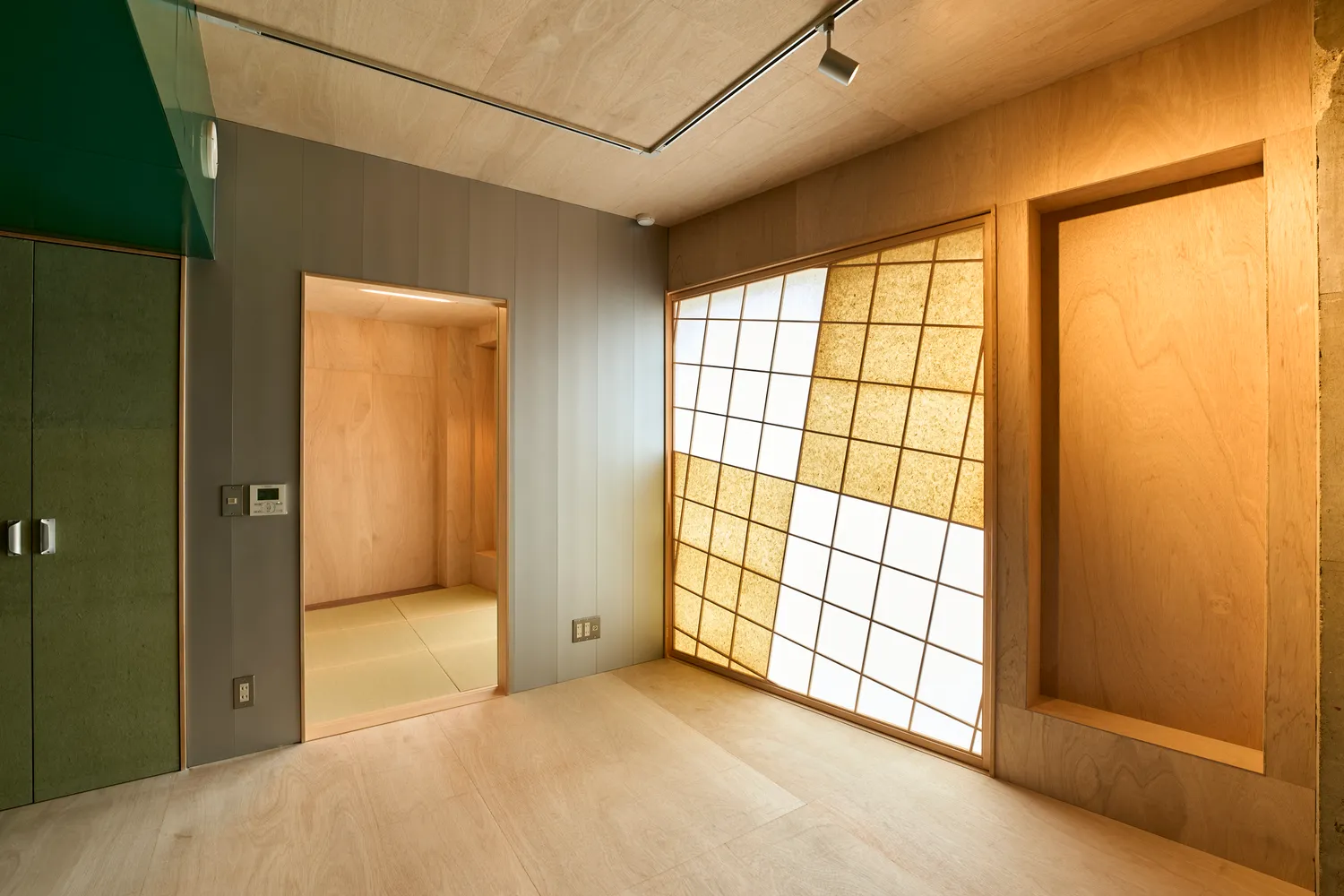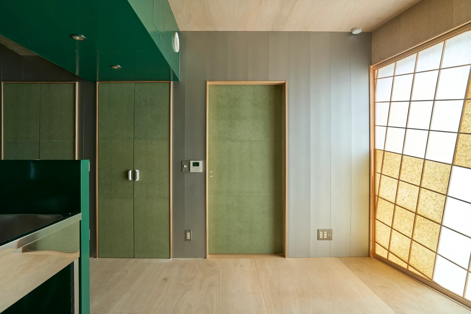 ②既存RC躯体とシルバーとグリーンの板金、ラワン合板と少しの和紙で空間を構成しているが、少し不思議な組み合わせに見えるかもしれない。少量だが、選りすぐった木材を使っている箇所もある。建具はしっかり棲み分けを意識している。存在感を潜めてもらうもの、部屋のアクセントになるもの、光の調整をするもの。バルコニーに面した障子は一見すると白くて分かりにくいが、1枚の建具で障子紙(光が透過)+和紙(光が不透過)の