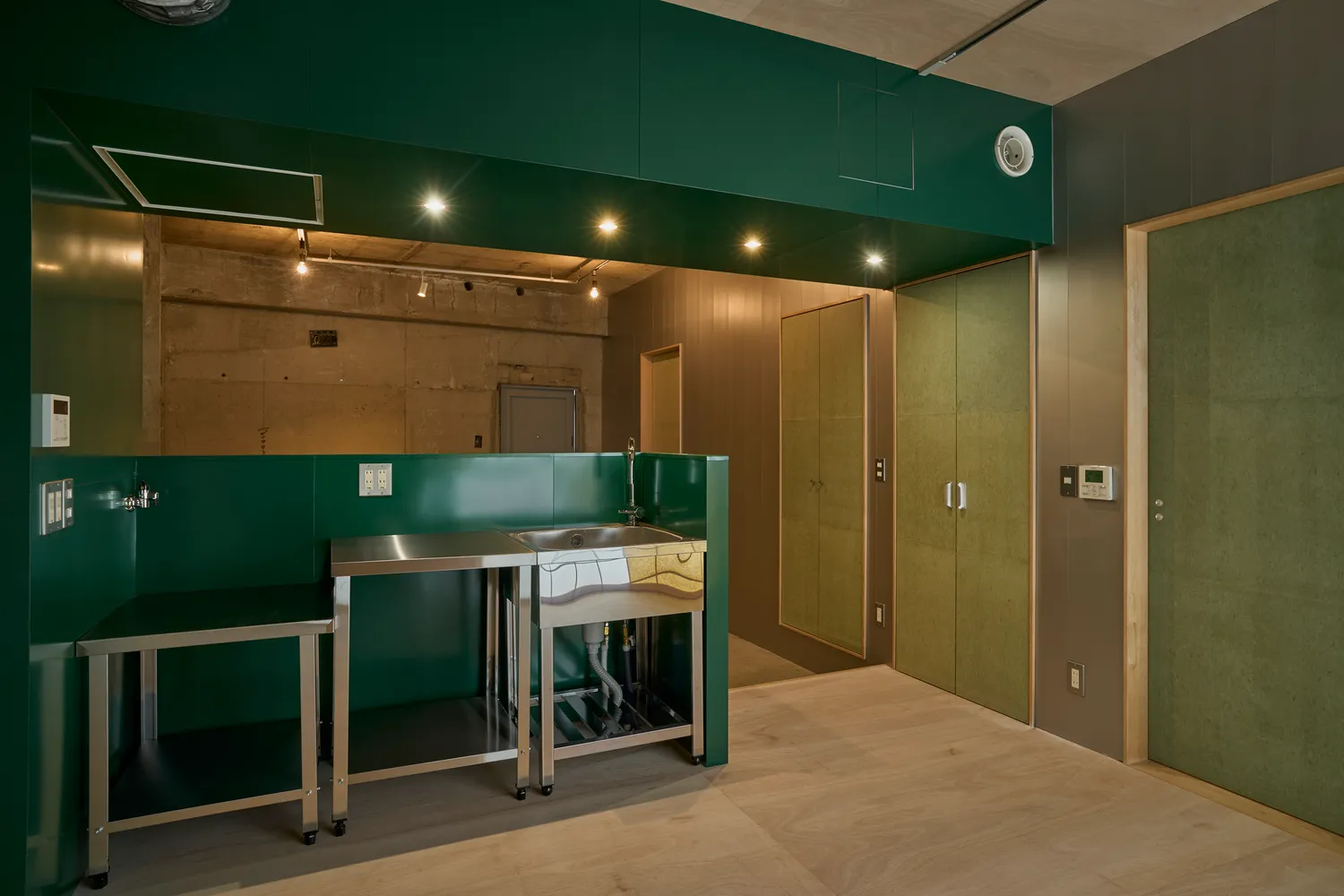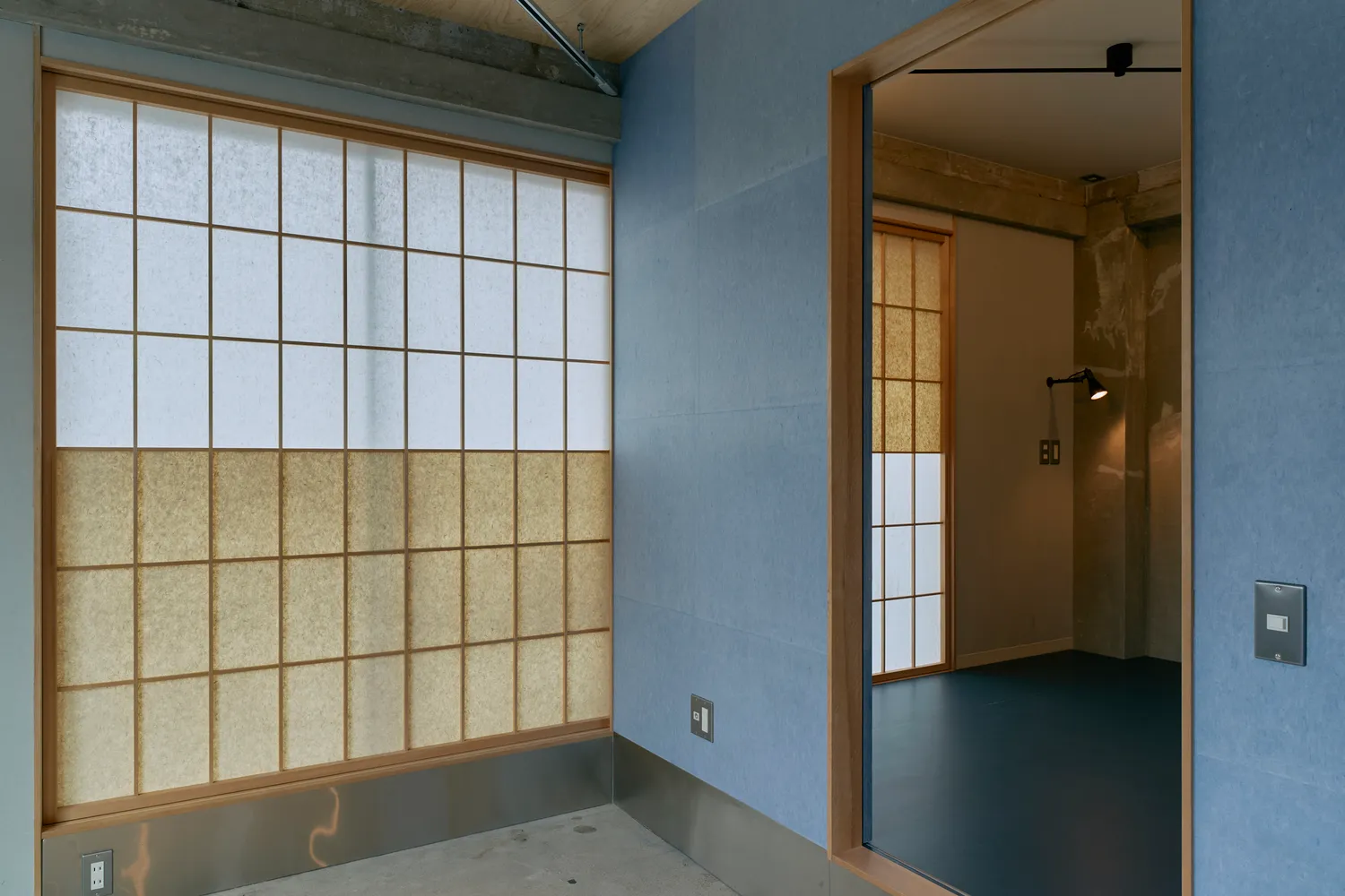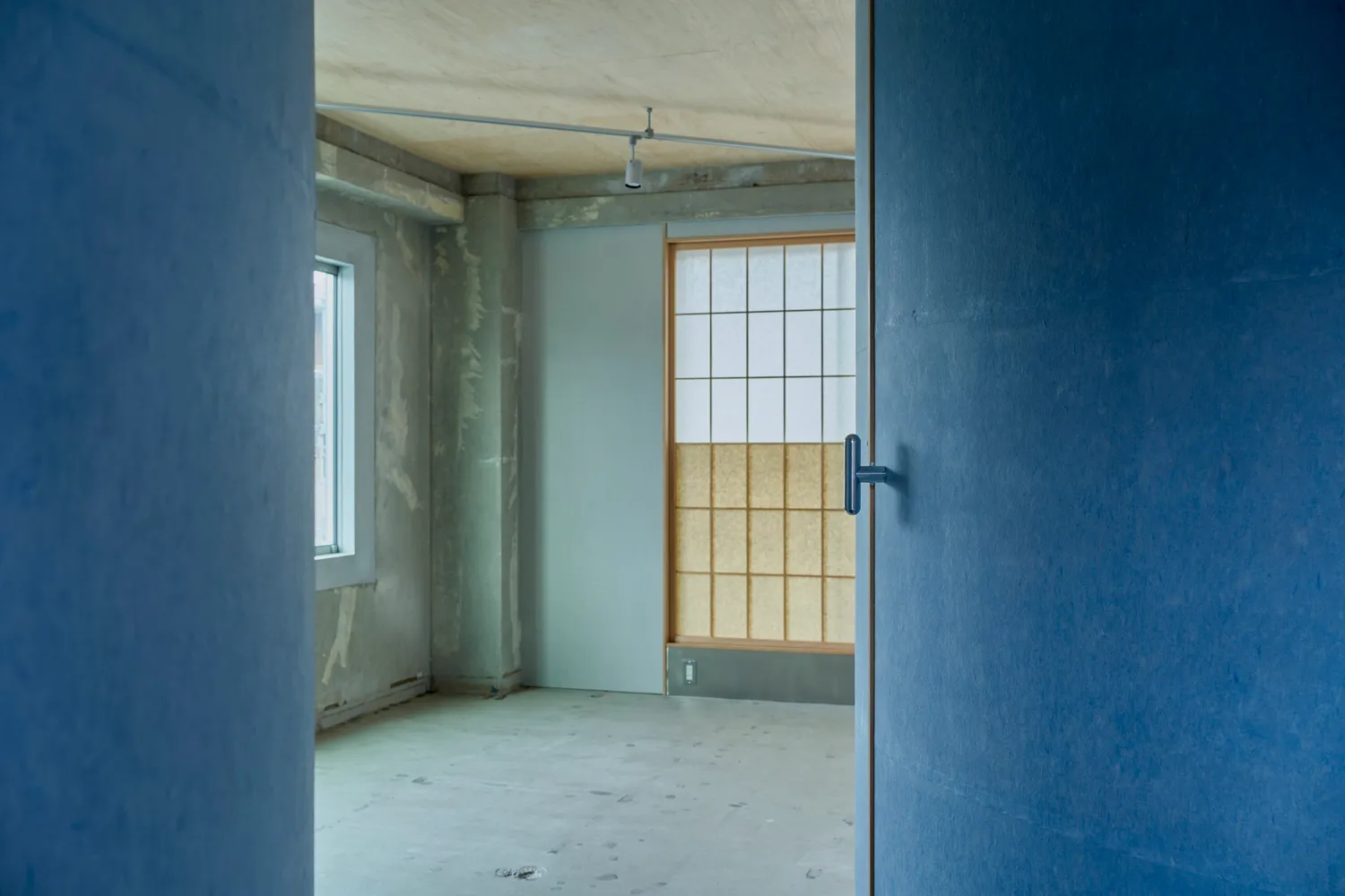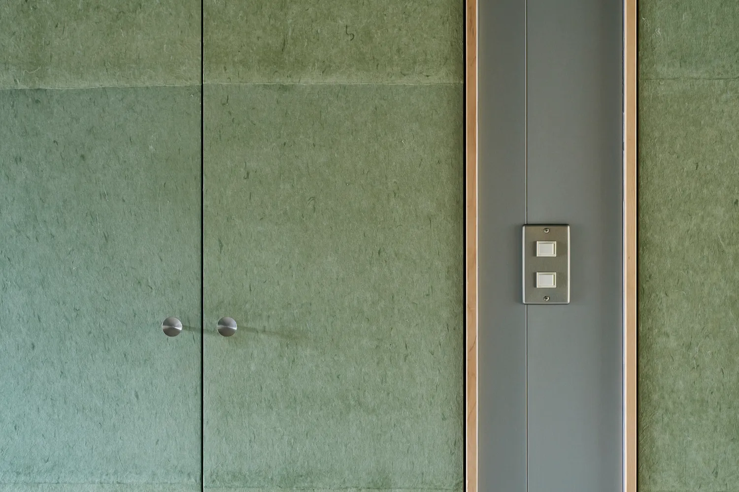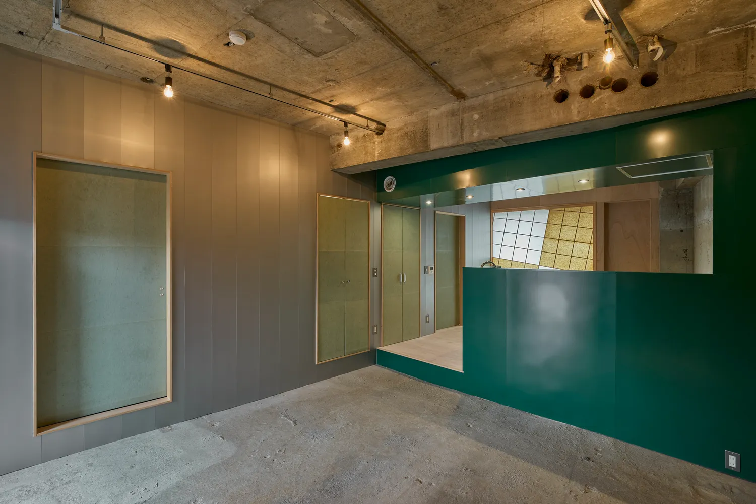 ②既存RC躯体とシルバーとグリーンの板金、ラワン合板と少しの和紙で空間を構成しているが、少し不思議な組み合わせに見えるかもしれない。少量だが、選りすぐった木材を使っている箇所もある。建具はしっかり棲み分けを意識している。存在感を潜めてもらうもの、部屋のアクセントになるもの、光の調整をするもの。バルコニーに面した障子は一見すると白くて分かりにくいが、1枚の建具で障子紙(光が透過)+和紙(光が不透過)の