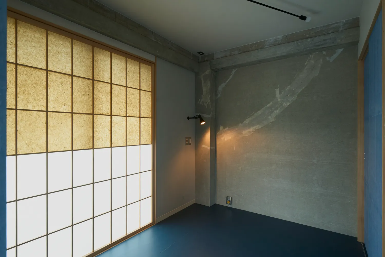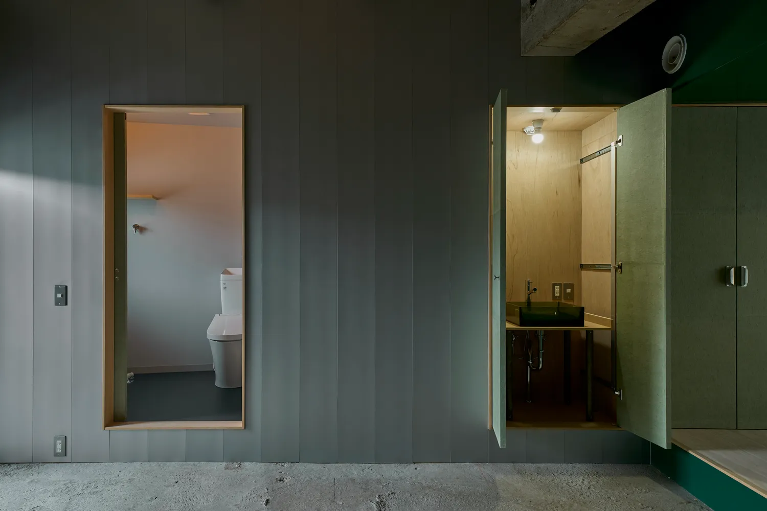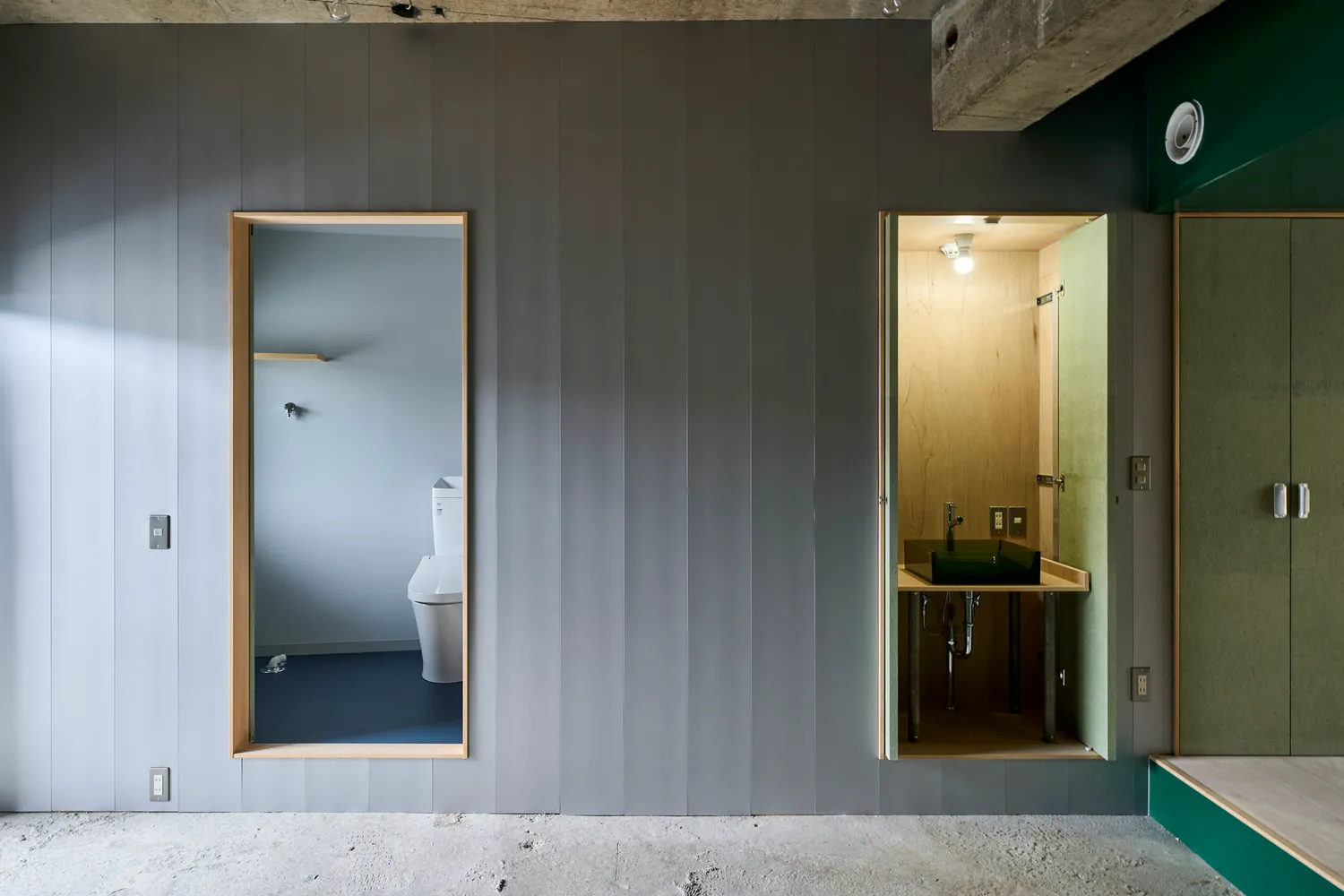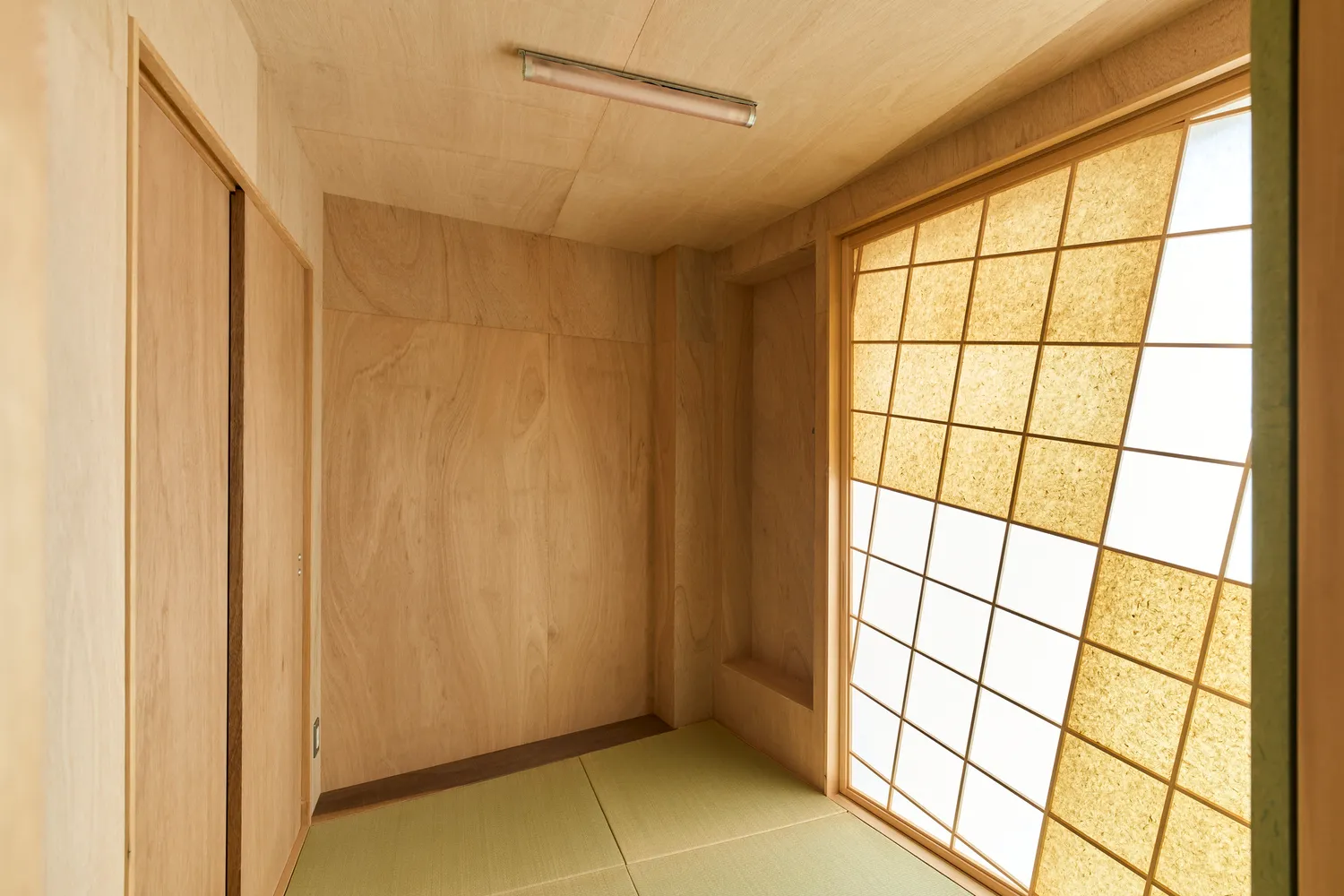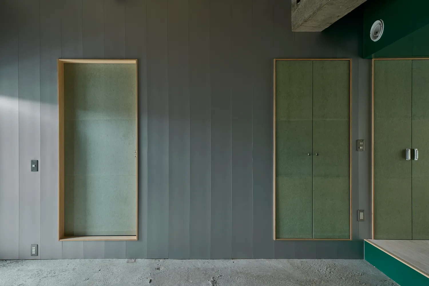 ②既存RC躯体とシルバーとグリーンの板金、ラワン合板と少しの和紙で空間を構成しているが、少し不思議な組み合わせに見えるかもしれない。少量だが、選りすぐった木材を使っている箇所もある。建具はしっかり棲み分けを意識している。存在感を潜めてもらうもの、部屋のアクセントになるもの、光の調整をするもの。バルコニーに面した障子は一見すると白くて分かりにくいが、1枚の建具で障子紙(光が透過)+和紙(光が不透過)の