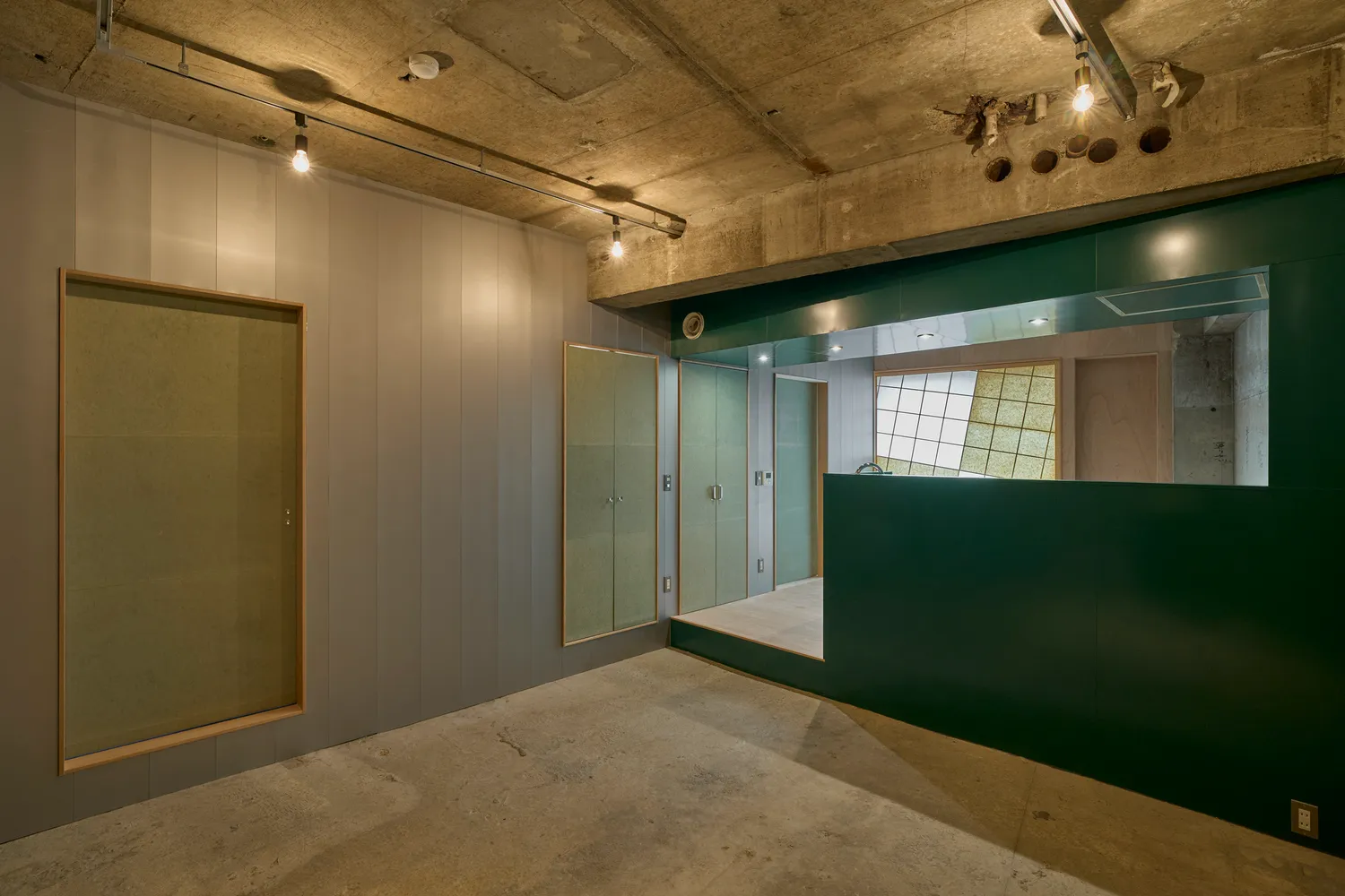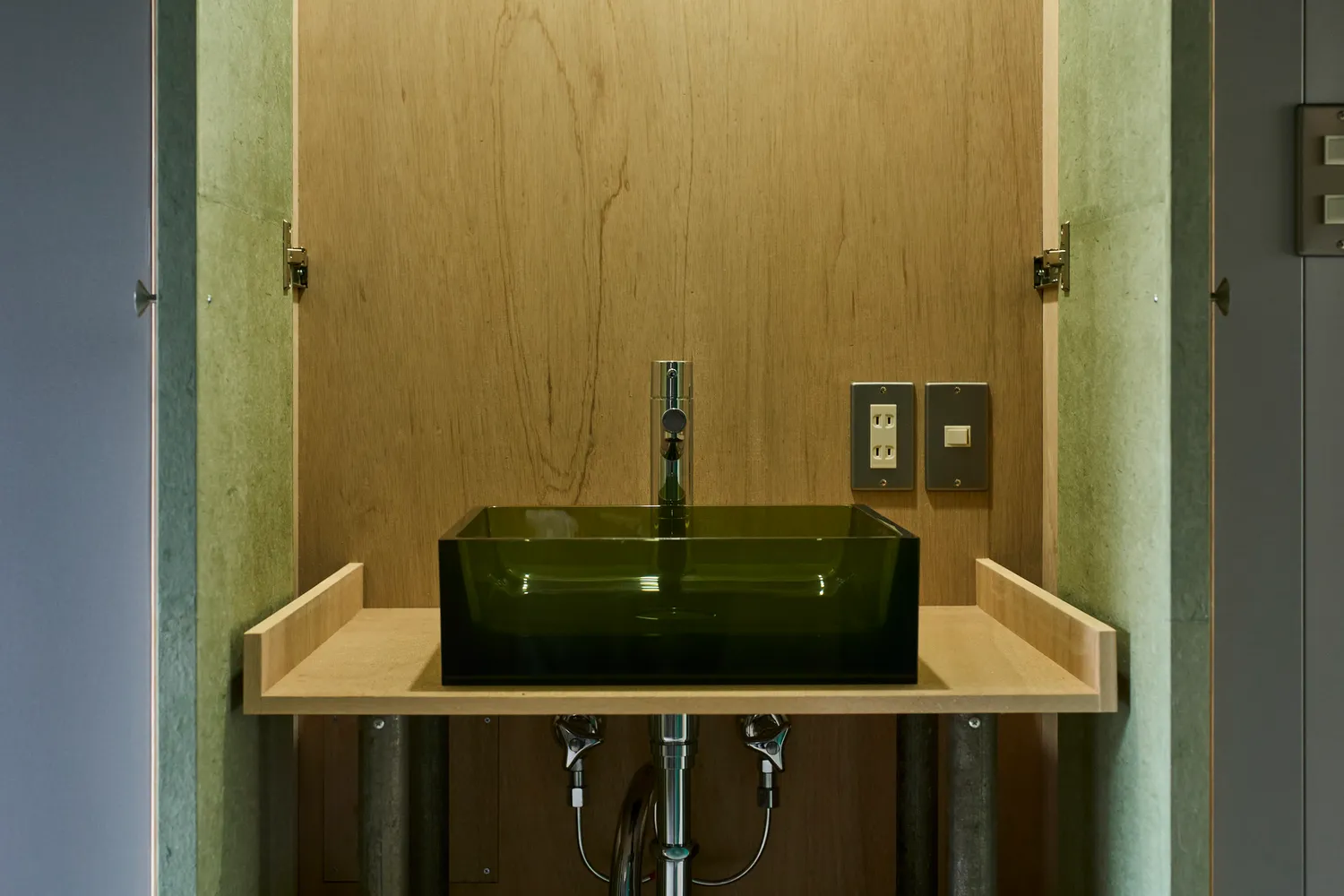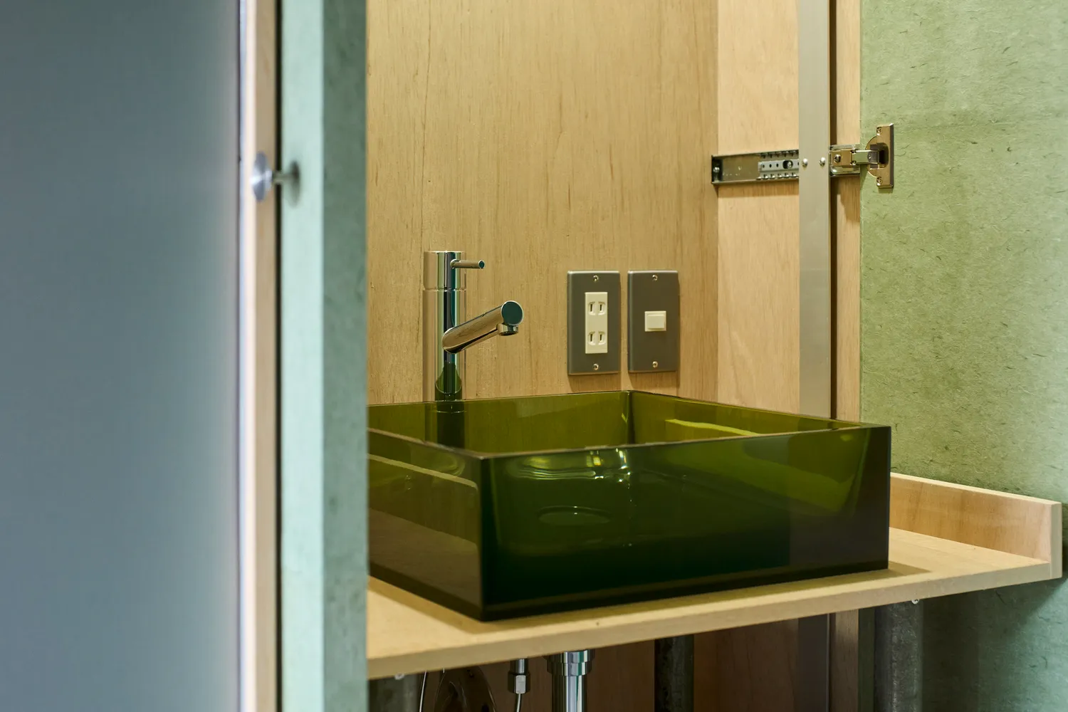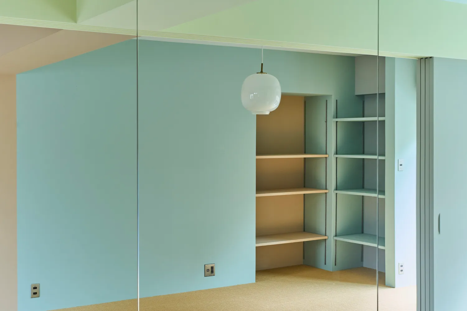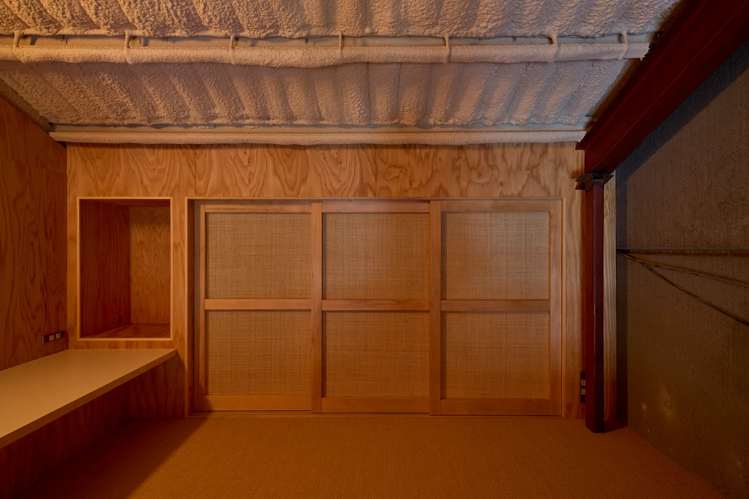 ②既存RC躯体とシルバーとグリーンの板金、ラワン合板と少しの和紙で空間を構成しているが、少し不思議な組み合わせに見えるかもしれない。少量だが、選りすぐった木材を使っている箇所もある。建具はしっかり棲み分けを意識している。存在感を潜めてもらうもの、部屋のアクセントになるもの、光の調整をするもの。バルコニーに面した障子は一見すると白くて分かりにくいが、1枚の建具で障子紙(光が透過)+和紙(光が不透過)の