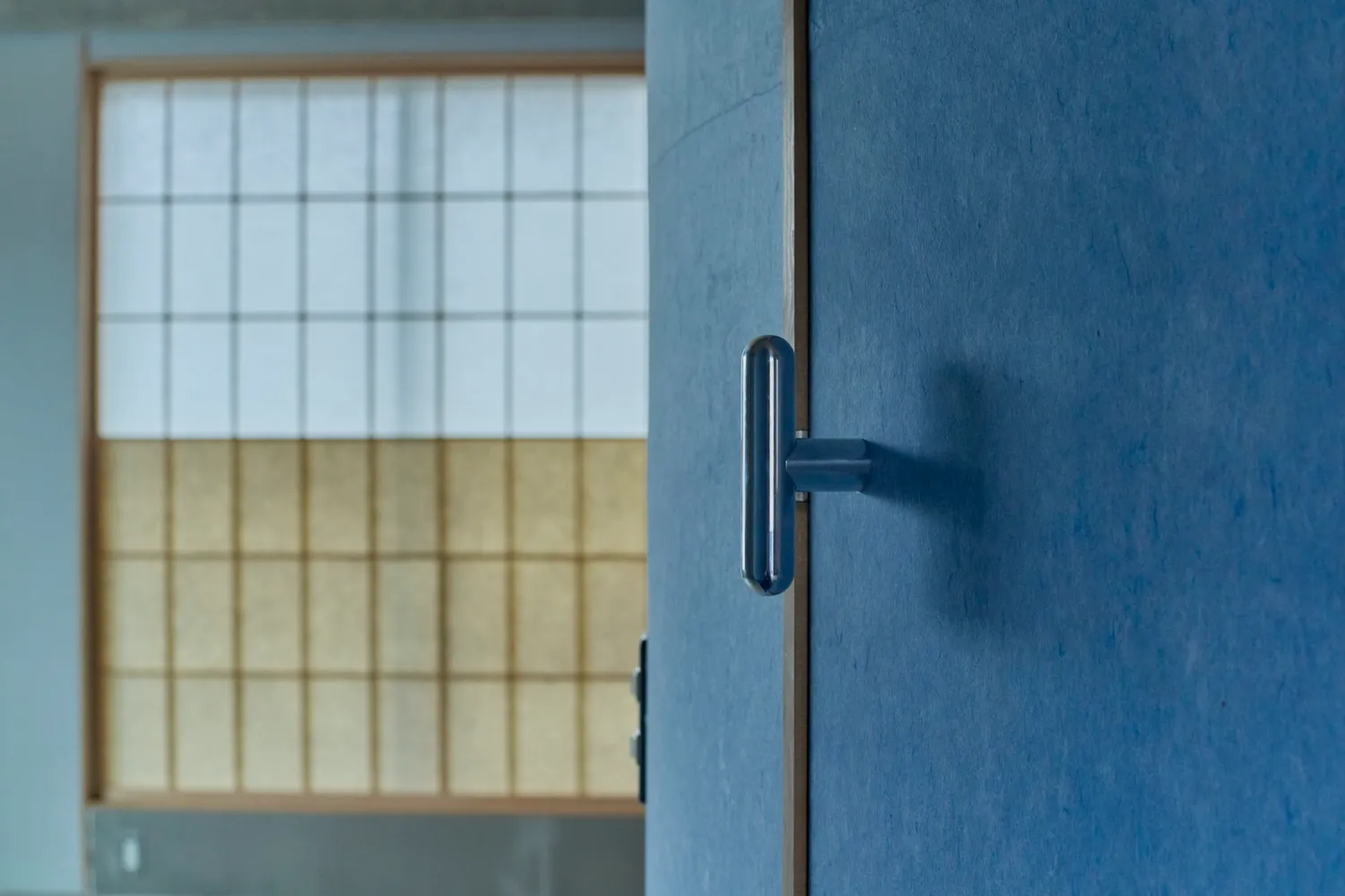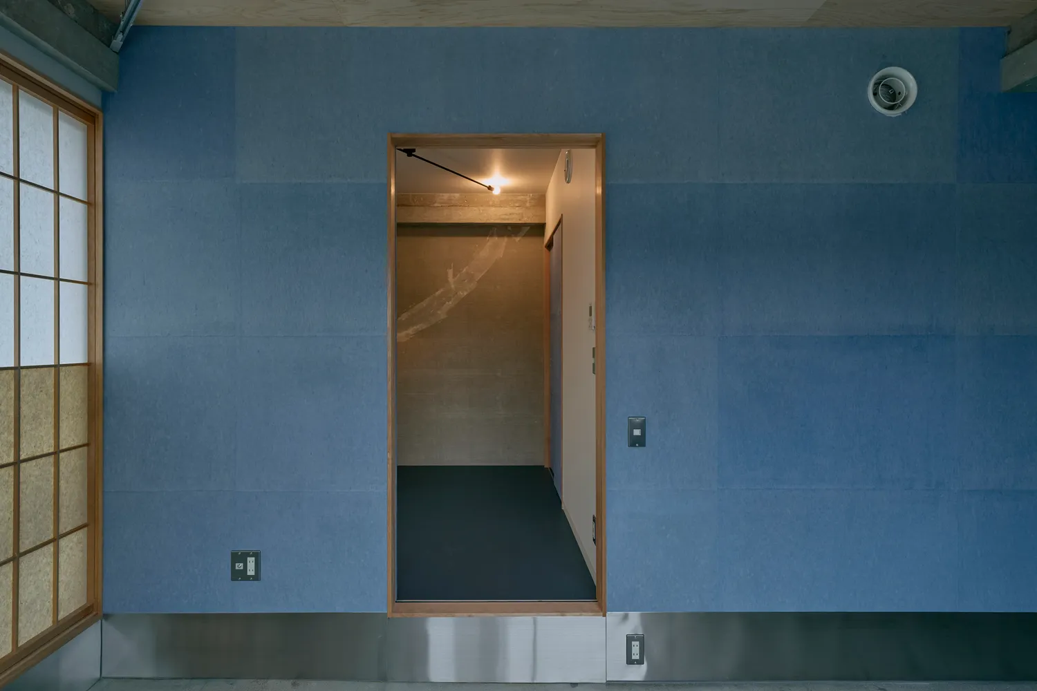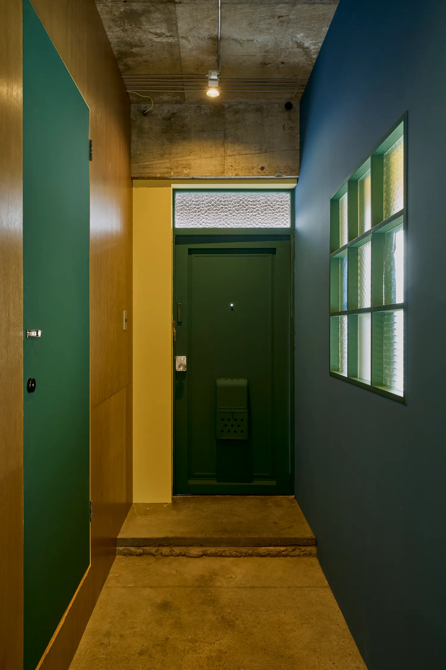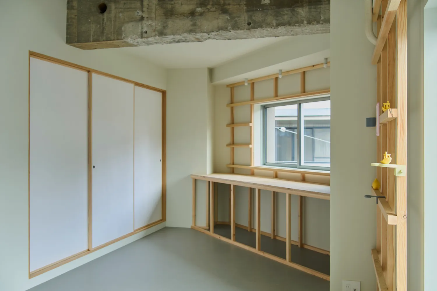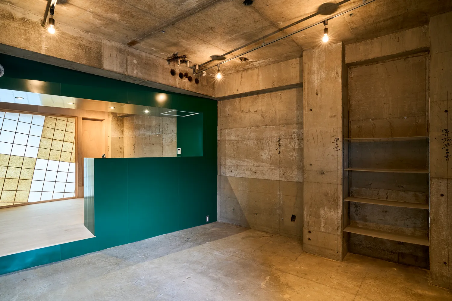 ②既存RC躯体とシルバーとグリーンの板金、ラワン合板と少しの和紙で空間を構成しているが、少し不思議な組み合わせに見えるかもしれない。少量だが、選りすぐった木材を使っている箇所もある。建具はしっかり棲み分けを意識している。存在感を潜めてもらうもの、部屋のアクセントになるもの、光の調整をするもの。バルコニーに面した障子は一見すると白くて分かりにくいが、1枚の建具で障子紙(光が透過)+和紙(光が不透過)の