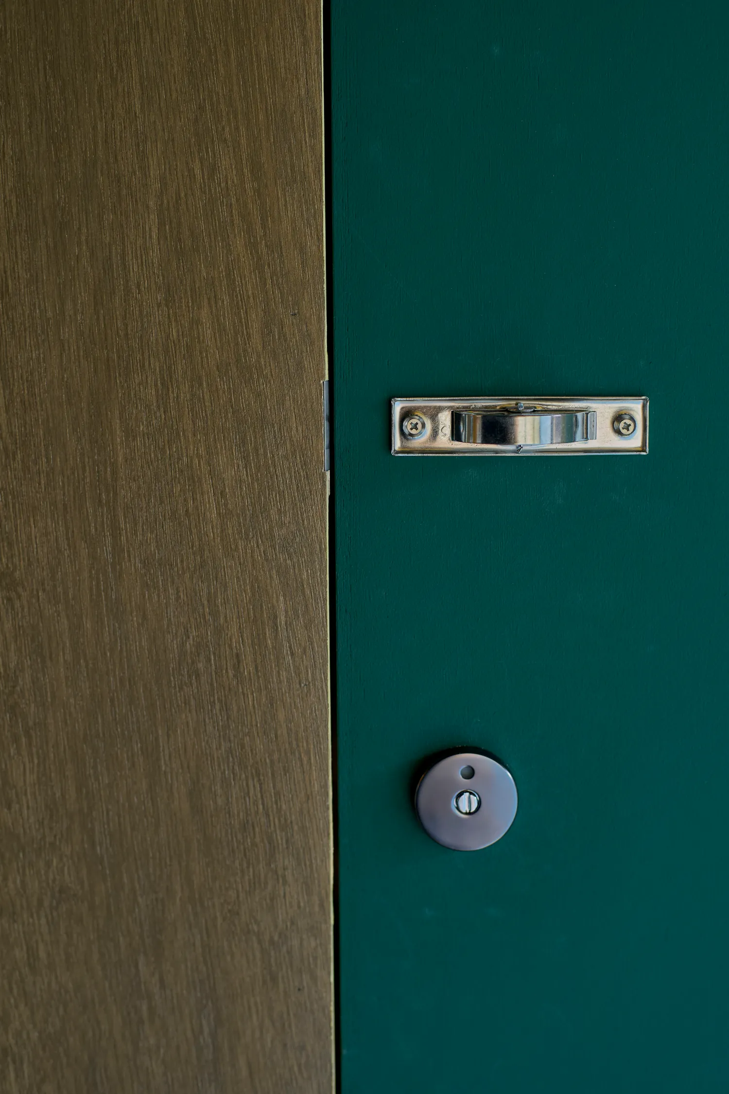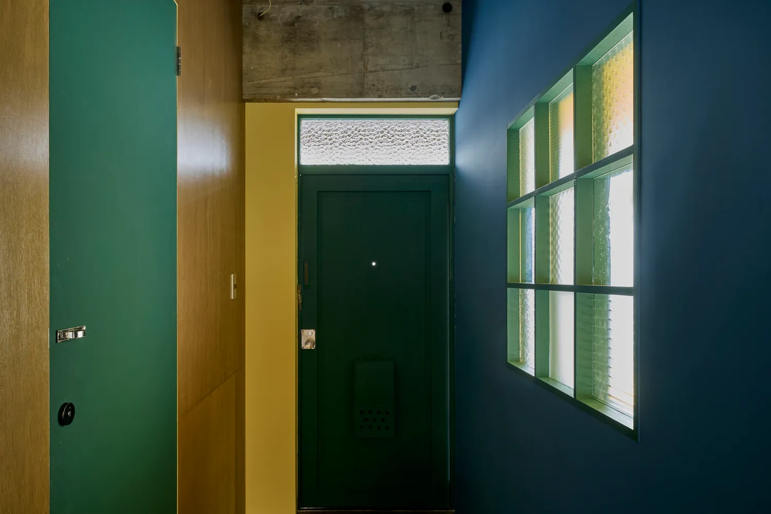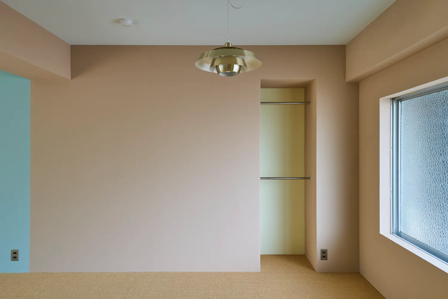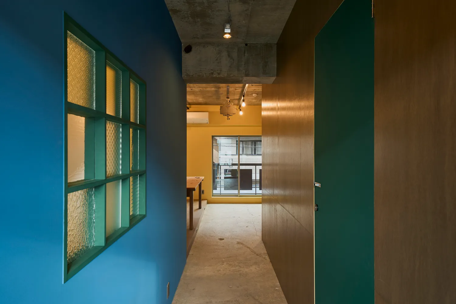 ②既存RC躯体とシルバーとグリーンの板金、ラワン合板と少しの和紙で空間を構成しているが、少し不思議な組み合わせに見えるかもしれない。少量だが、選りすぐった木材を使っている箇所もある。建具はしっかり棲み分けを意識している。存在感を潜めてもらうもの、部屋のアクセントになるもの、光の調整をするもの。バルコニーに面した障子は一見すると白くて分かりにくいが、1枚の建具で障子紙(光が透過)+和紙(光が不透過)の