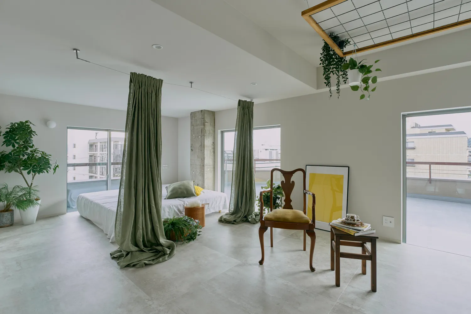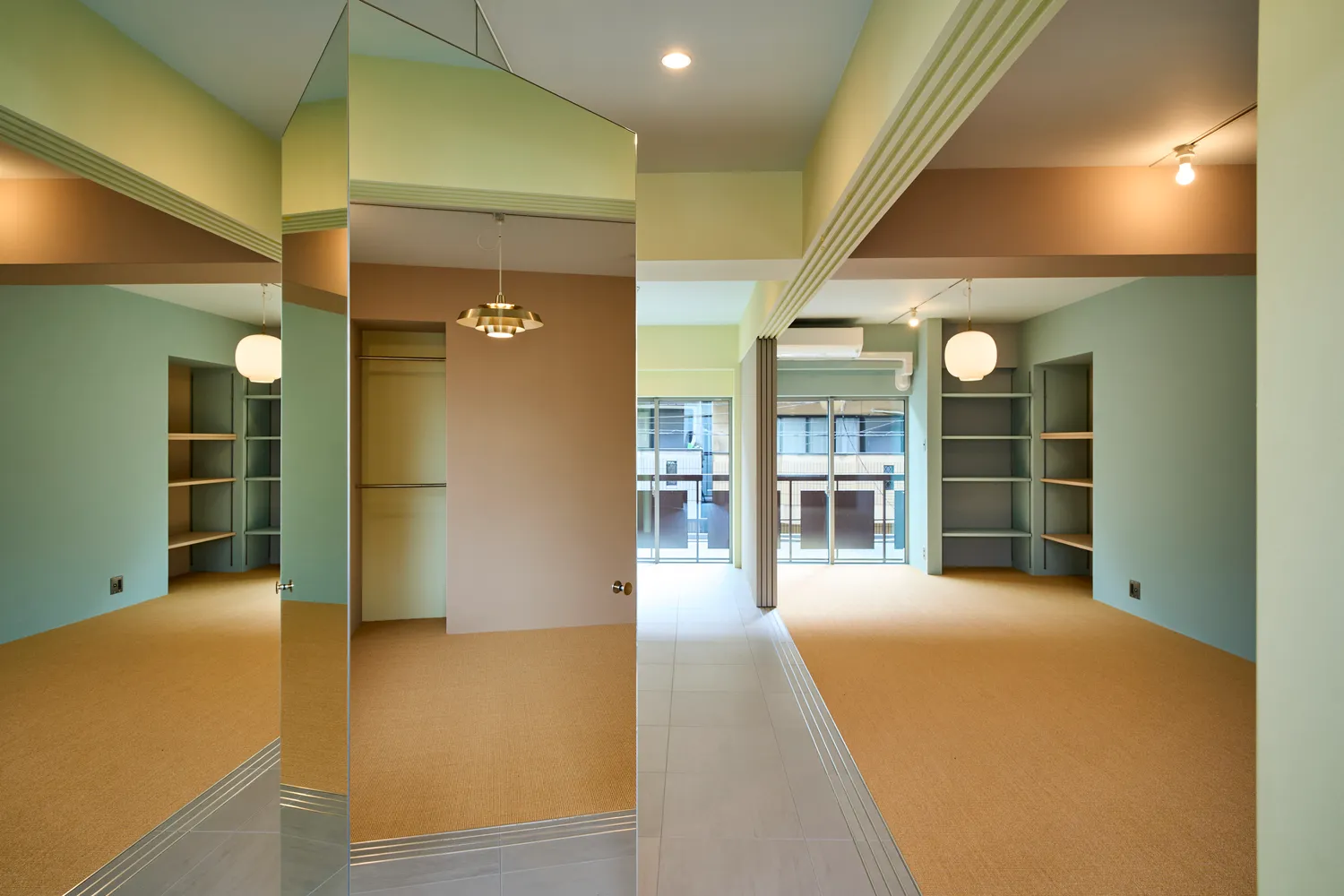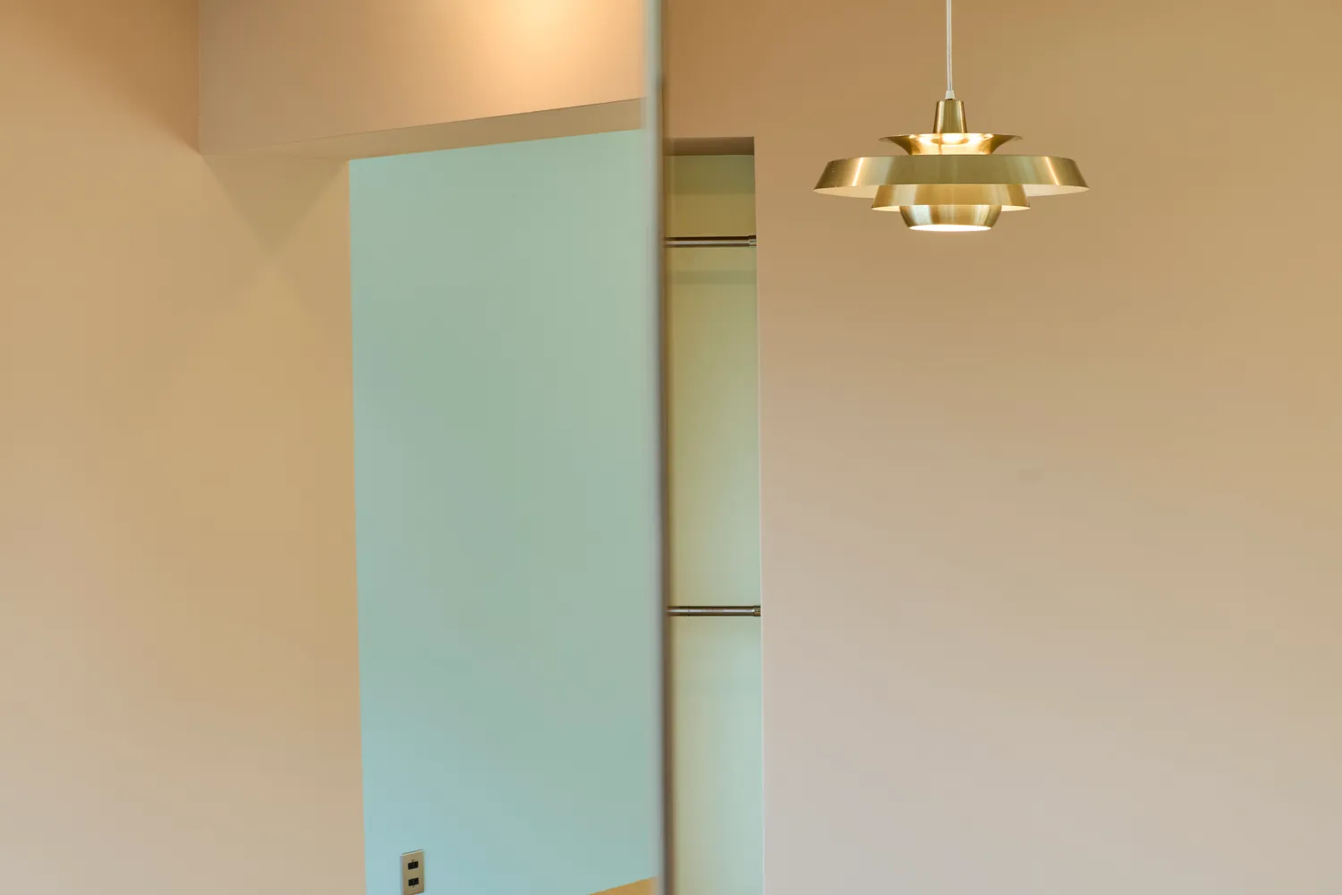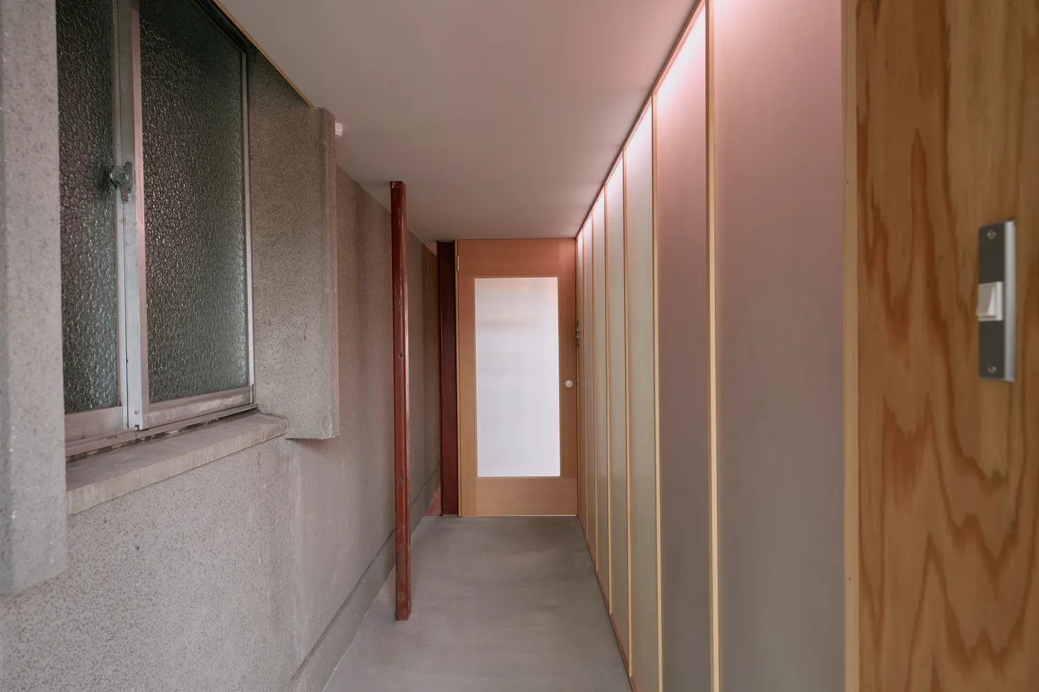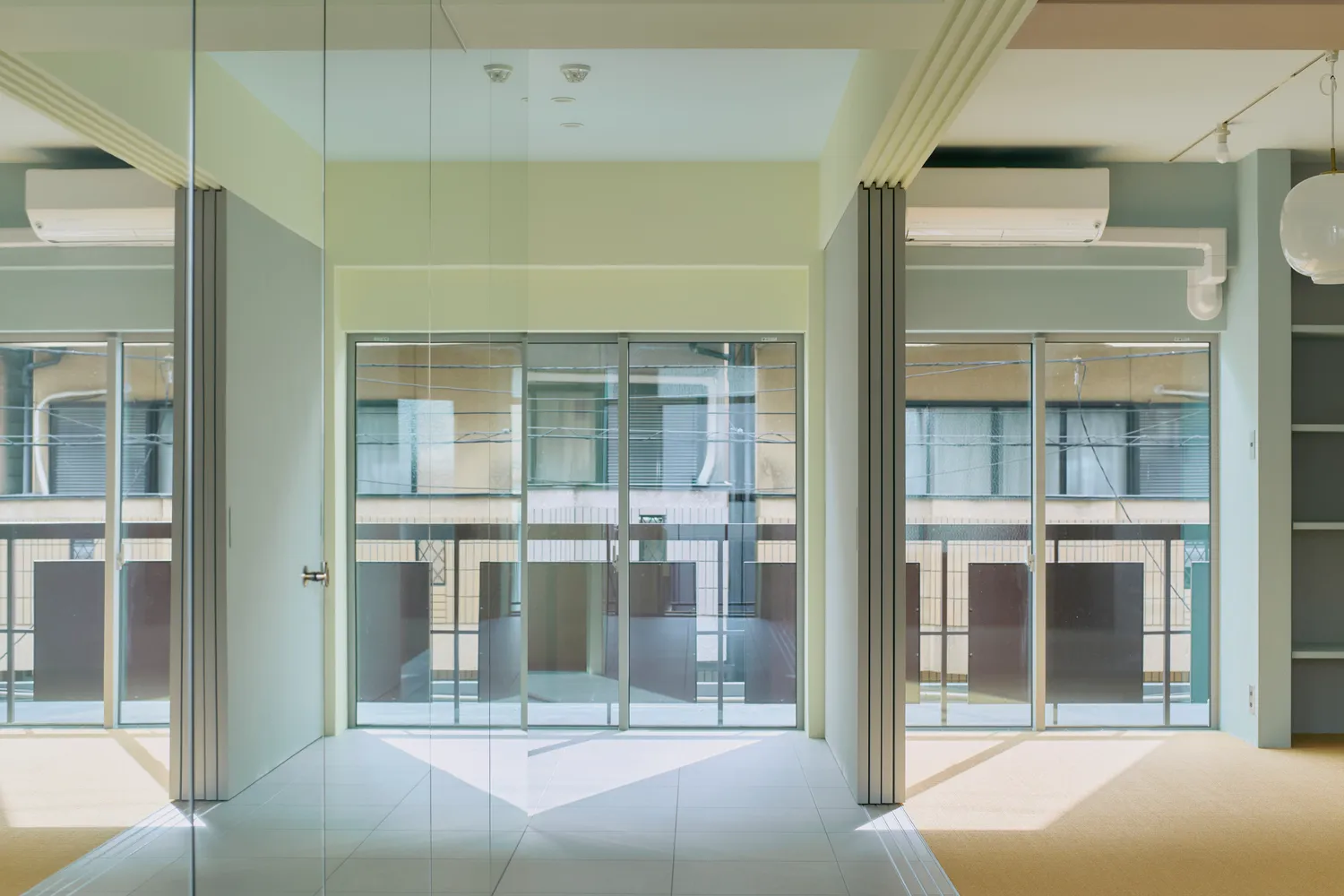 ②既存RC躯体とシルバーとグリーンの板金、ラワン合板と少しの和紙で空間を構成しているが、少し不思議な組み合わせに見えるかもしれない。少量だが、選りすぐった木材を使っている箇所もある。建具はしっかり棲み分けを意識している。存在感を潜めてもらうもの、部屋のアクセントになるもの、光の調整をするもの。バルコニーに面した障子は一見すると白くて分かりにくいが、1枚の建具で障子紙(光が透過)+和紙(光が不透過)の