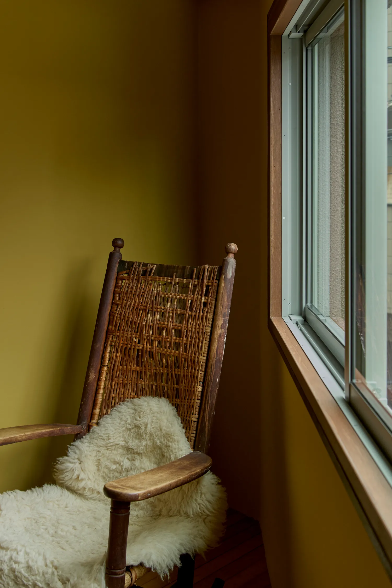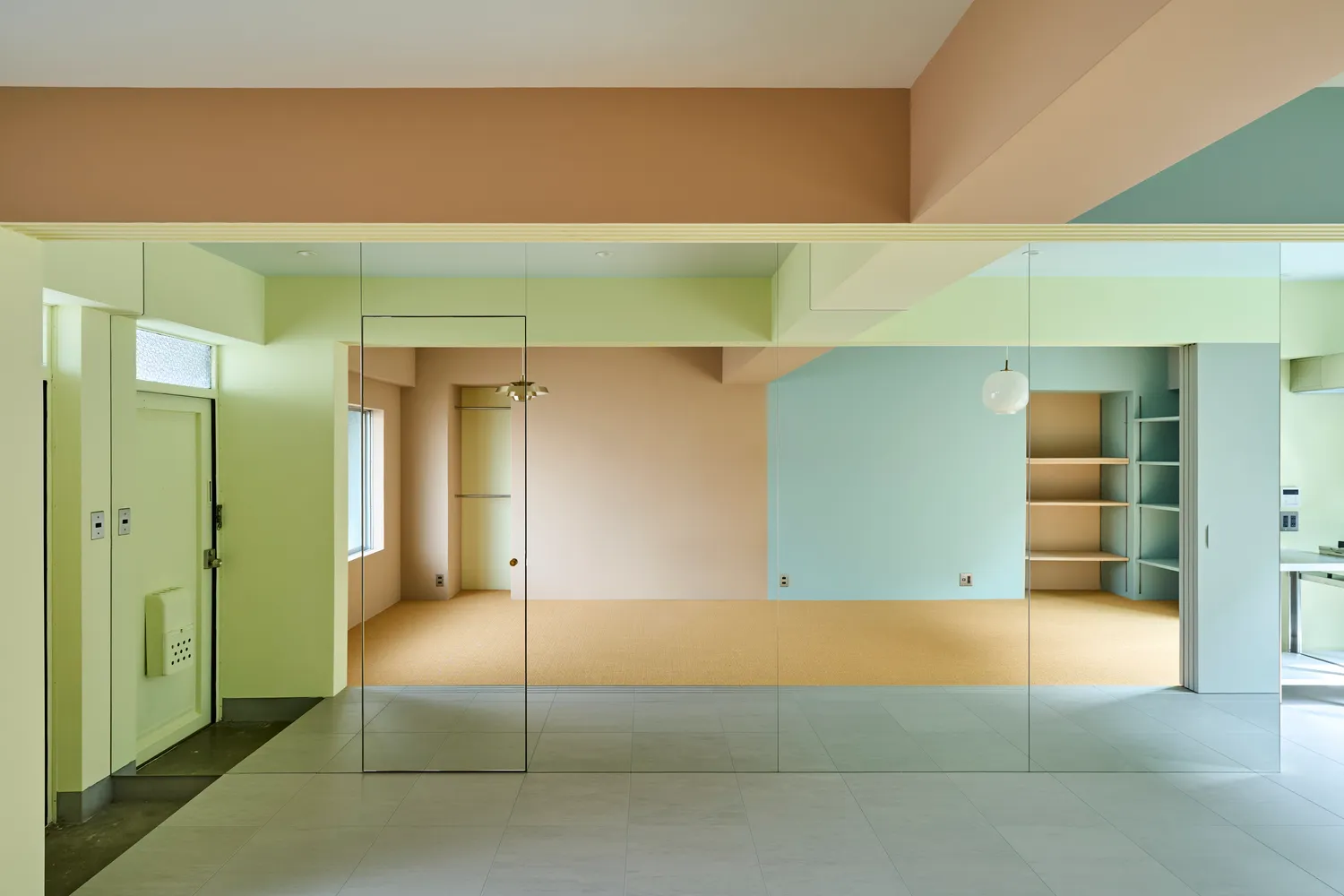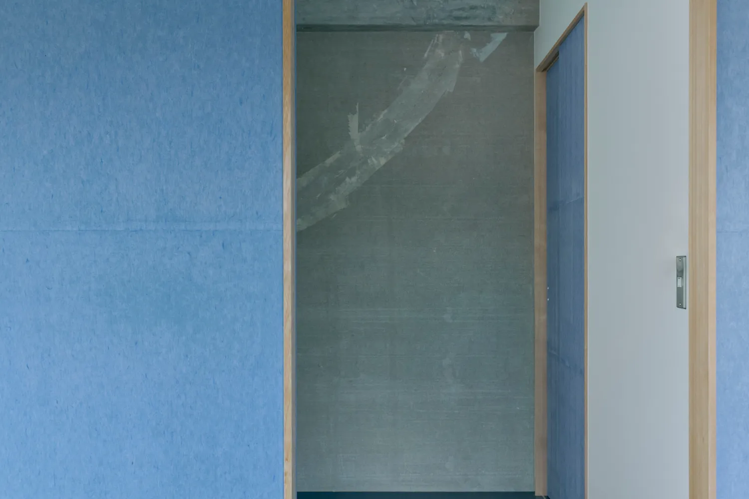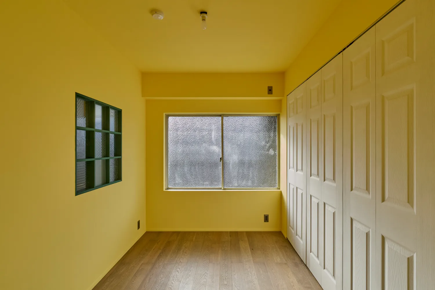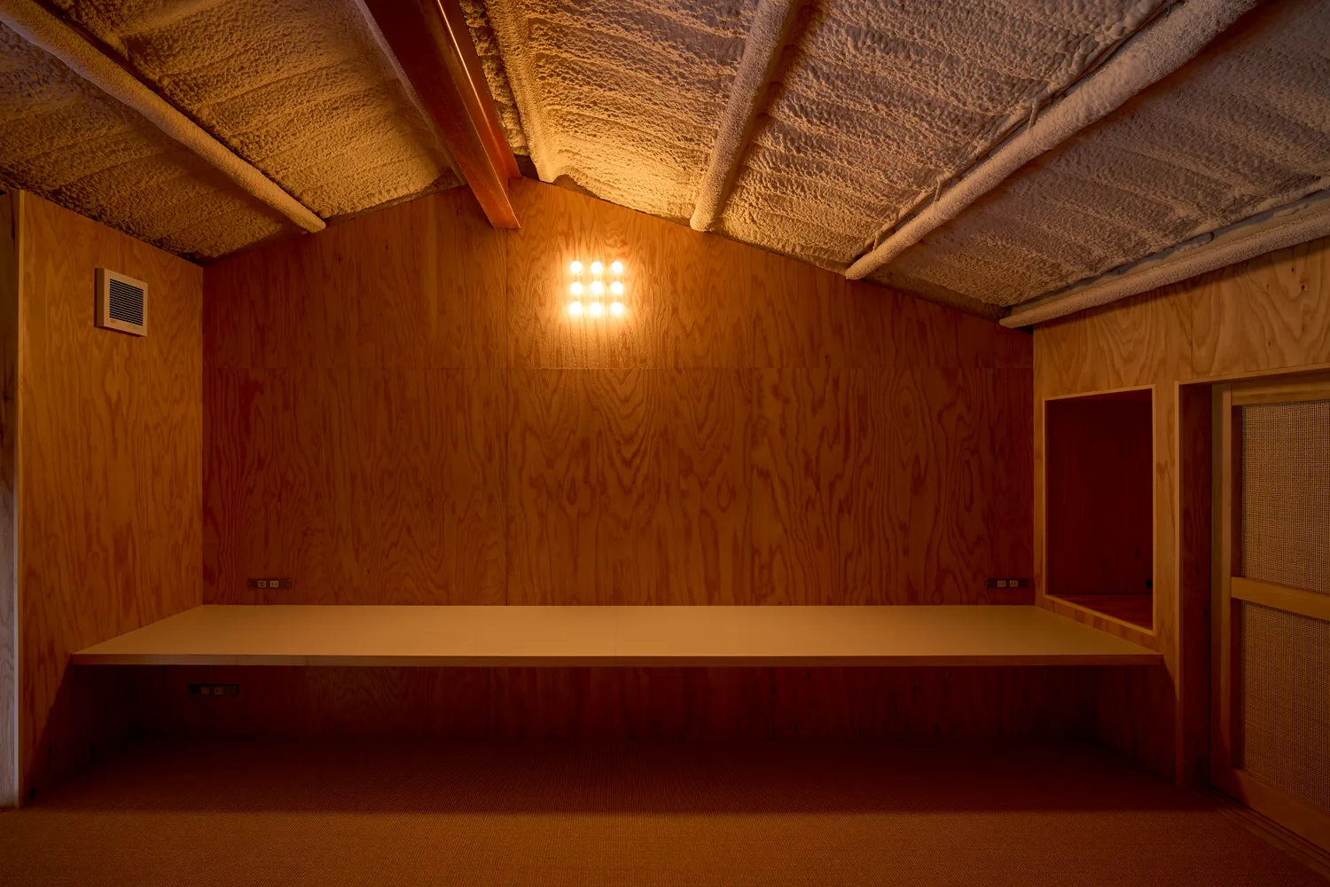 ②既存RC躯体とシルバーとグリーンの板金、ラワン合板と少しの和紙で空間を構成しているが、少し不思議な組み合わせに見えるかもしれない。少量だが、選りすぐった木材を使っている箇所もある。建具はしっかり棲み分けを意識している。存在感を潜めてもらうもの、部屋のアクセントになるもの、光の調整をするもの。バルコニーに面した障子は一見すると白くて分かりにくいが、1枚の建具で障子紙(光が透過)+和紙(光が不透過)の