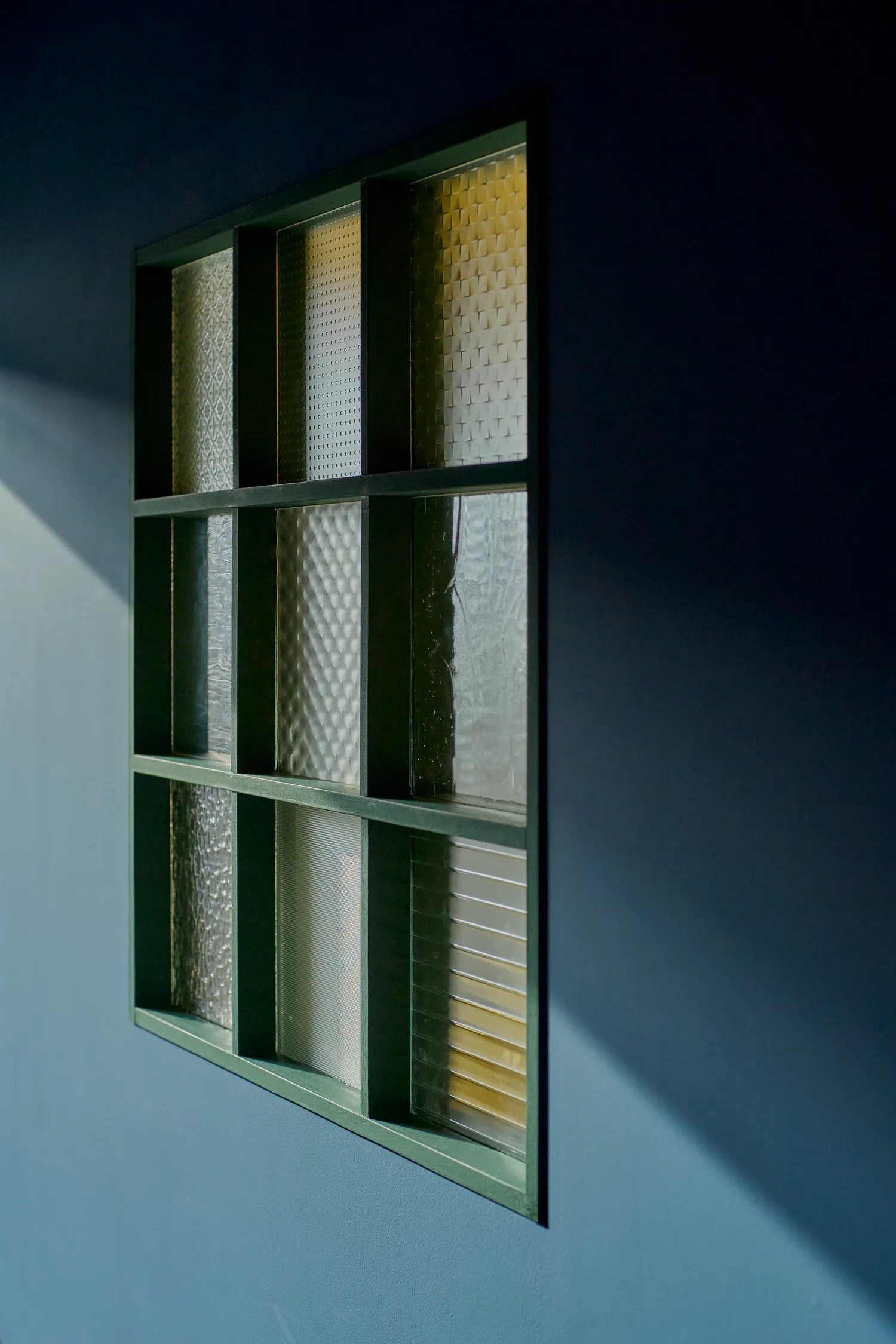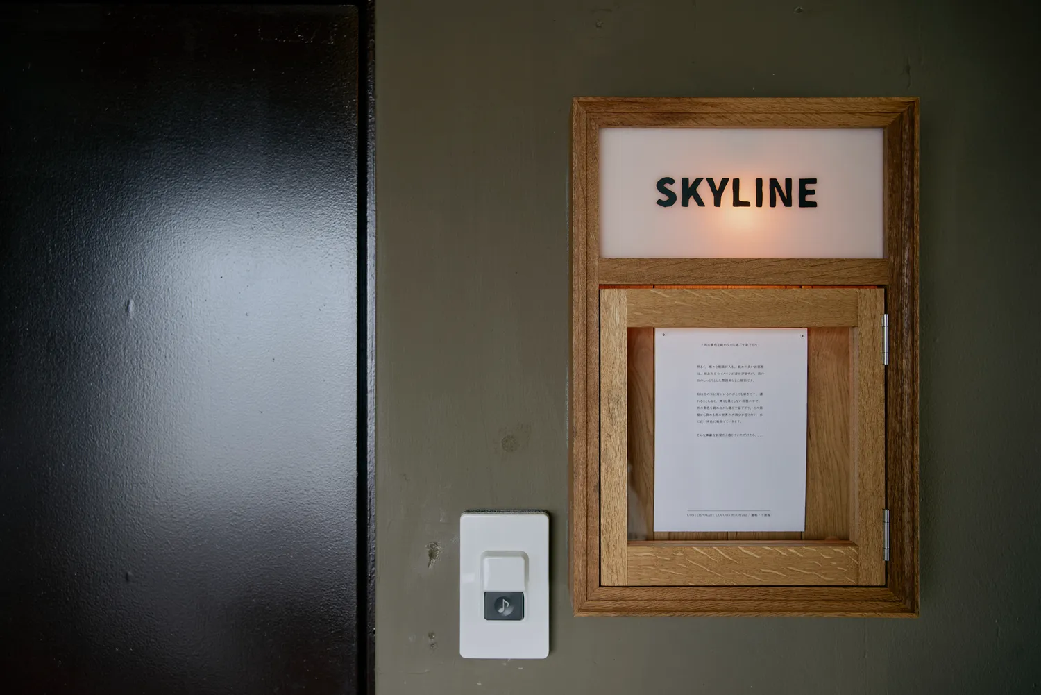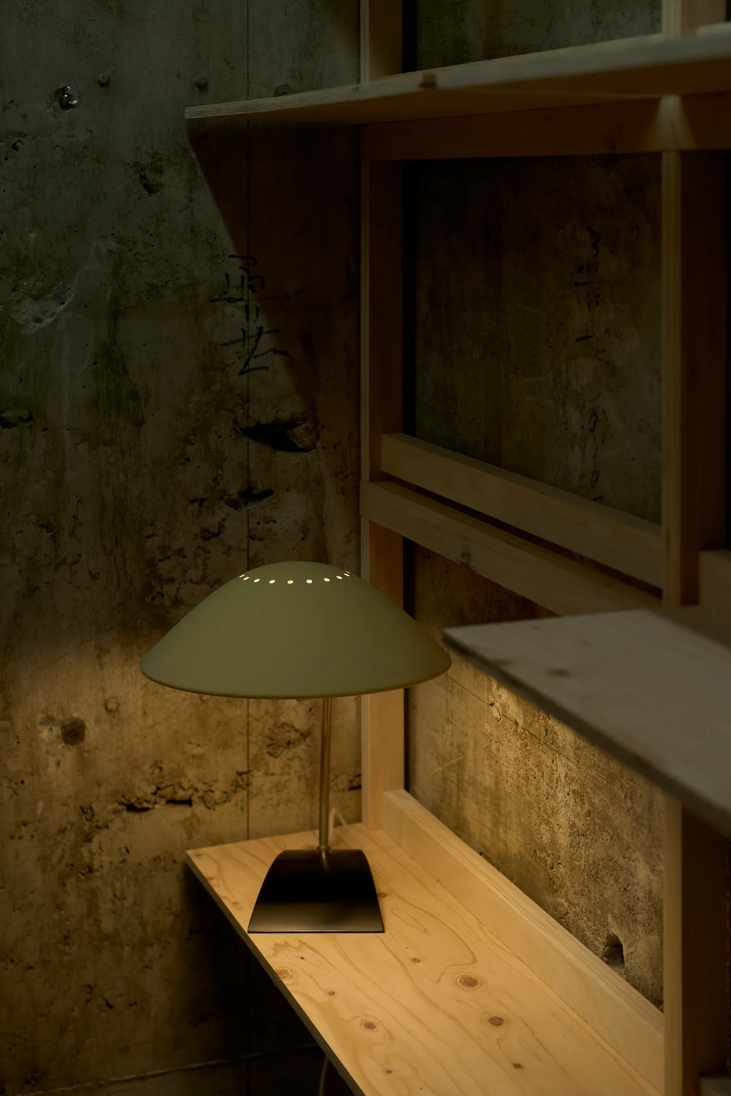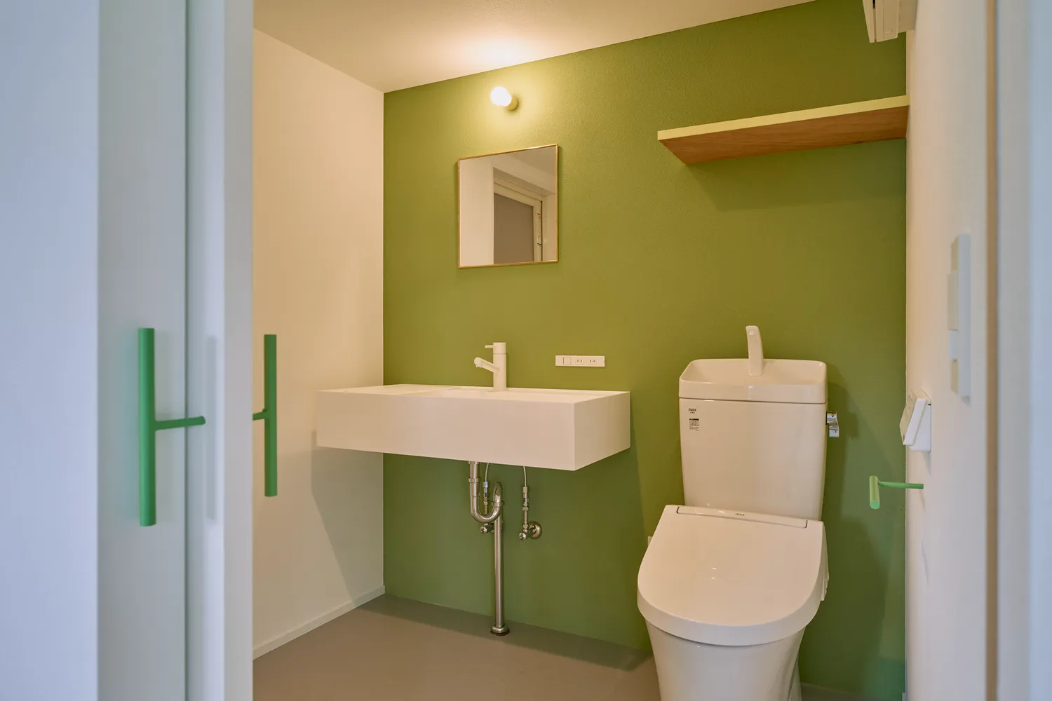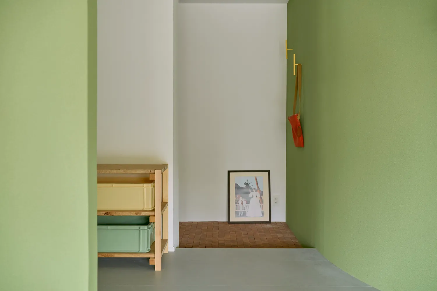 ②既存RC躯体とシルバーとグリーンの板金、ラワン合板と少しの和紙で空間を構成しているが、少し不思議な組み合わせに見えるかもしれない。少量だが、選りすぐった木材を使っている箇所もある。建具はしっかり棲み分けを意識している。存在感を潜めてもらうもの、部屋のアクセントになるもの、光の調整をするもの。バルコニーに面した障子は一見すると白くて分かりにくいが、1枚の建具で障子紙(光が透過)+和紙(光が不透過)の