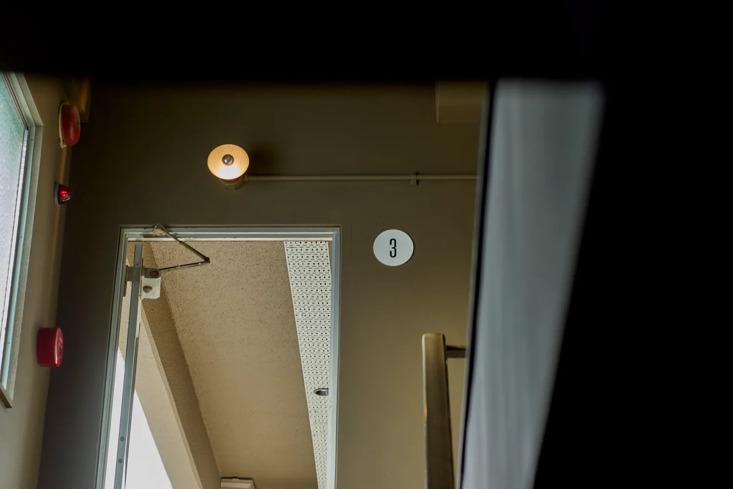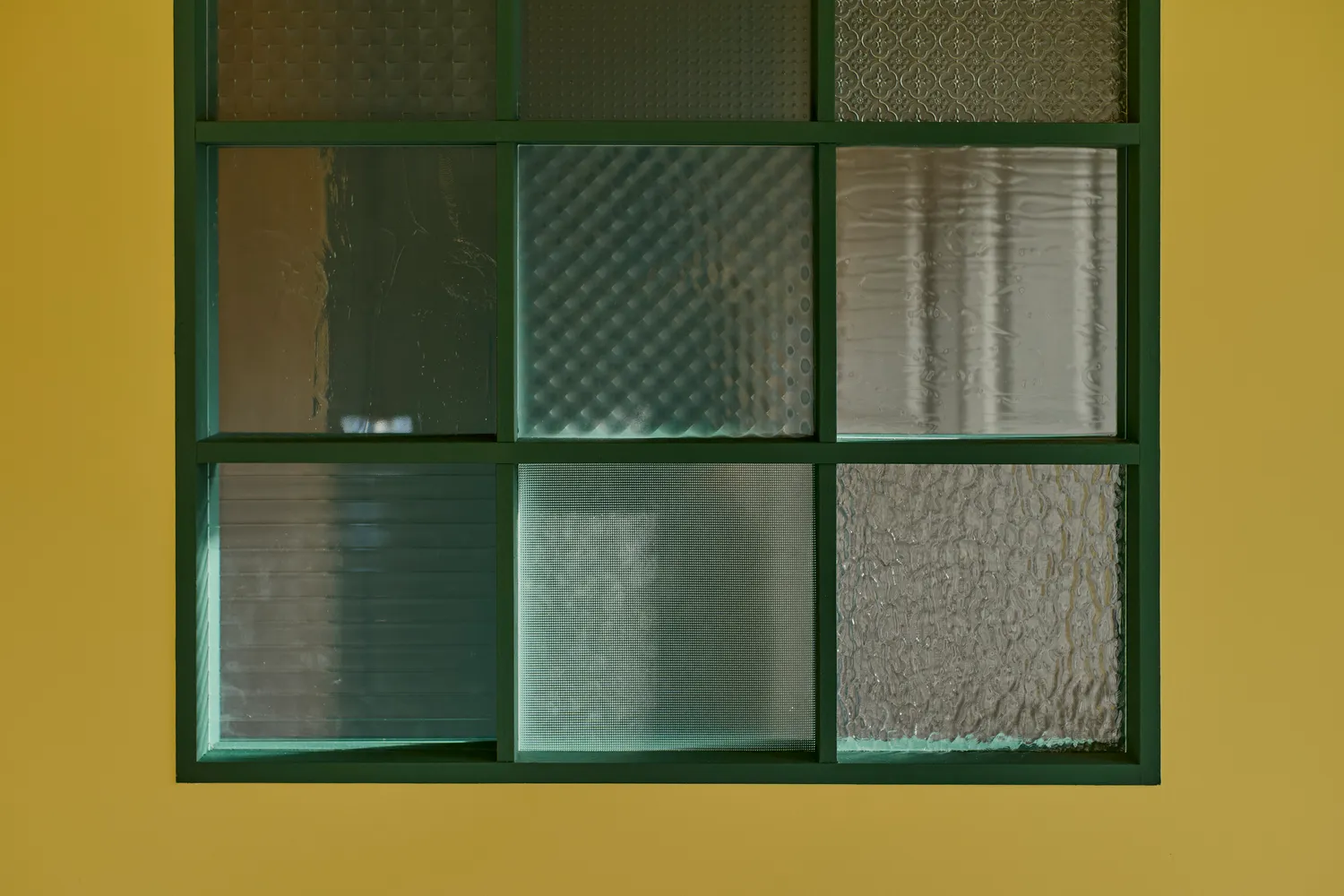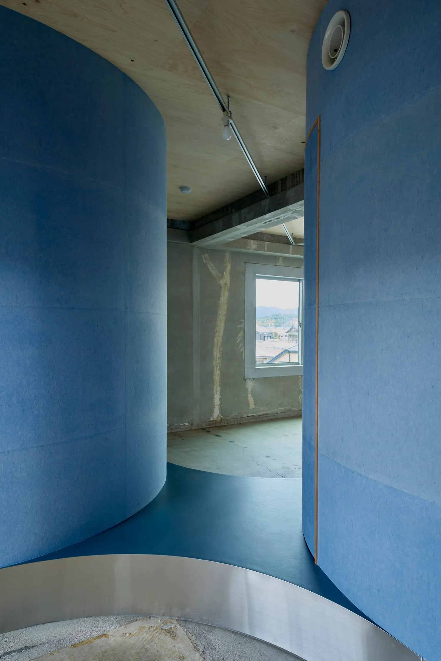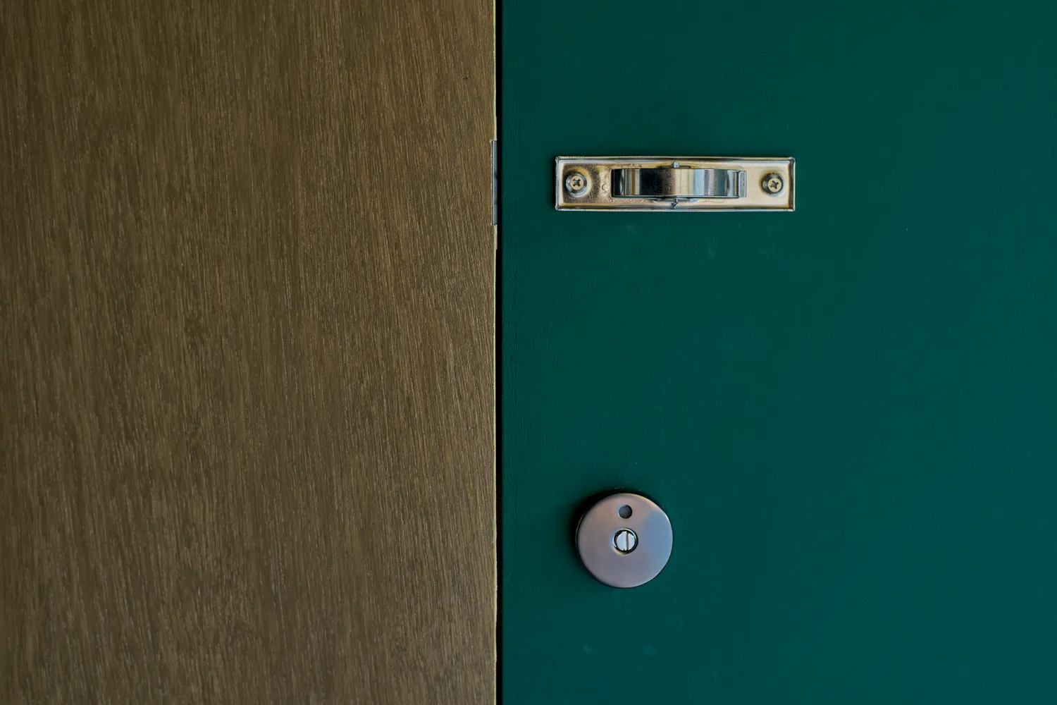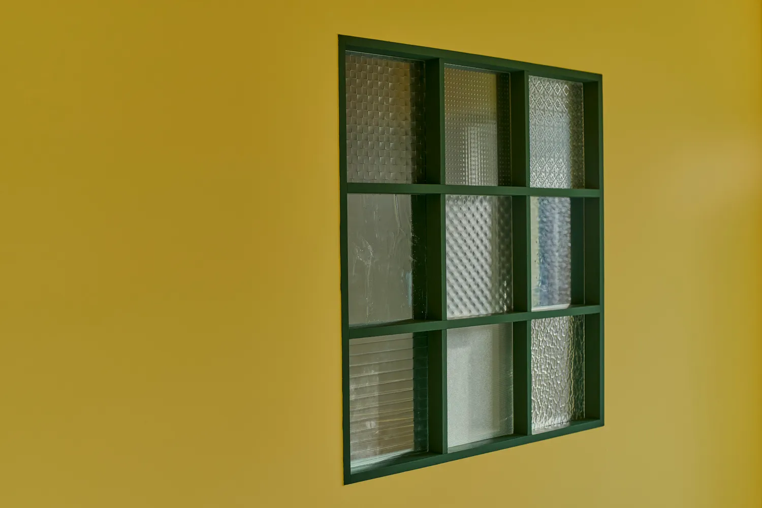 ②既存RC躯体とシルバーとグリーンの板金、ラワン合板と少しの和紙で空間を構成しているが、少し不思議な組み合わせに見えるかもしれない。少量だが、選りすぐった木材を使っている箇所もある。建具はしっかり棲み分けを意識している。存在感を潜めてもらうもの、部屋のアクセントになるもの、光の調整をするもの。バルコニーに面した障子は一見すると白くて分かりにくいが、1枚の建具で障子紙(光が透過)+和紙(光が不透過)の