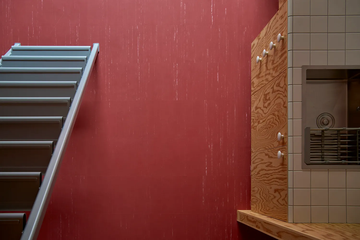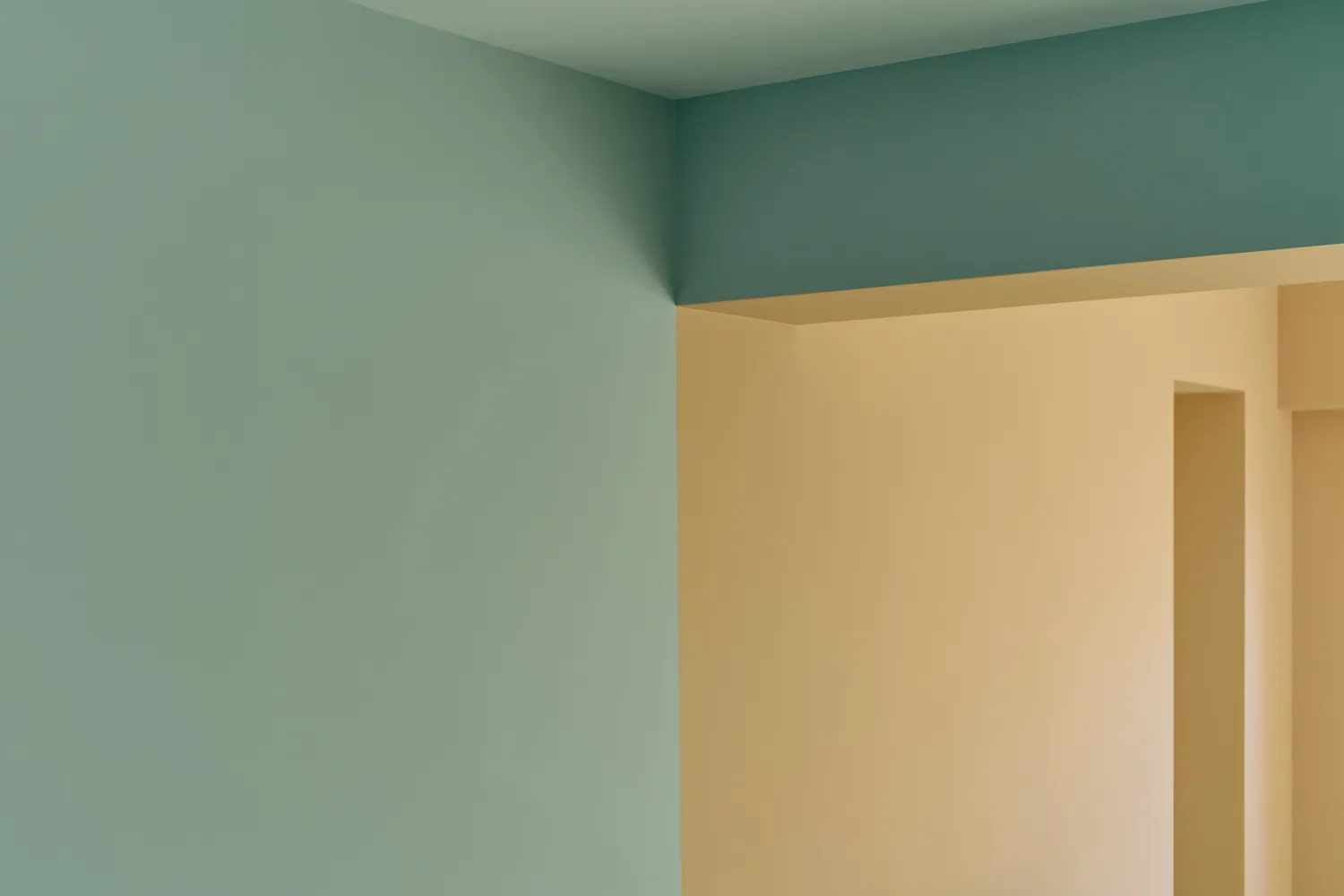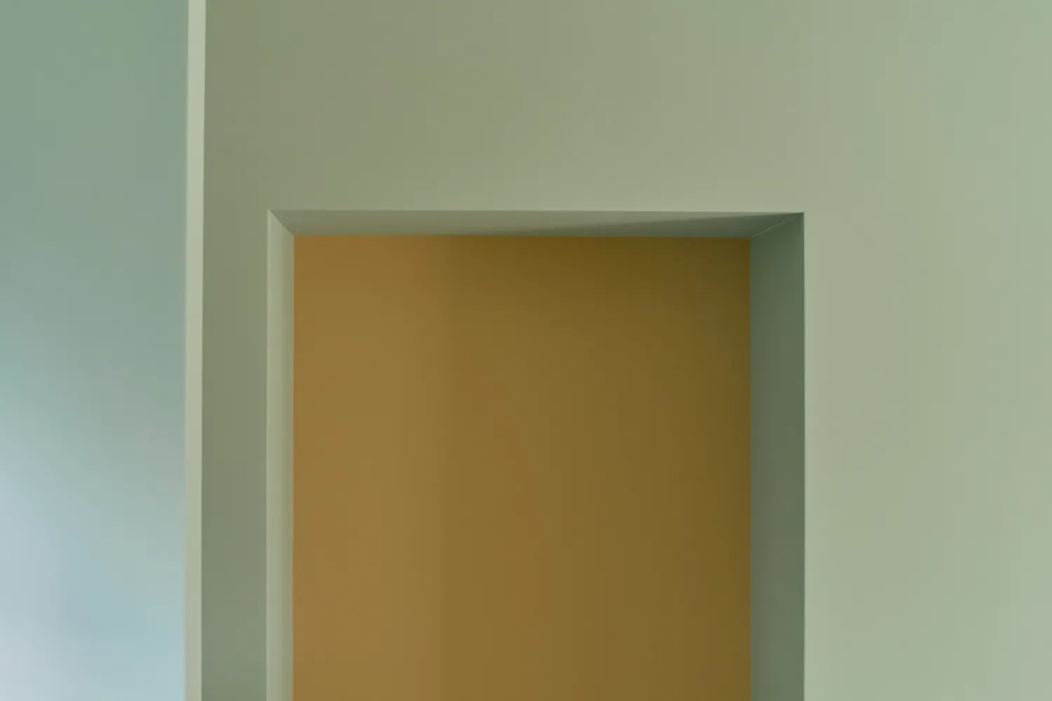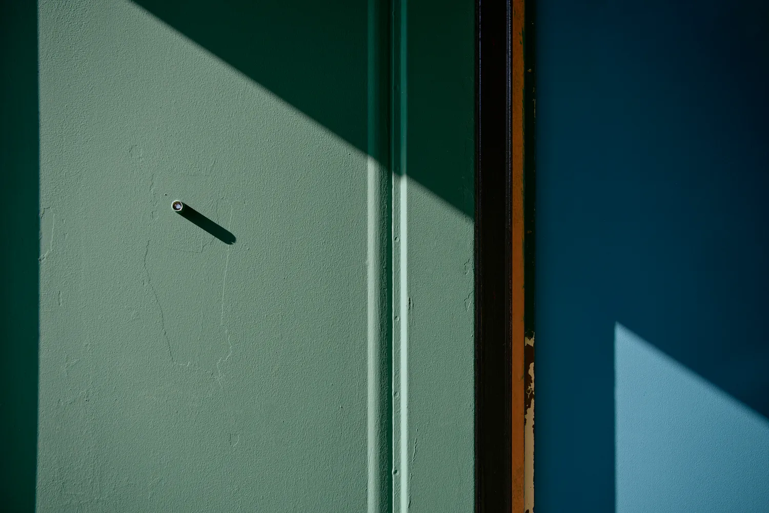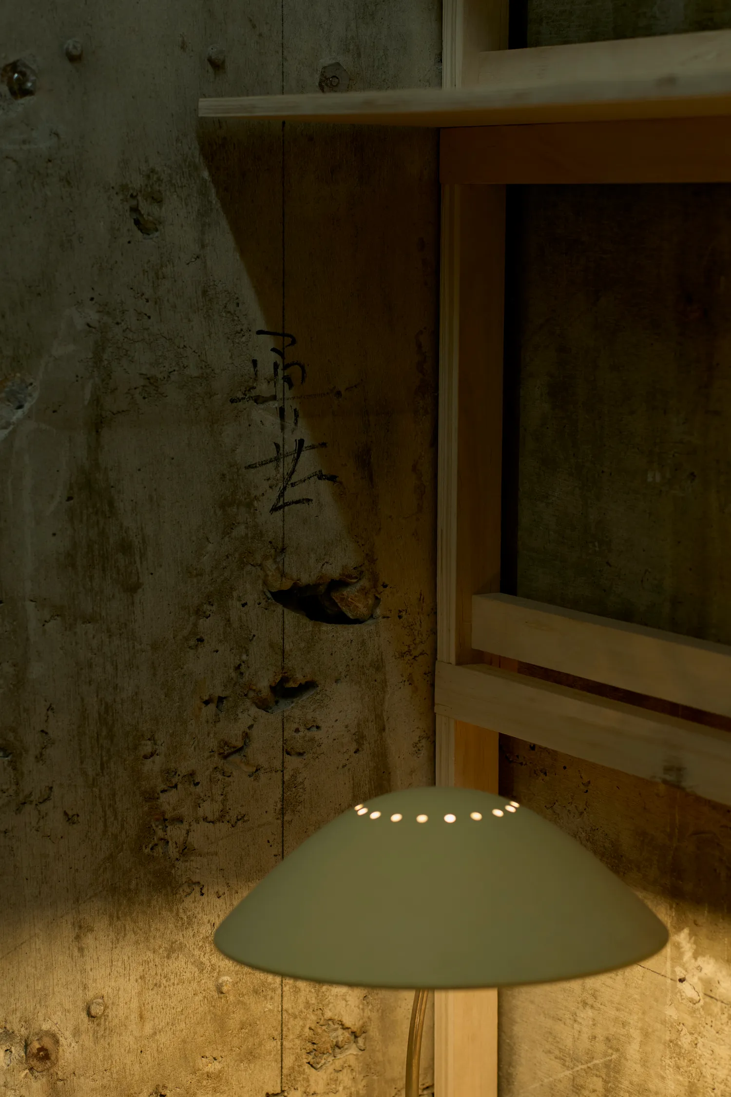 ②既存RC躯体とシルバーとグリーンの板金、ラワン合板と少しの和紙で空間を構成しているが、少し不思議な組み合わせに見えるかもしれない。少量だが、選りすぐった木材を使っている箇所もある。建具はしっかり棲み分けを意識している。存在感を潜めてもらうもの、部屋のアクセントになるもの、光の調整をするもの。バルコニーに面した障子は一見すると白くて分かりにくいが、1枚の建具で障子紙(光が透過)+和紙(光が不透過)の