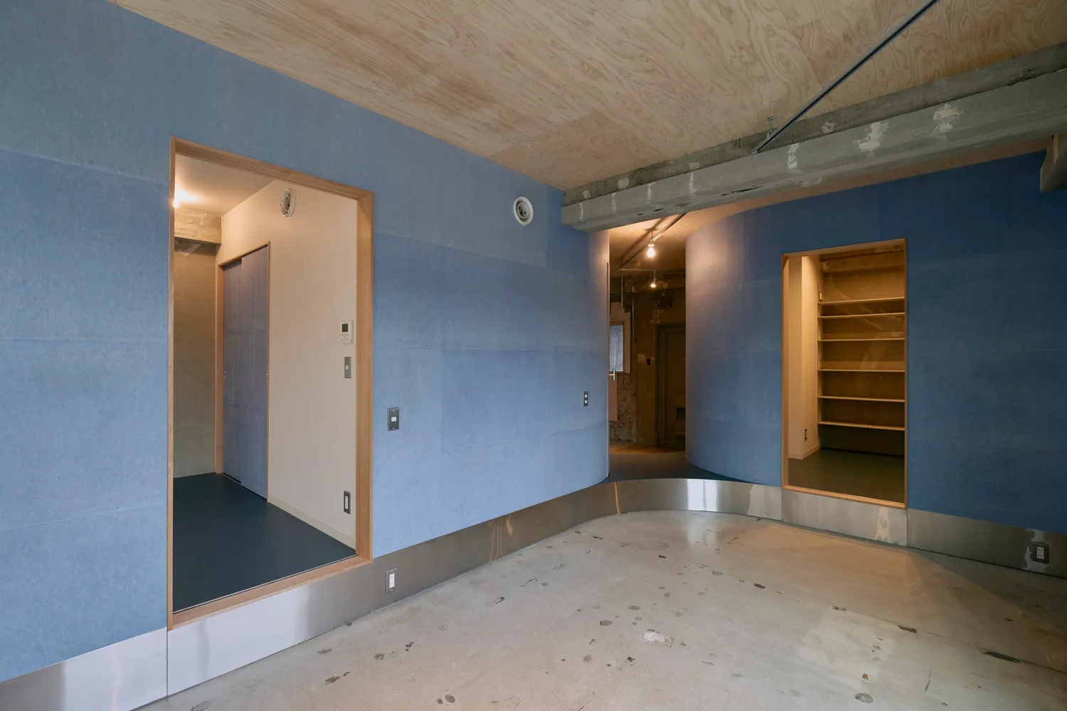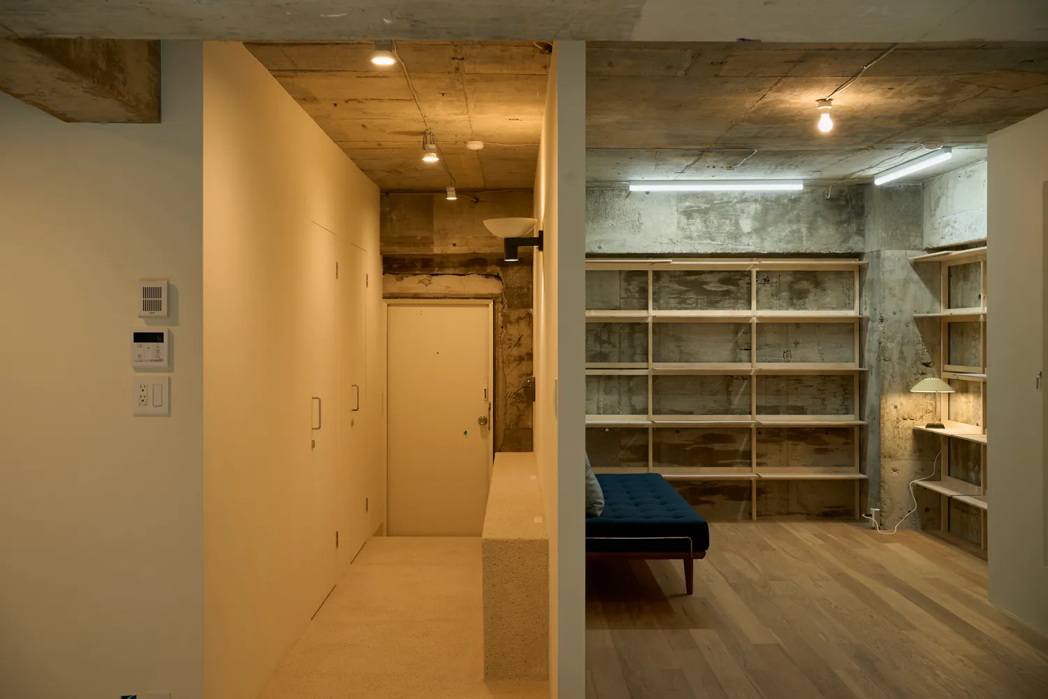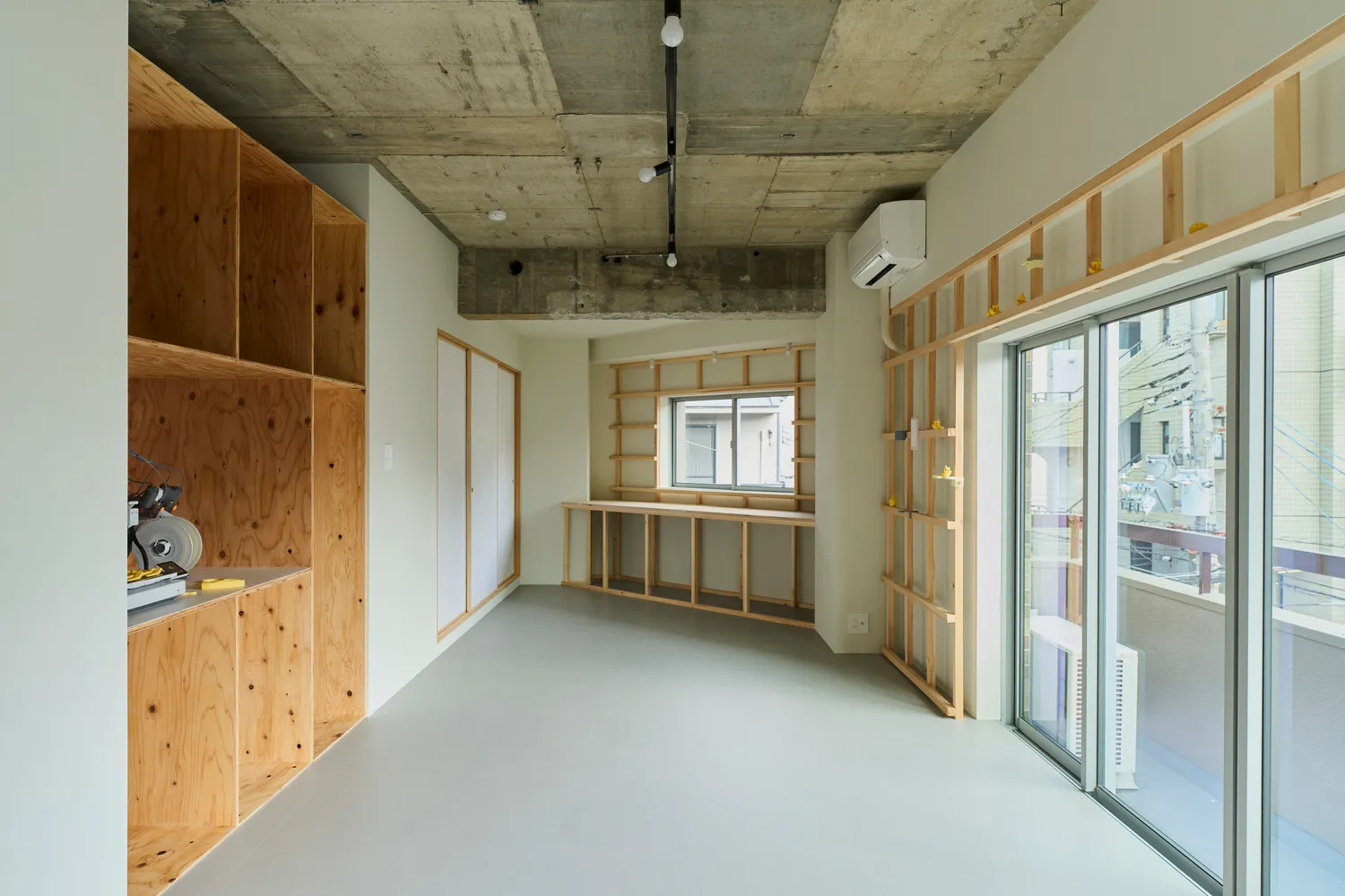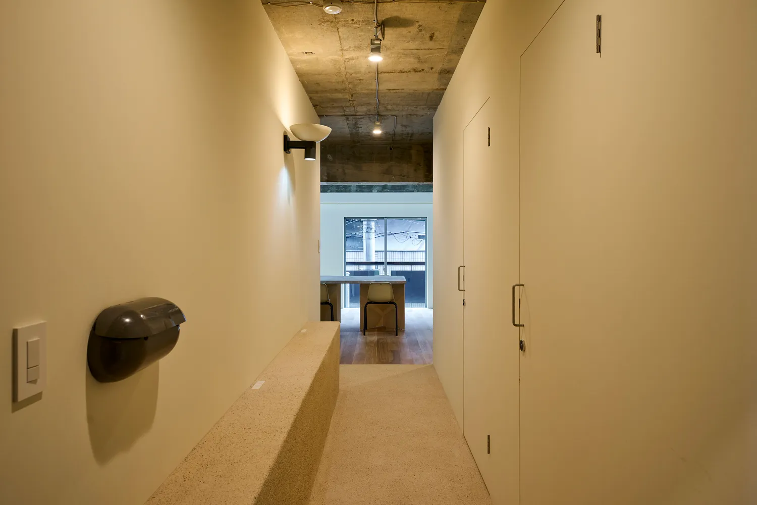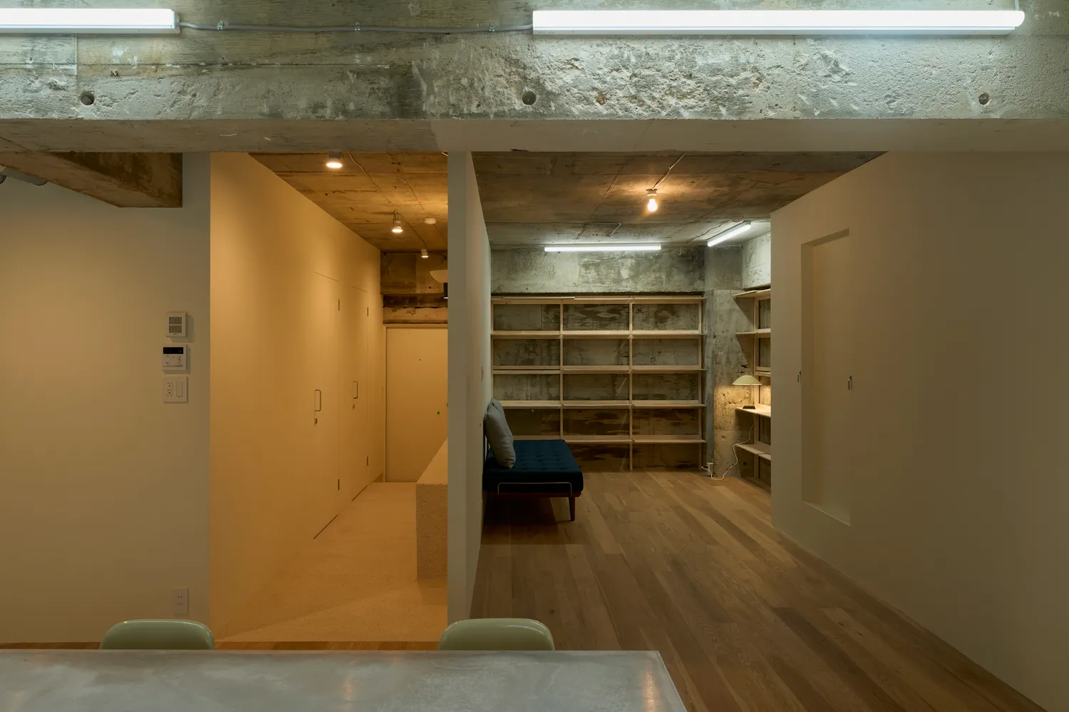 オフィスやアトリエ使いを想定したSOHOタイプ。住居用マンションを自宅兼事務所として使っていた経験からすると、生活感が全面にでると、打合せなどで人を招くこともしにくく、良くも悪くも仕事と生活の境界も曖昧になり、オンオフが薄れる。漠然と受け入れてしまうような事かもしれないが、この部屋ではそれに抗う計画とした。