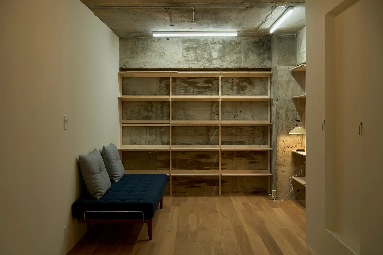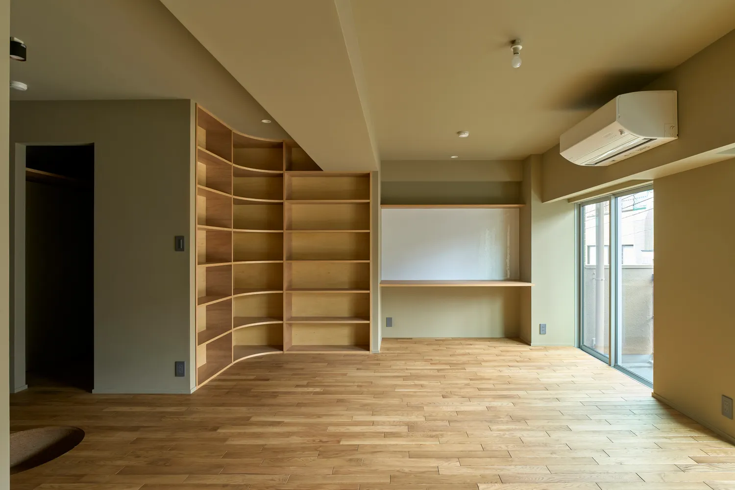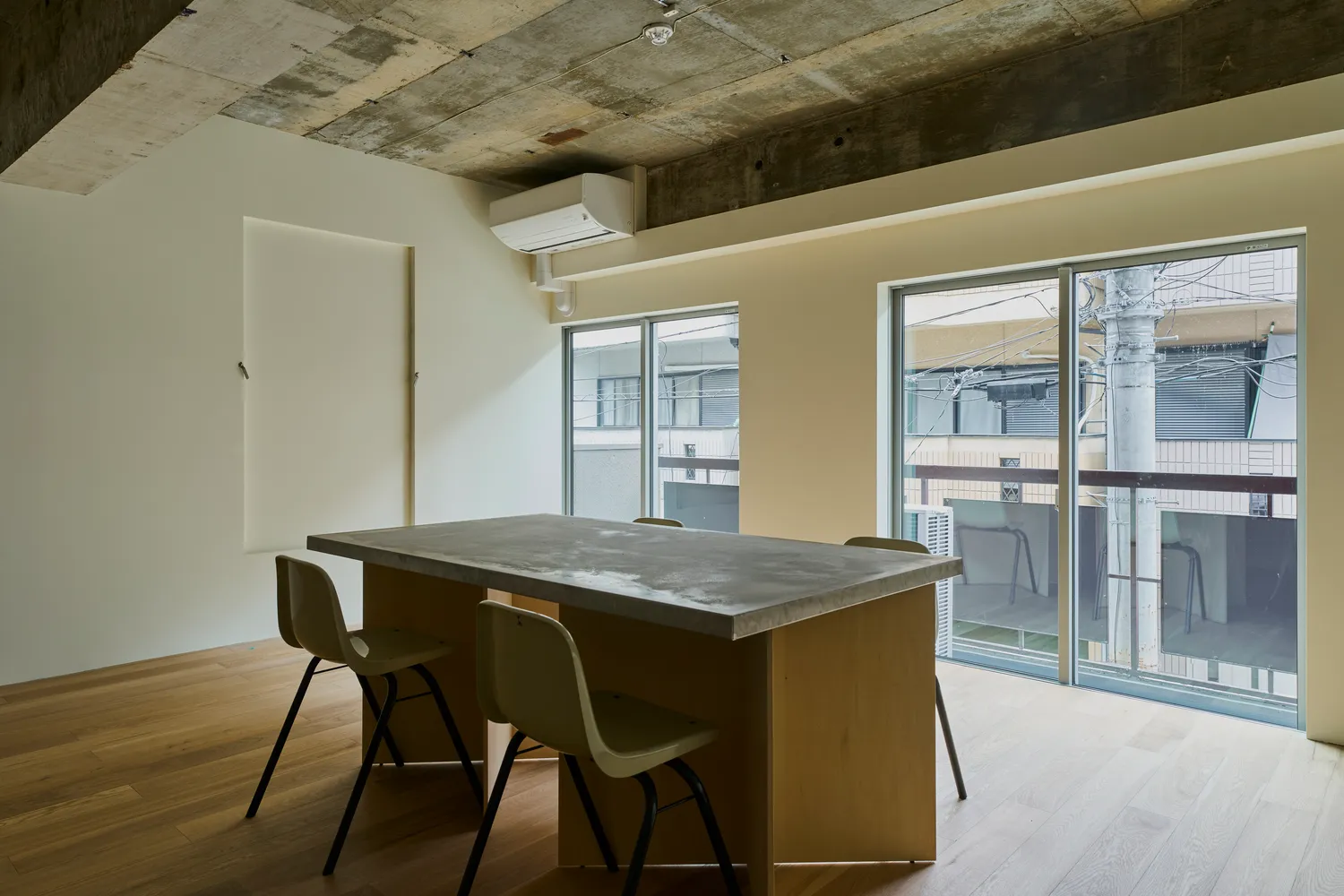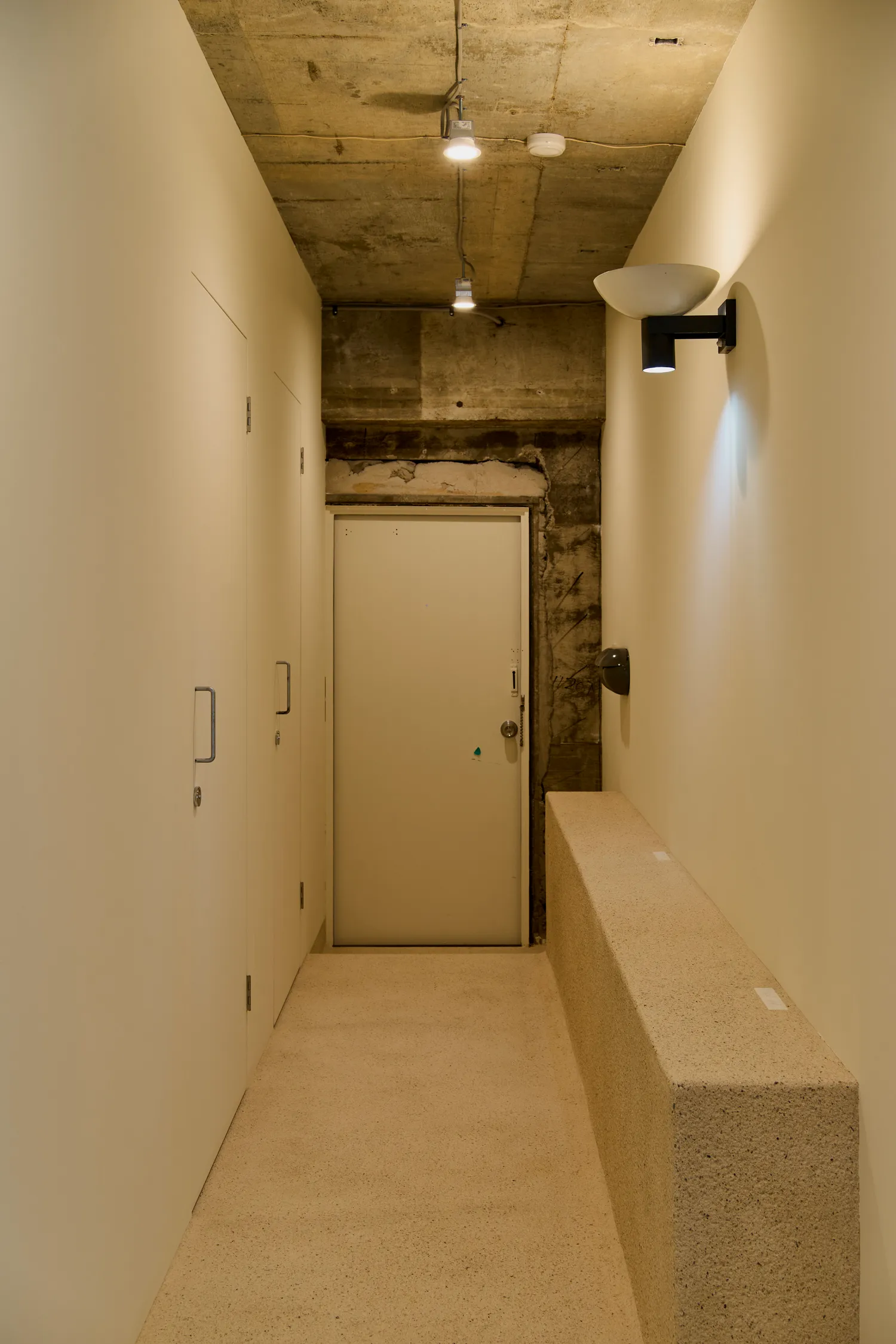 オフィスやアトリエ使いを想定したSOHOタイプ。住居用マンションを自宅兼事務所として使っていた経験からすると、生活感が全面にでると、打合せなどで人を招くこともしにくく、良くも悪くも仕事と生活の境界も曖昧になり、オンオフが薄れる。漠然と受け入れてしまうような事かもしれないが、この部屋ではそれに抗う計画とした。