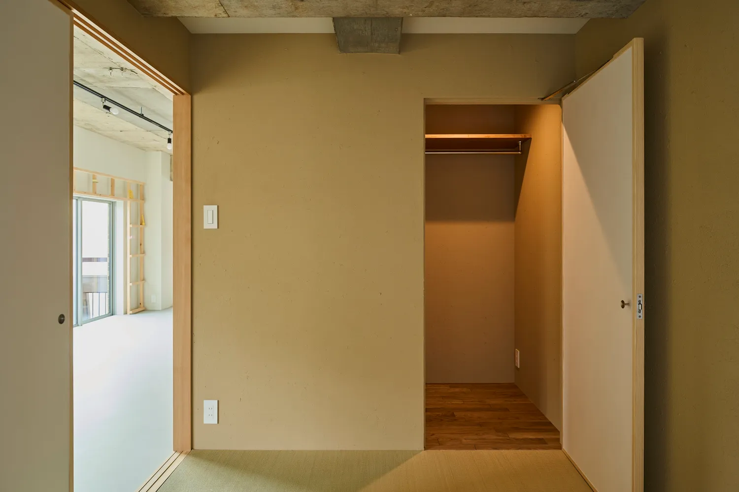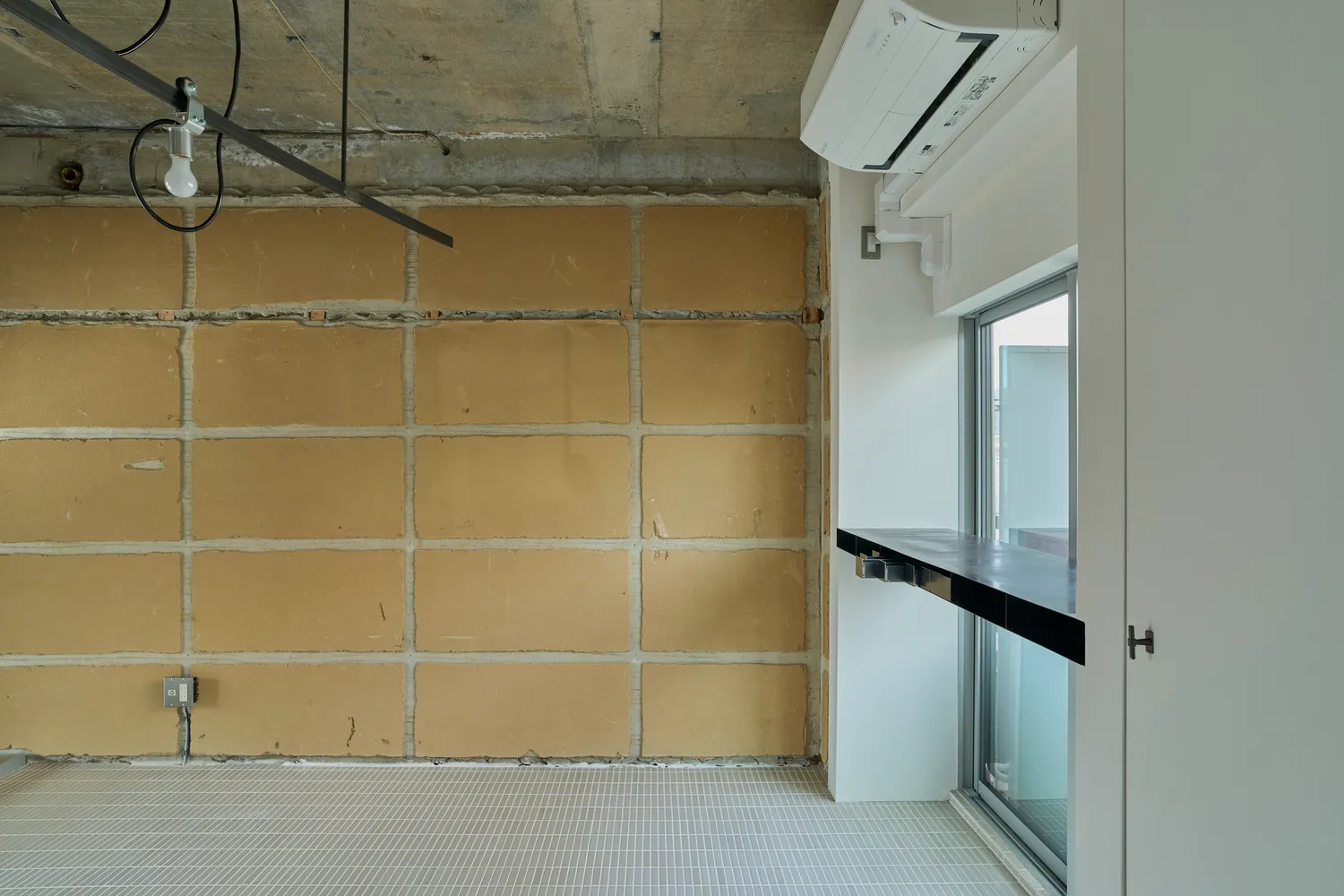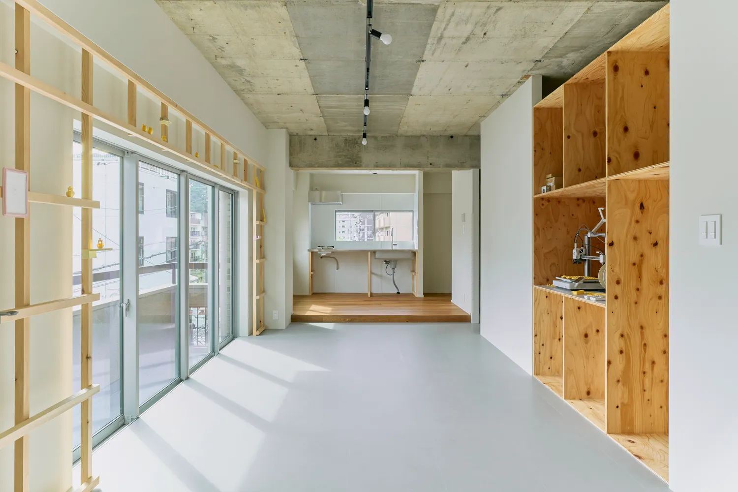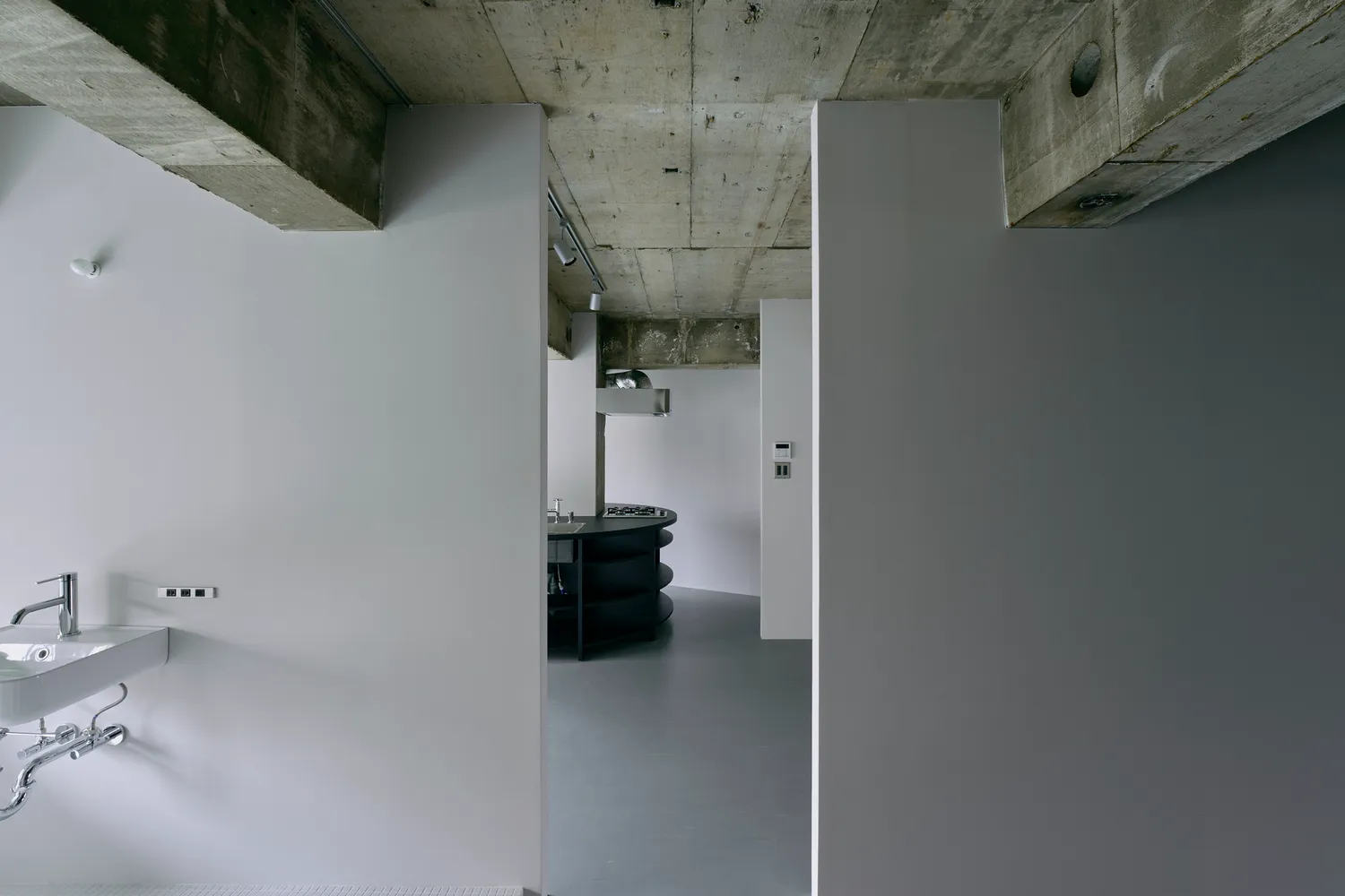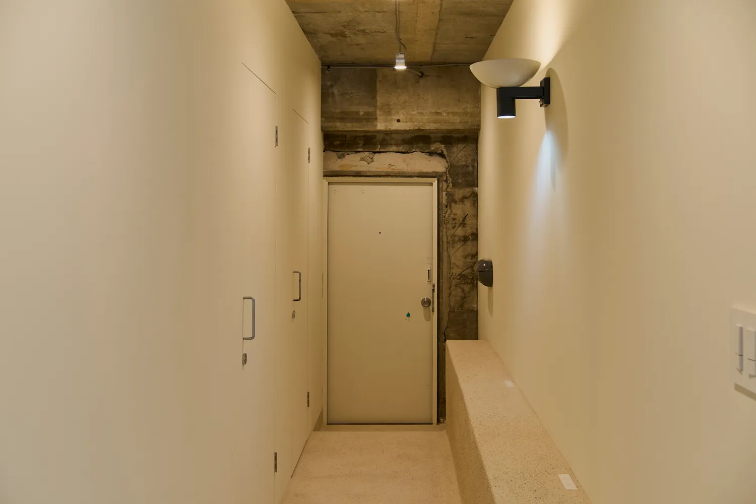 オフィスやアトリエ使いを想定したSOHOタイプ。住居用マンションを自宅兼事務所として使っていた経験からすると、生活感が全面にでると、打合せなどで人を招くこともしにくく、良くも悪くも仕事と生活の境界も曖昧になり、オンオフが薄れる。漠然と受け入れてしまうような事かもしれないが、この部屋ではそれに抗う計画とした。
