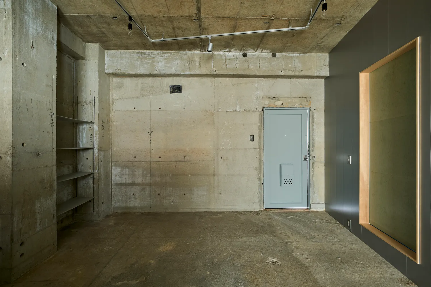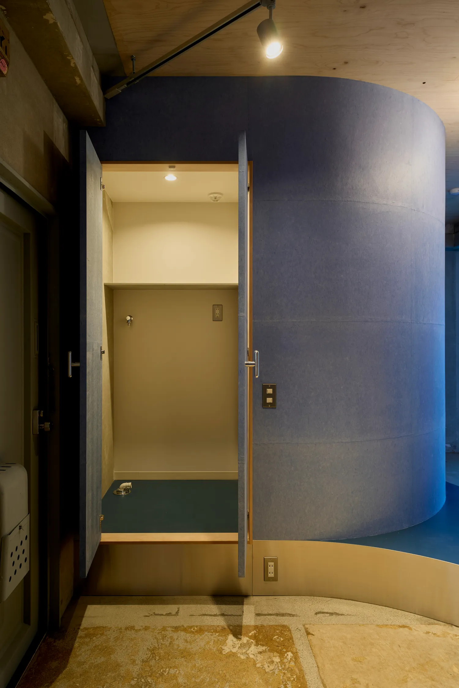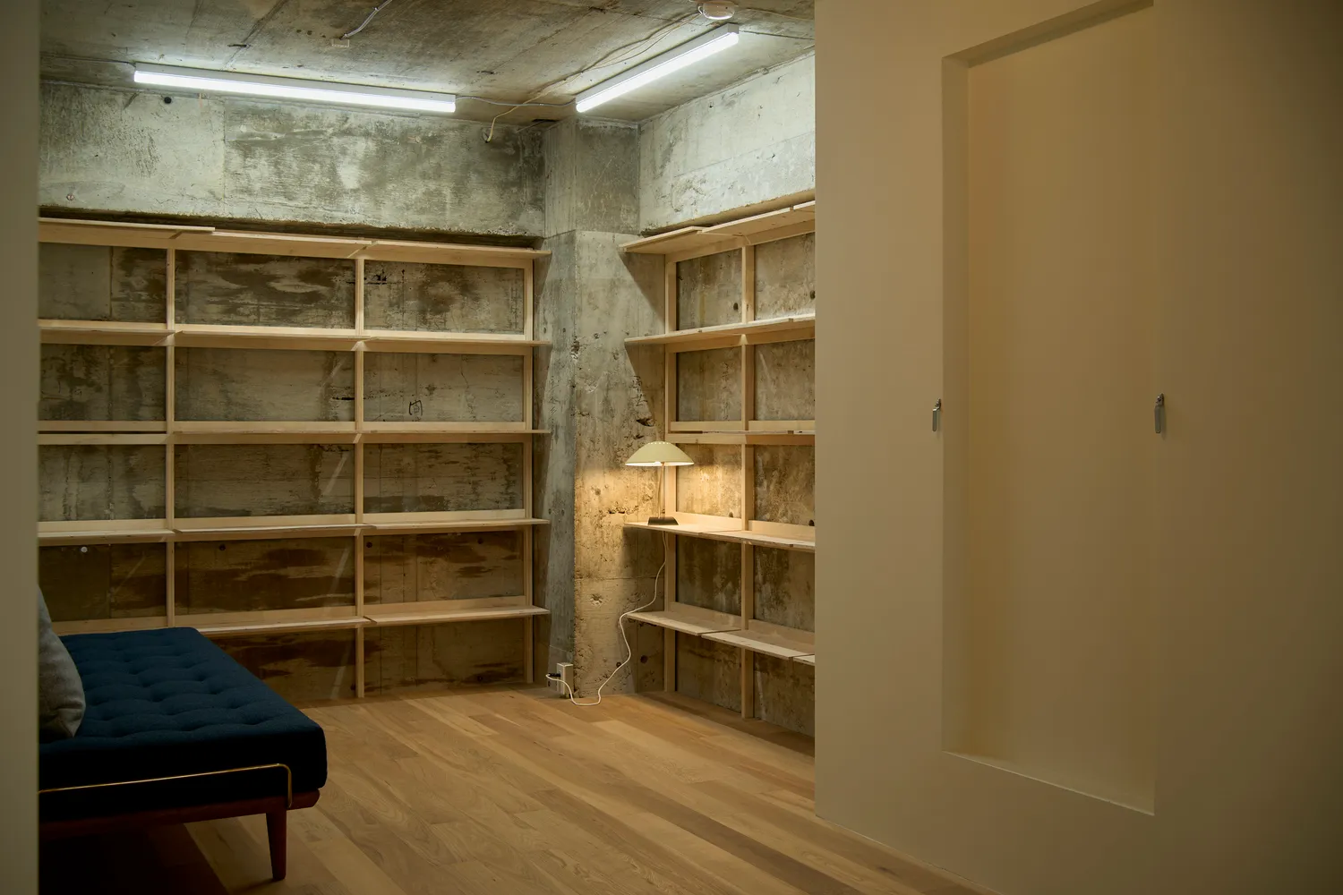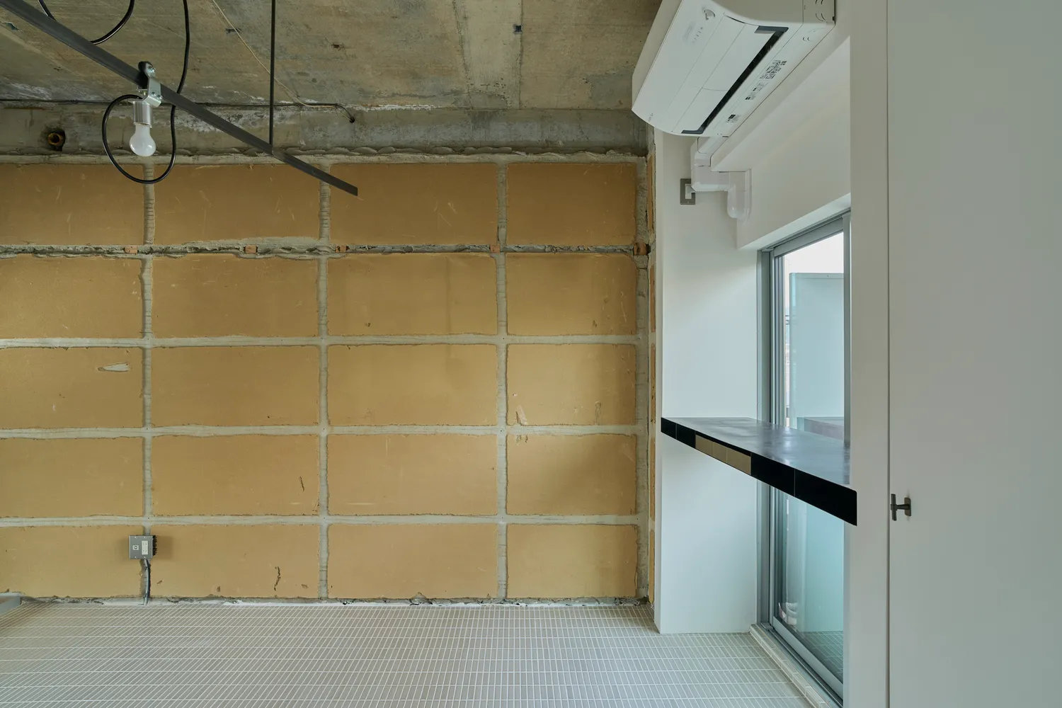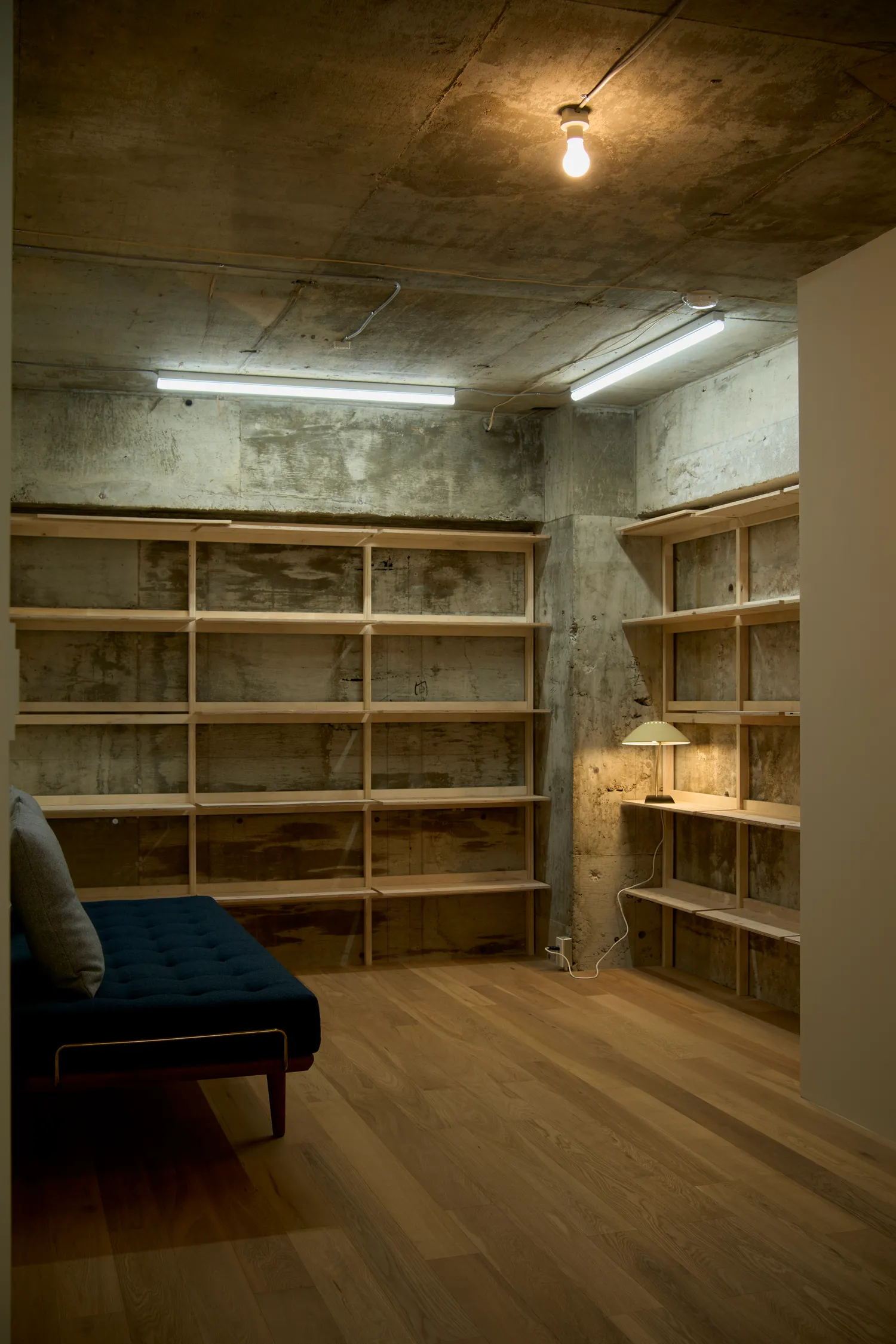 オフィスやアトリエ使いを想定したSOHOタイプ。住居用マンションを自宅兼事務所として使っていた経験からすると、生活感が全面にでると、打合せなどで人を招くこともしにくく、良くも悪くも仕事と生活の境界も曖昧になり、オンオフが薄れる。漠然と受け入れてしまうような事かもしれないが、この部屋ではそれに抗う計画とした。