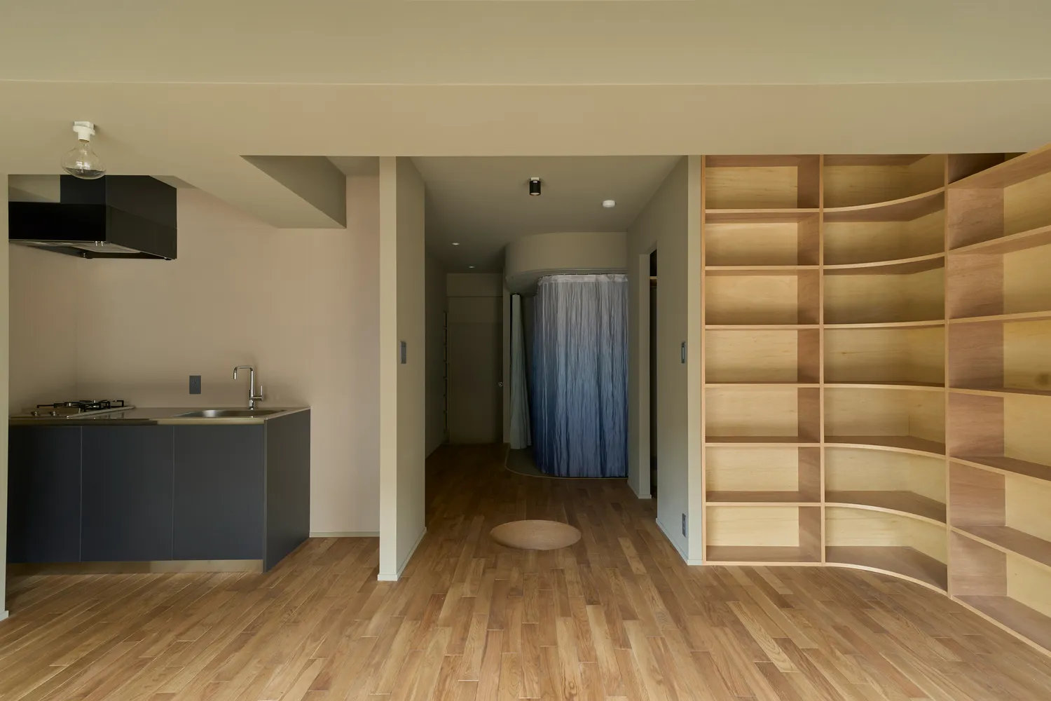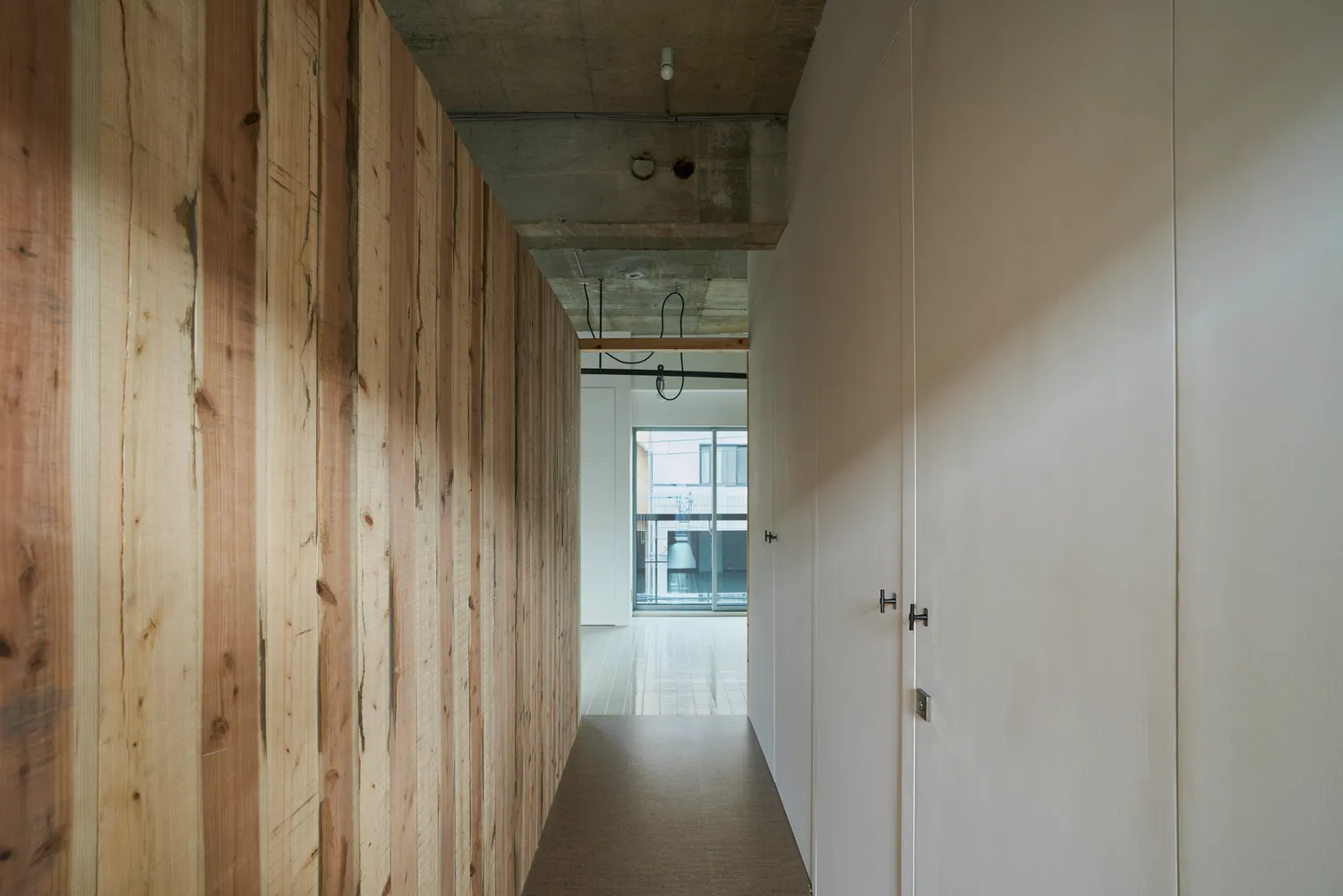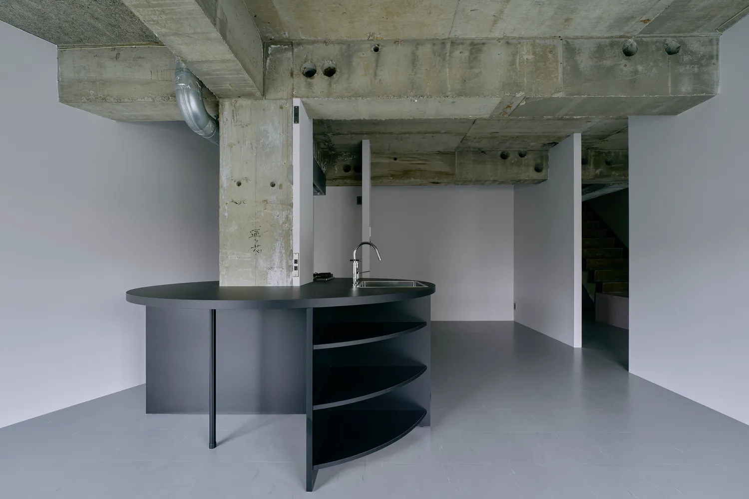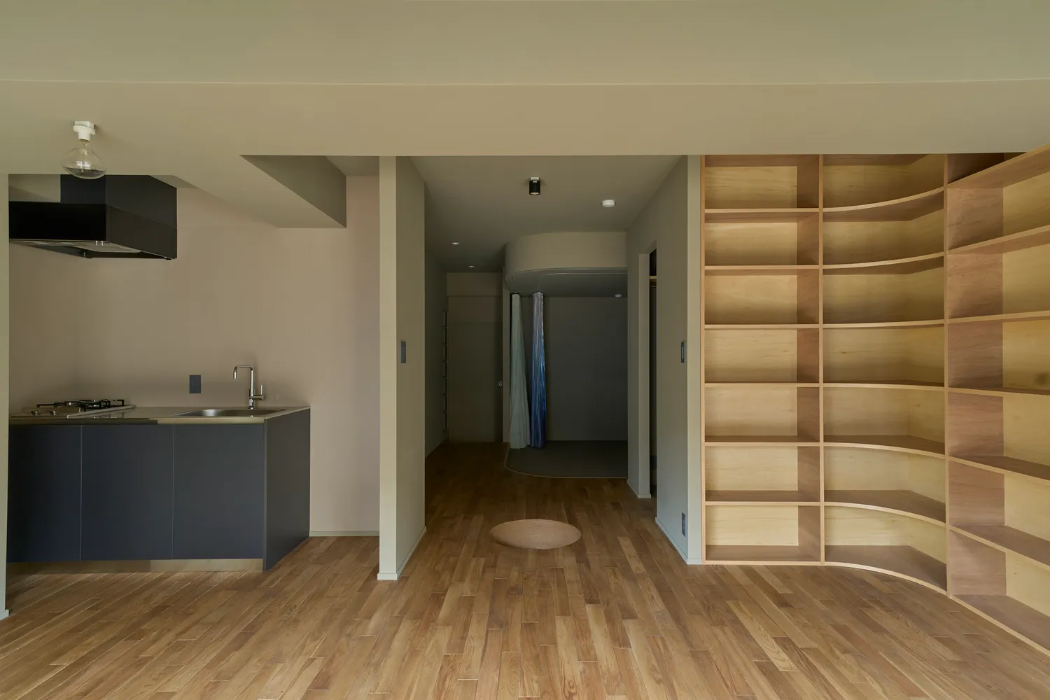 オフィスやアトリエ使いを想定したSOHOタイプ。住居用マンションを自宅兼事務所として使っていた経験からすると、生活感が全面にでると、打合せなどで人を招くこともしにくく、良くも悪くも仕事と生活の境界も曖昧になり、オンオフが薄れる。漠然と受け入れてしまうような事かもしれないが、この部屋ではそれに抗う計画とした。
