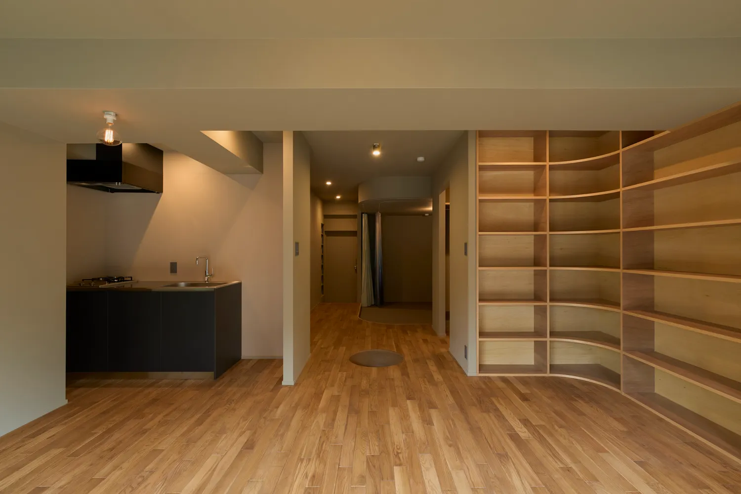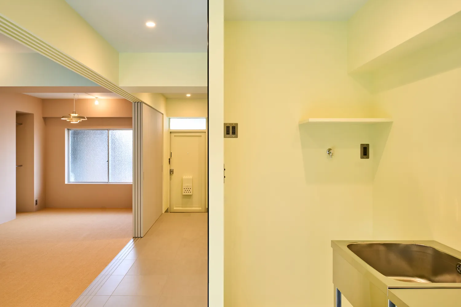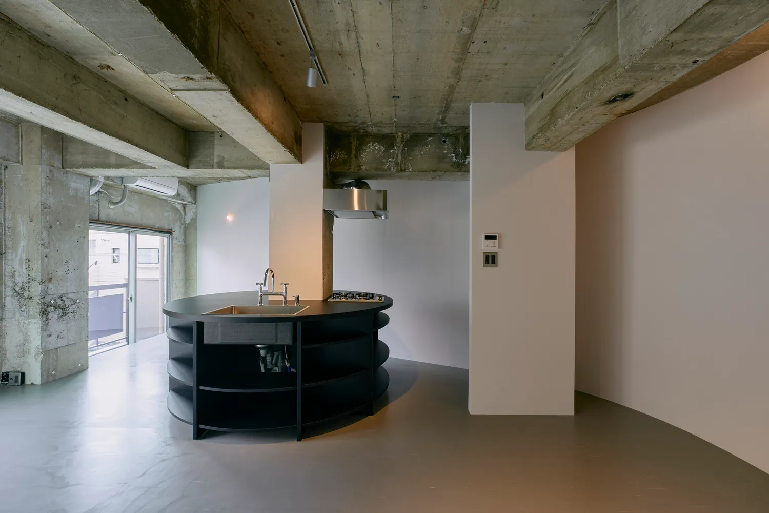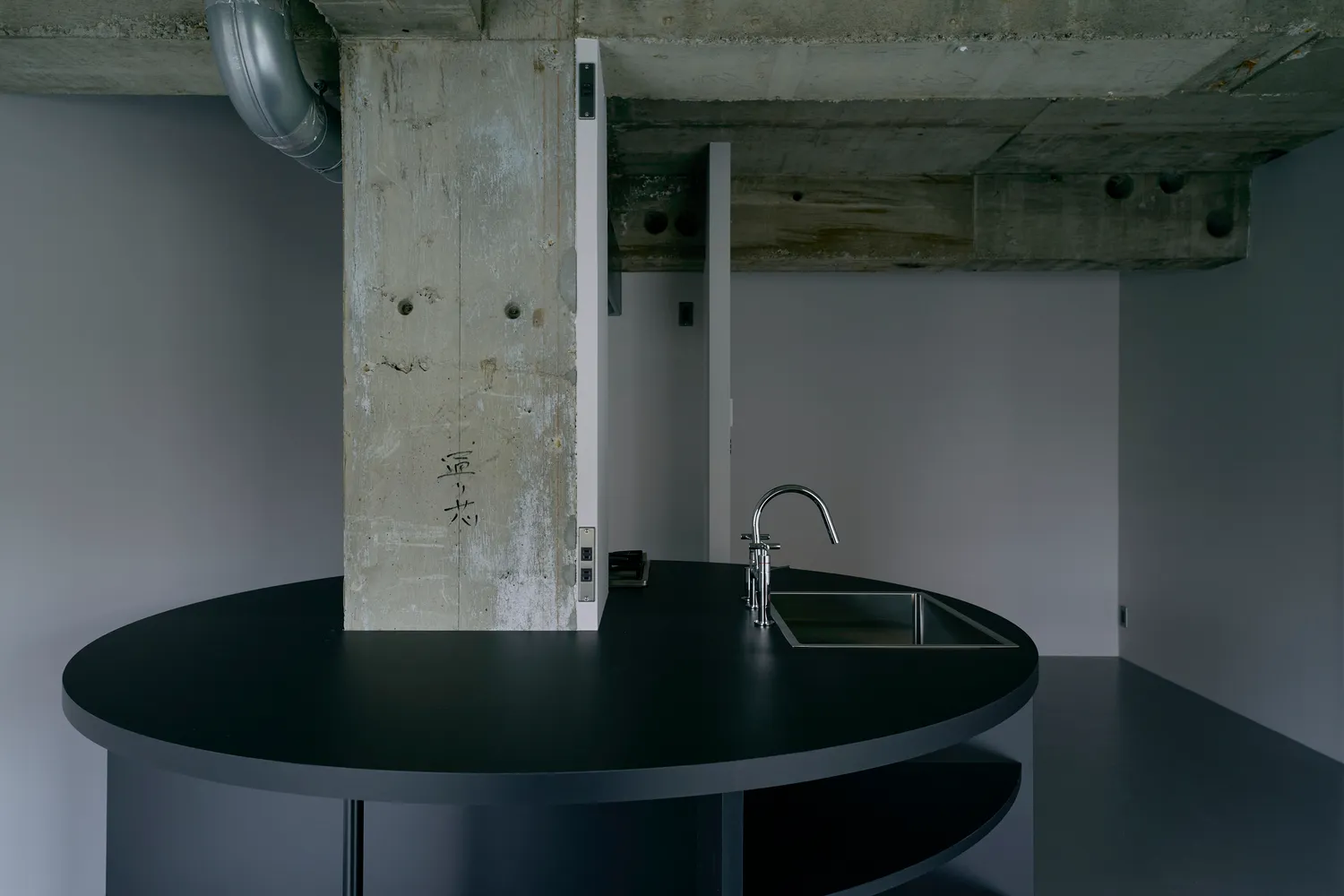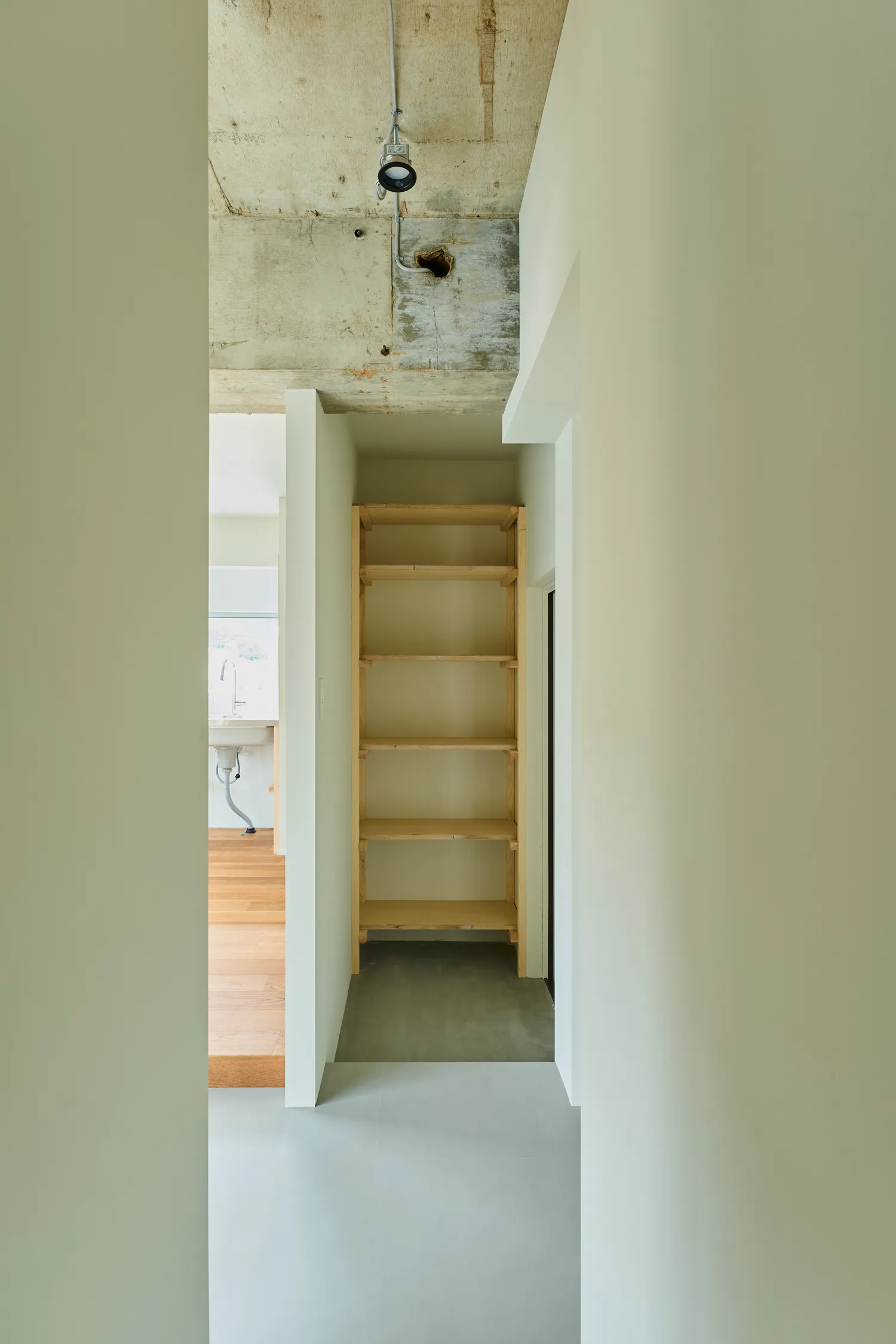 オフィスやアトリエ使いを想定したSOHOタイプ。住居用マンションを自宅兼事務所として使っていた経験からすると、生活感が全面にでると、打合せなどで人を招くこともしにくく、良くも悪くも仕事と生活の境界も曖昧になり、オンオフが薄れる。漠然と受け入れてしまうような事かもしれないが、この部屋ではそれに抗う計画とした。