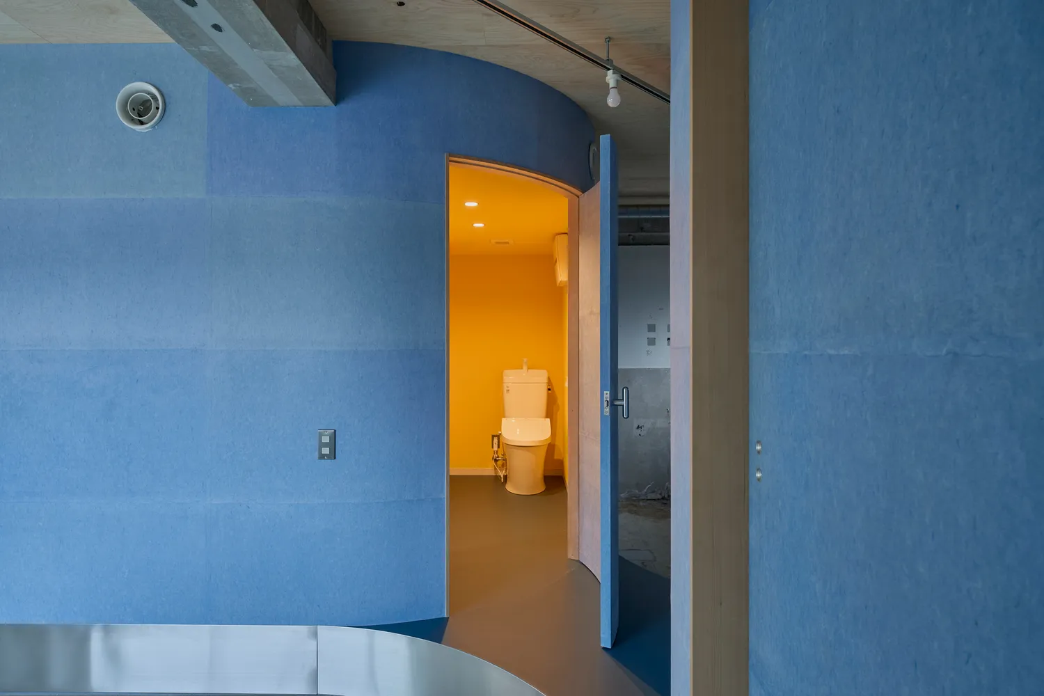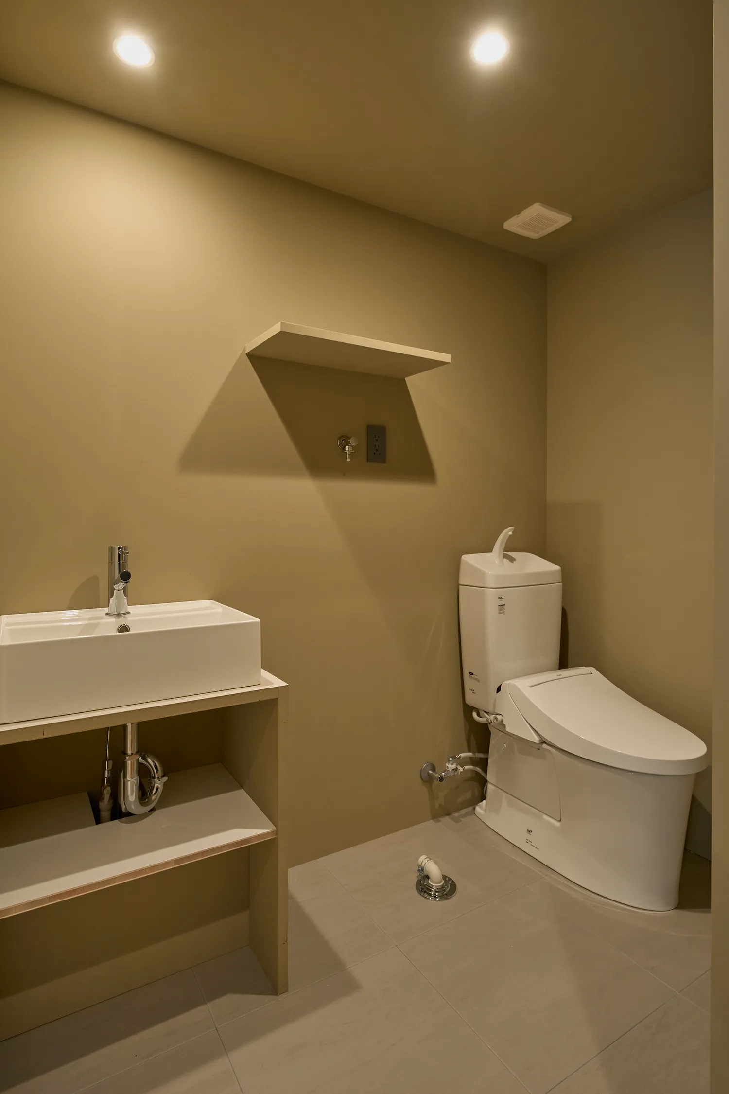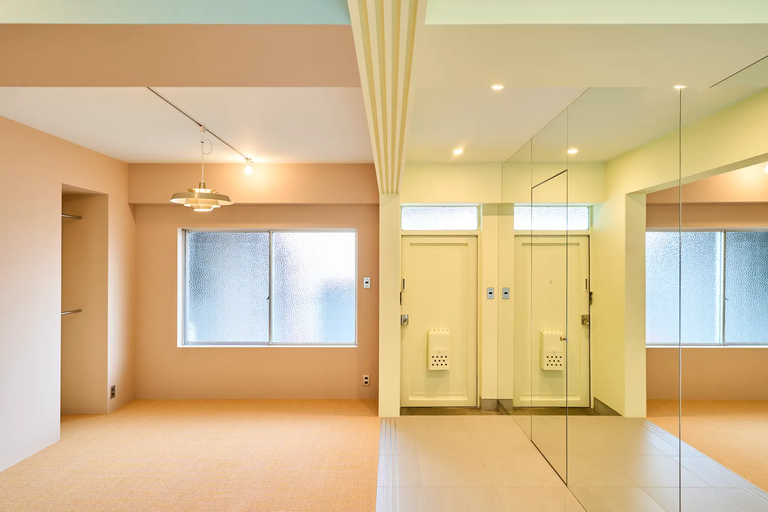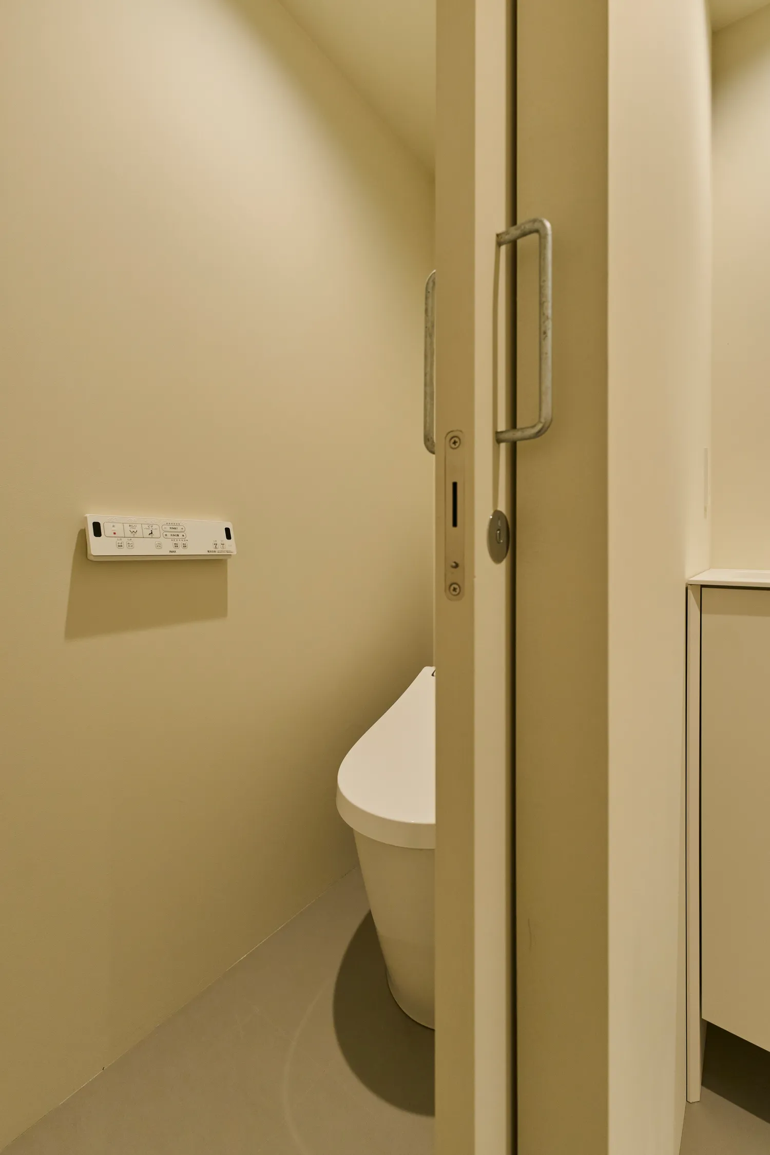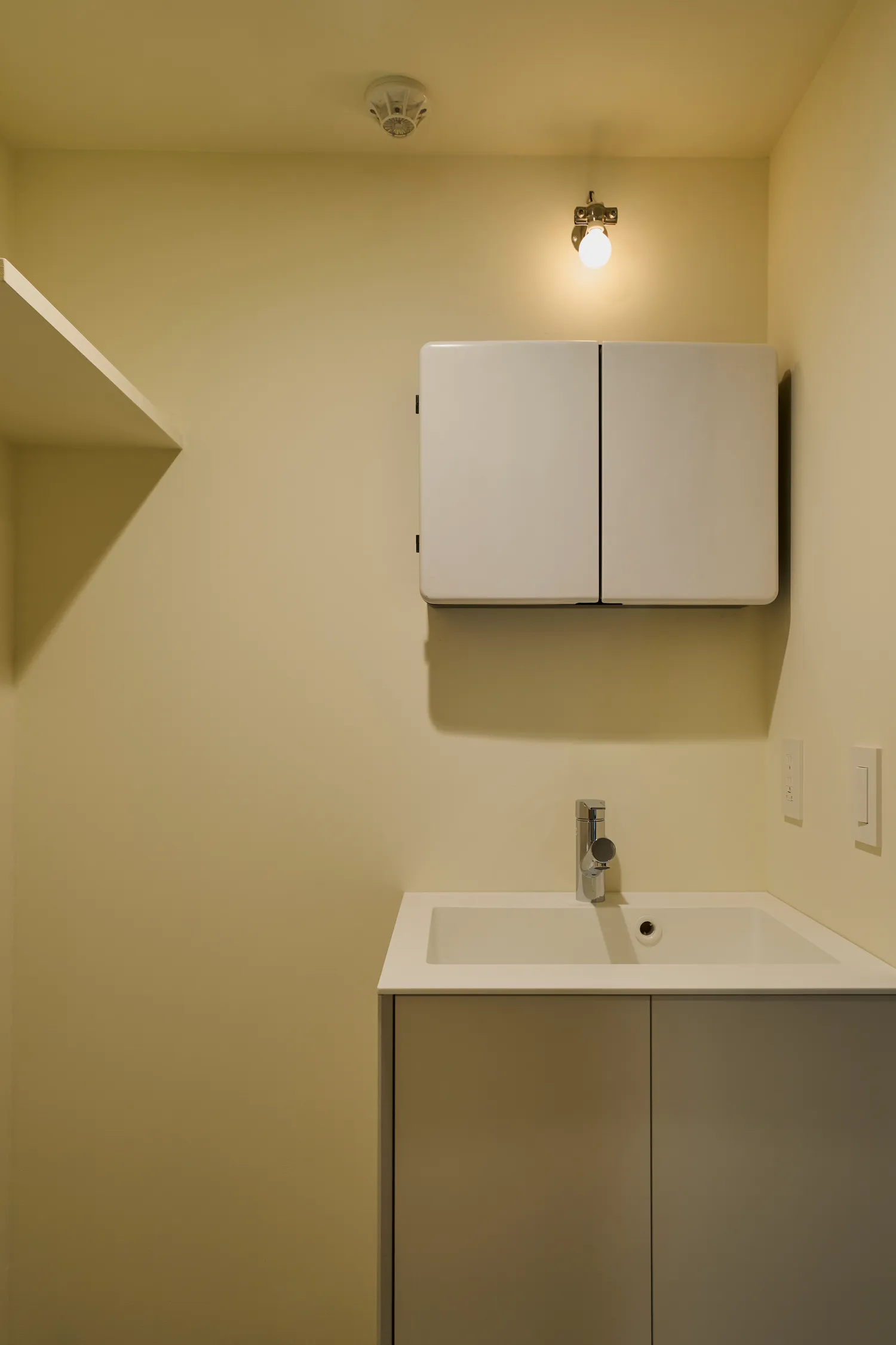 オフィスやアトリエ使いを想定したSOHOタイプ。住居用マンションを自宅兼事務所として使っていた経験からすると、生活感が全面にでると、打合せなどで人を招くこともしにくく、良くも悪くも仕事と生活の境界も曖昧になり、オンオフが薄れる。漠然と受け入れてしまうような事かもしれないが、この部屋ではそれに抗う計画とした。