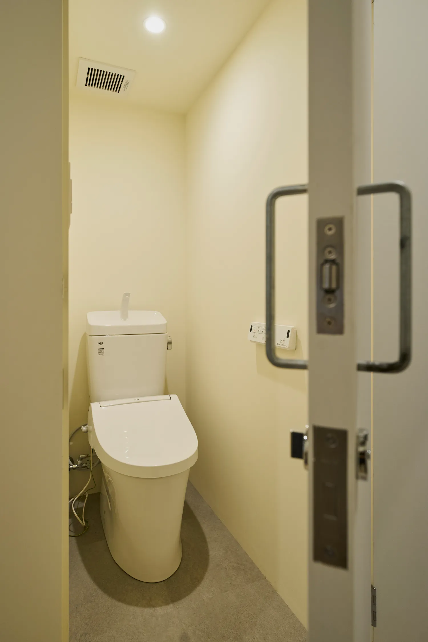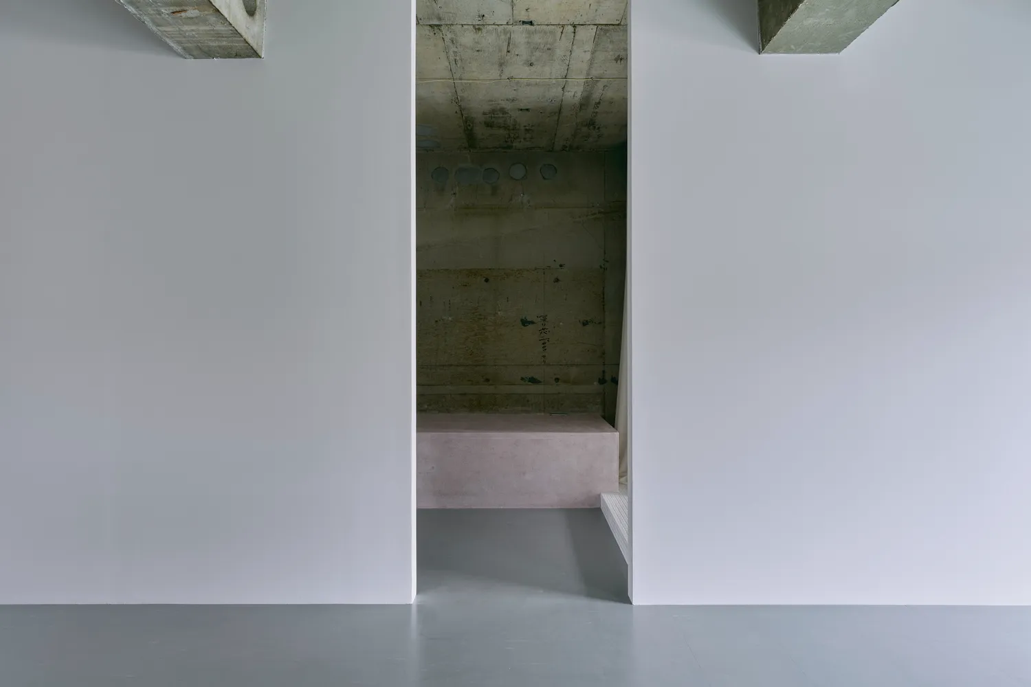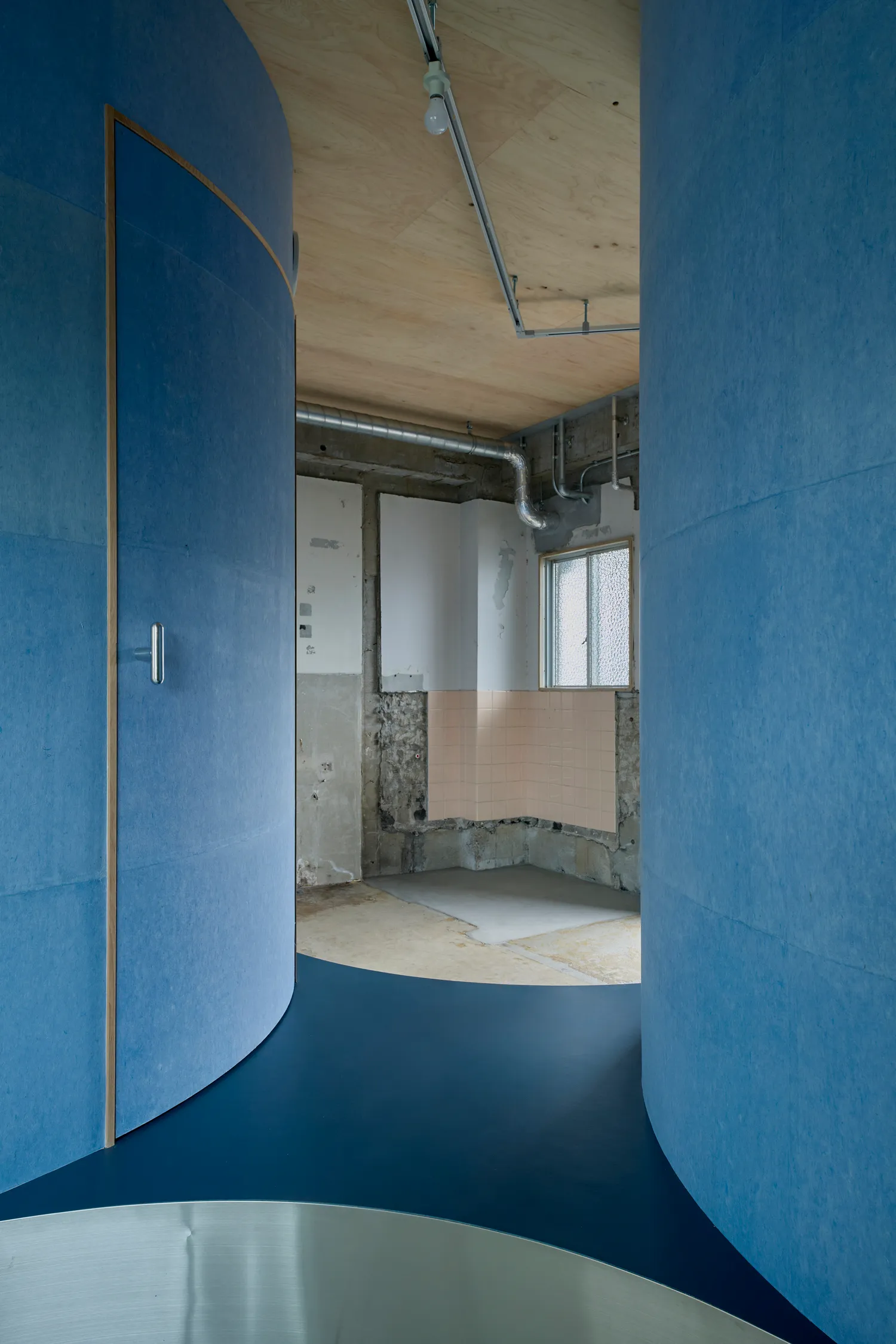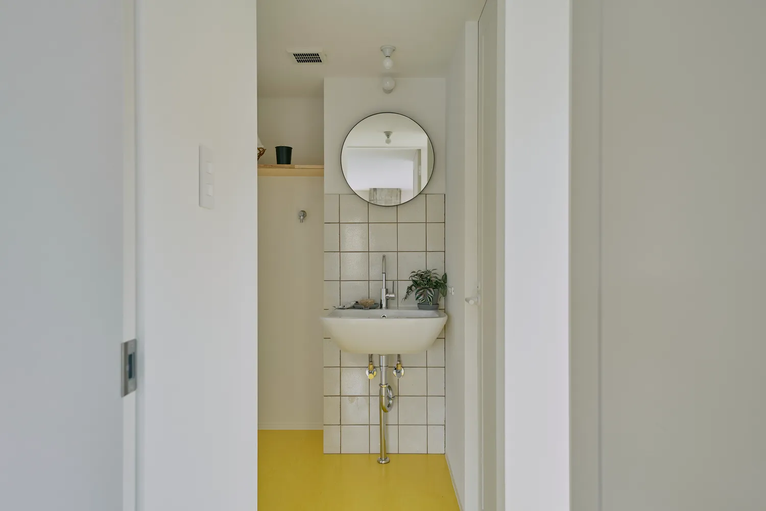 オフィスやアトリエ使いを想定したSOHOタイプ。住居用マンションを自宅兼事務所として使っていた経験からすると、生活感が全面にでると、打合せなどで人を招くこともしにくく、良くも悪くも仕事と生活の境界も曖昧になり、オンオフが薄れる。漠然と受け入れてしまうような事かもしれないが、この部屋ではそれに抗う計画とした。