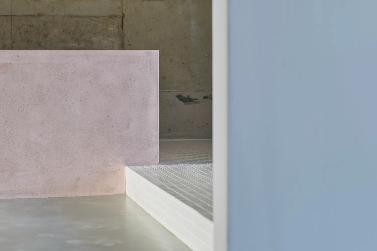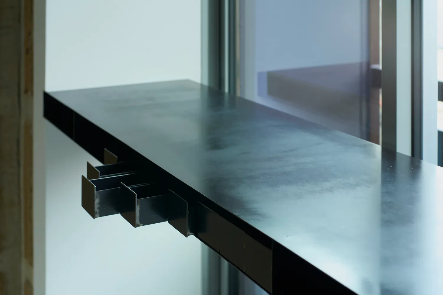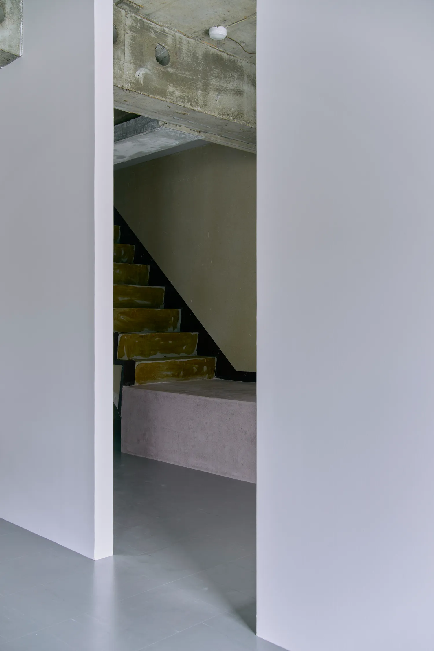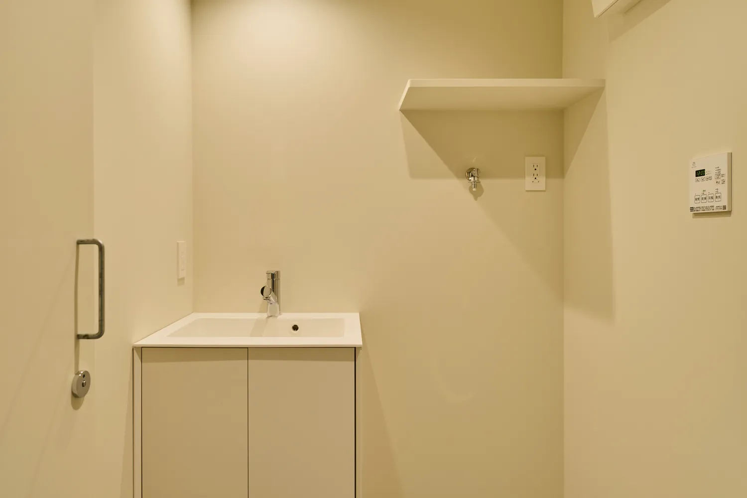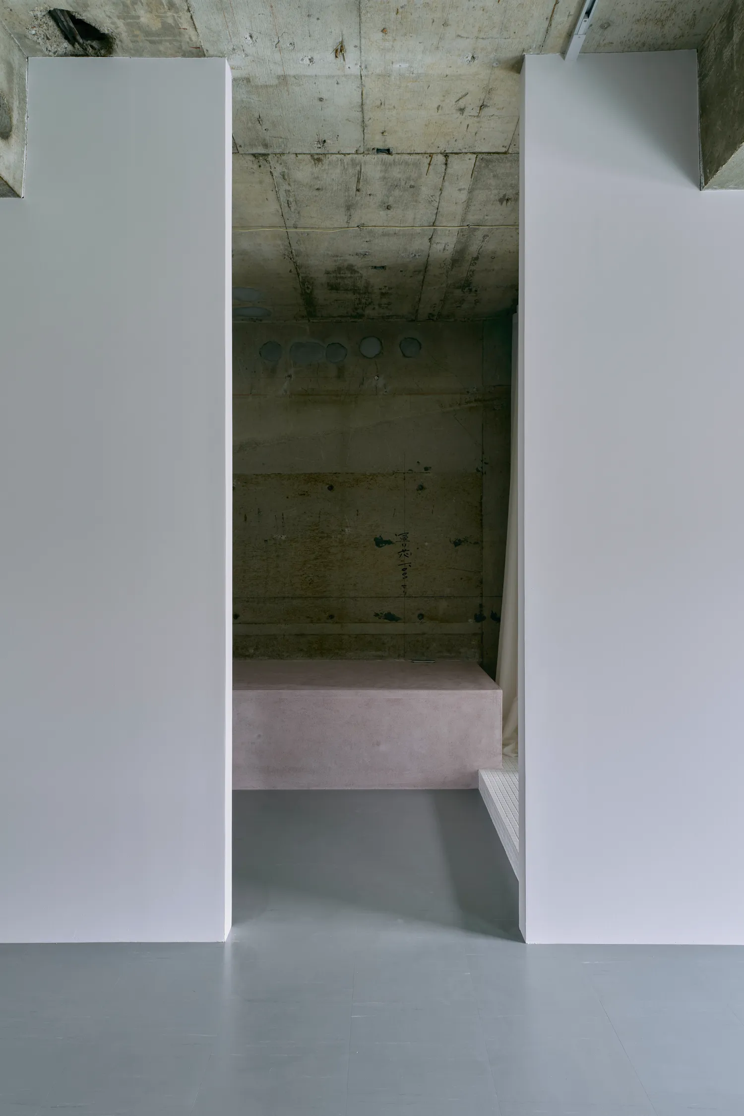 オフィスやアトリエ使いを想定したSOHOタイプ。住居用マンションを自宅兼事務所として使っていた経験からすると、生活感が全面にでると、打合せなどで人を招くこともしにくく、良くも悪くも仕事と生活の境界も曖昧になり、オンオフが薄れる。漠然と受け入れてしまうような事かもしれないが、この部屋ではそれに抗う計画とした。