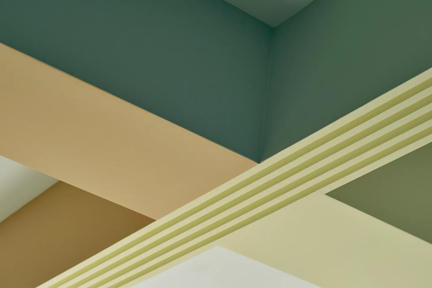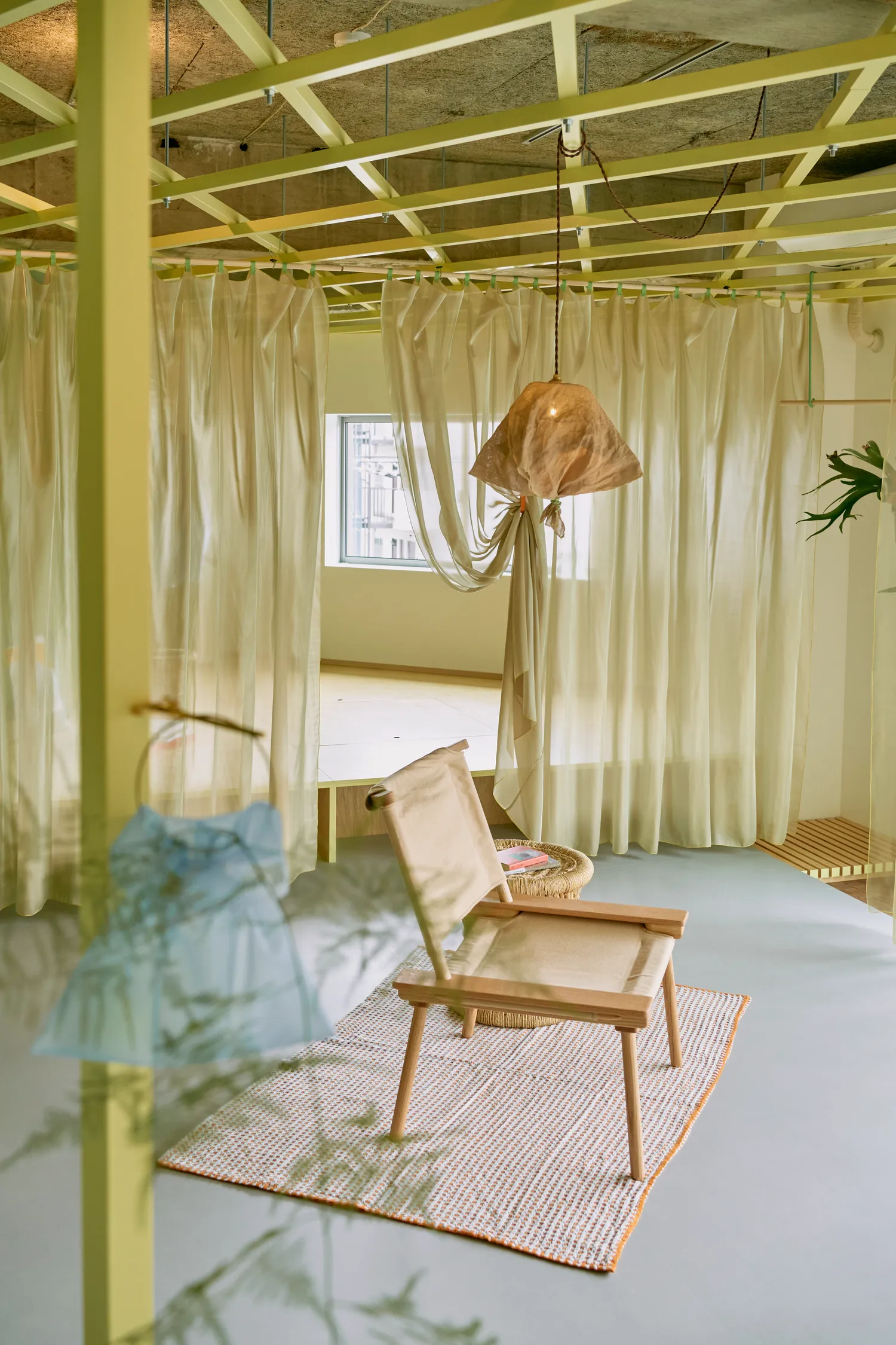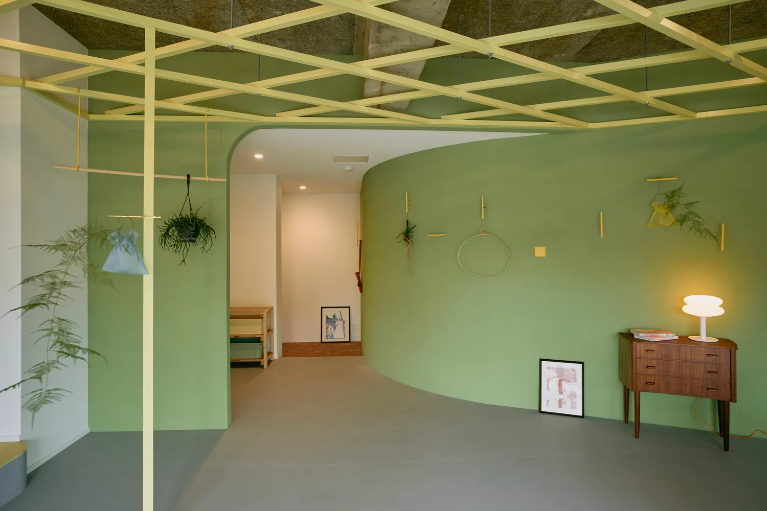 ぶどうの棚とも言われるパーゴラはつる植物により日陰をつくる休息の場をいいます。当プロジェクトはパーゴラをモチーフに、天井に寸三の格子を張り巡らしています。