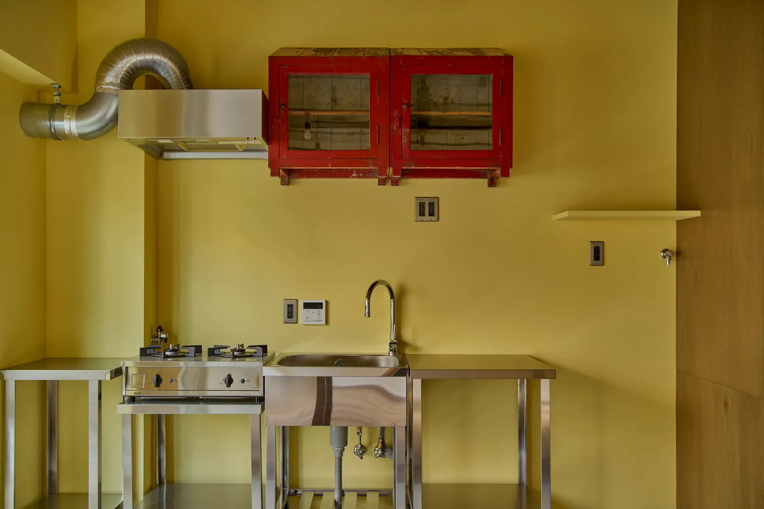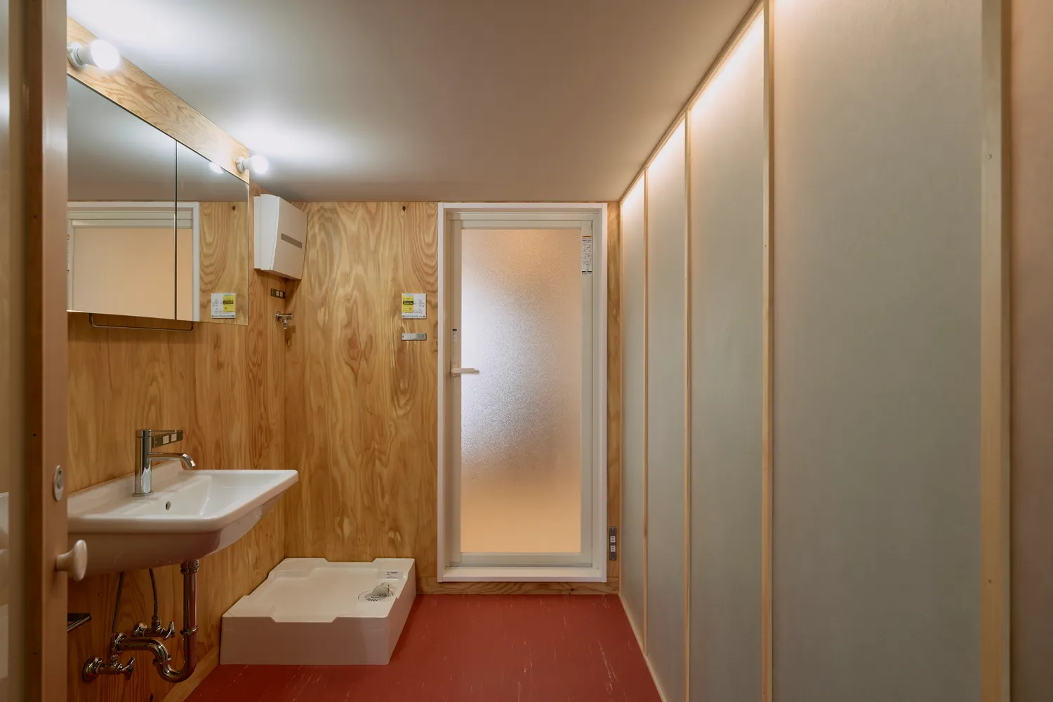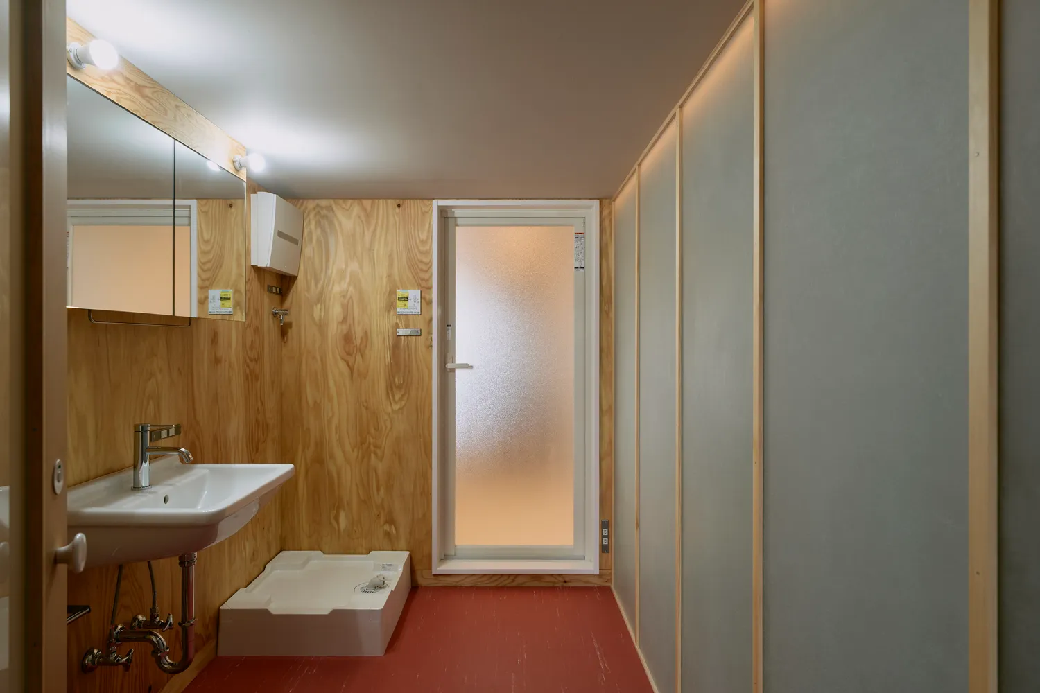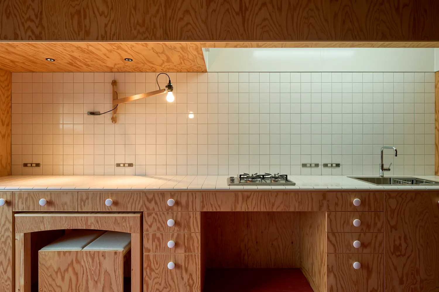 ど真ん中の扉兼パーティションの位置で、見た目も機能性も変えられるようにした。大きくはそれだけ。それから、必要最低限で機能性の高い生活道具を配備。