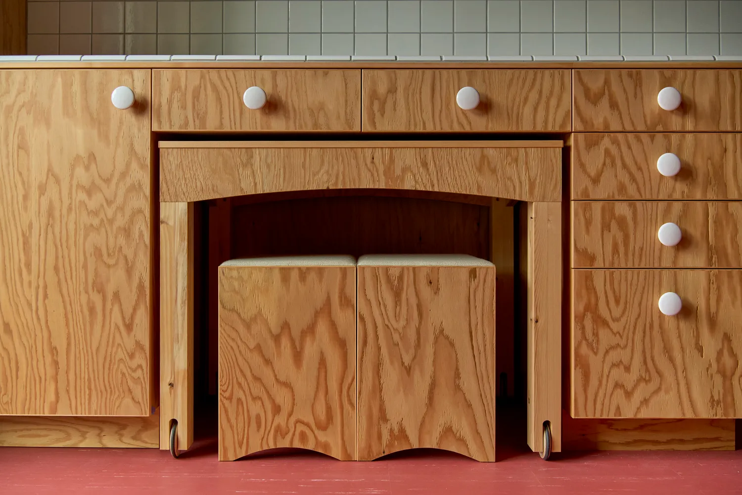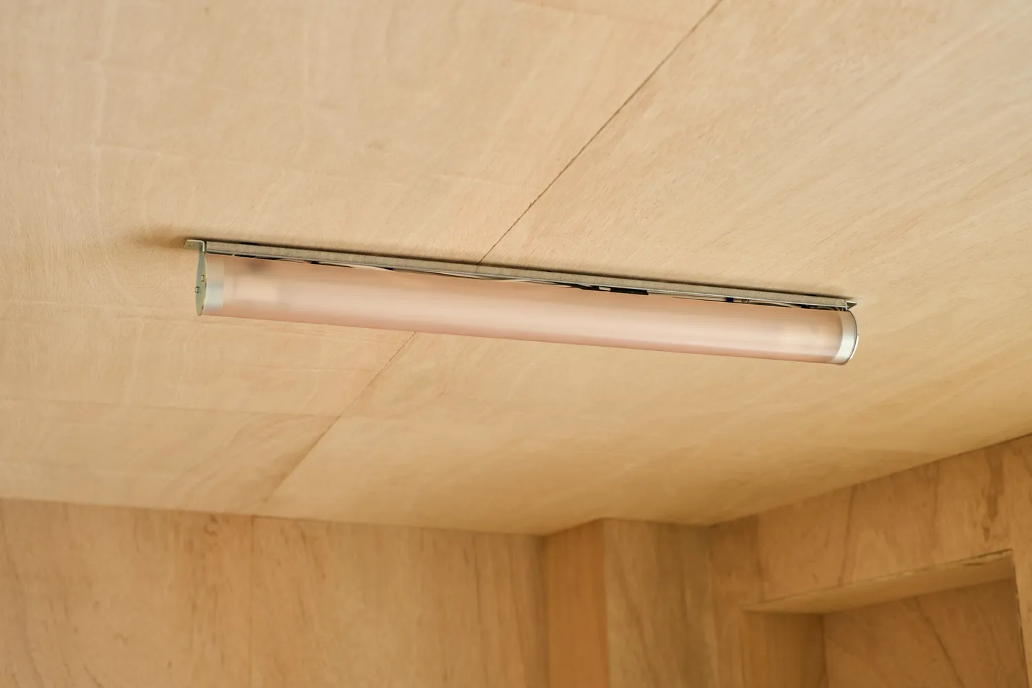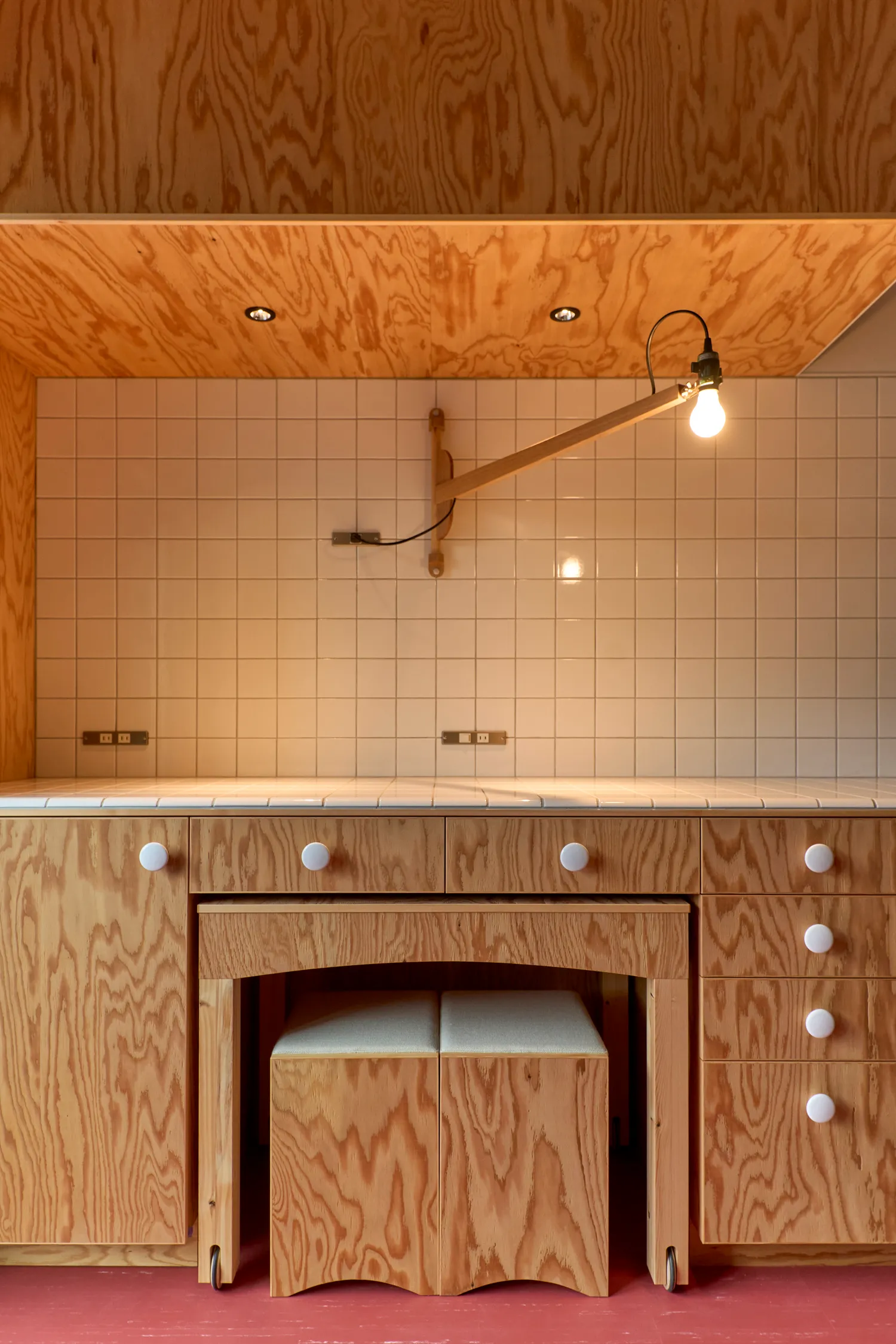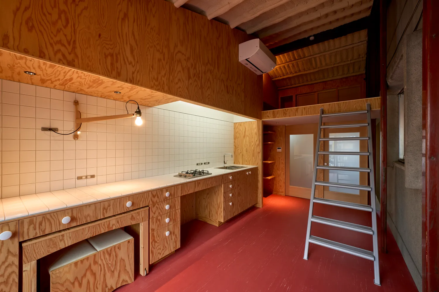 ど真ん中の扉兼パーティションの位置で、見た目も機能性も変えられるようにした。大きくはそれだけ。それから、必要最低限で機能性の高い生活道具を配備。