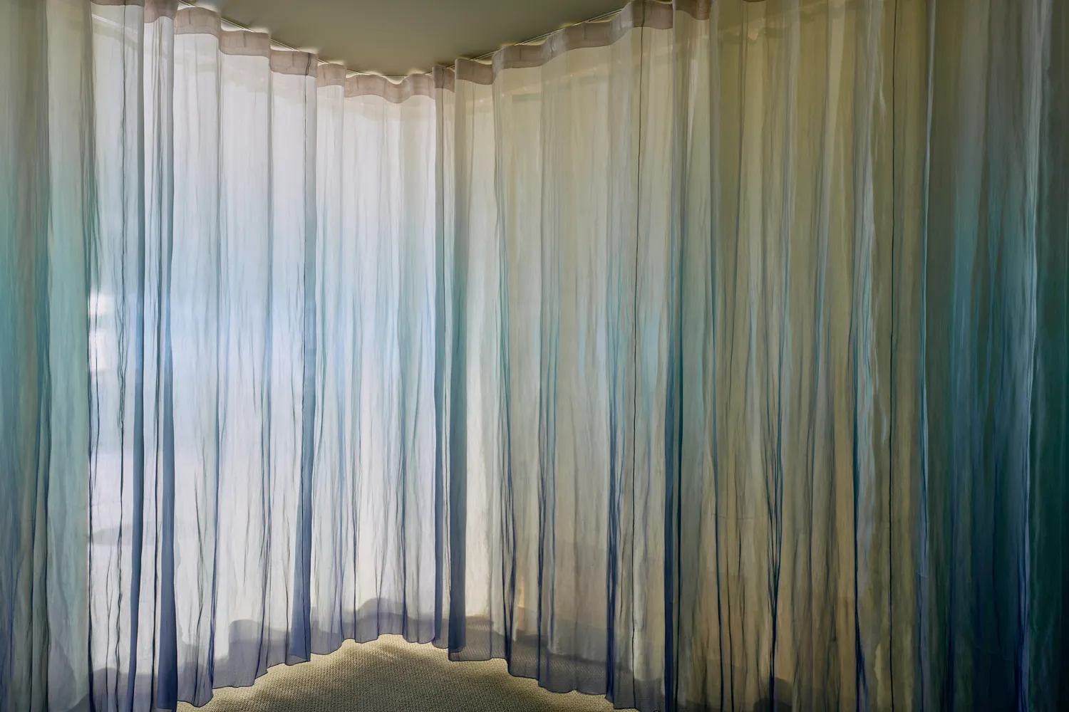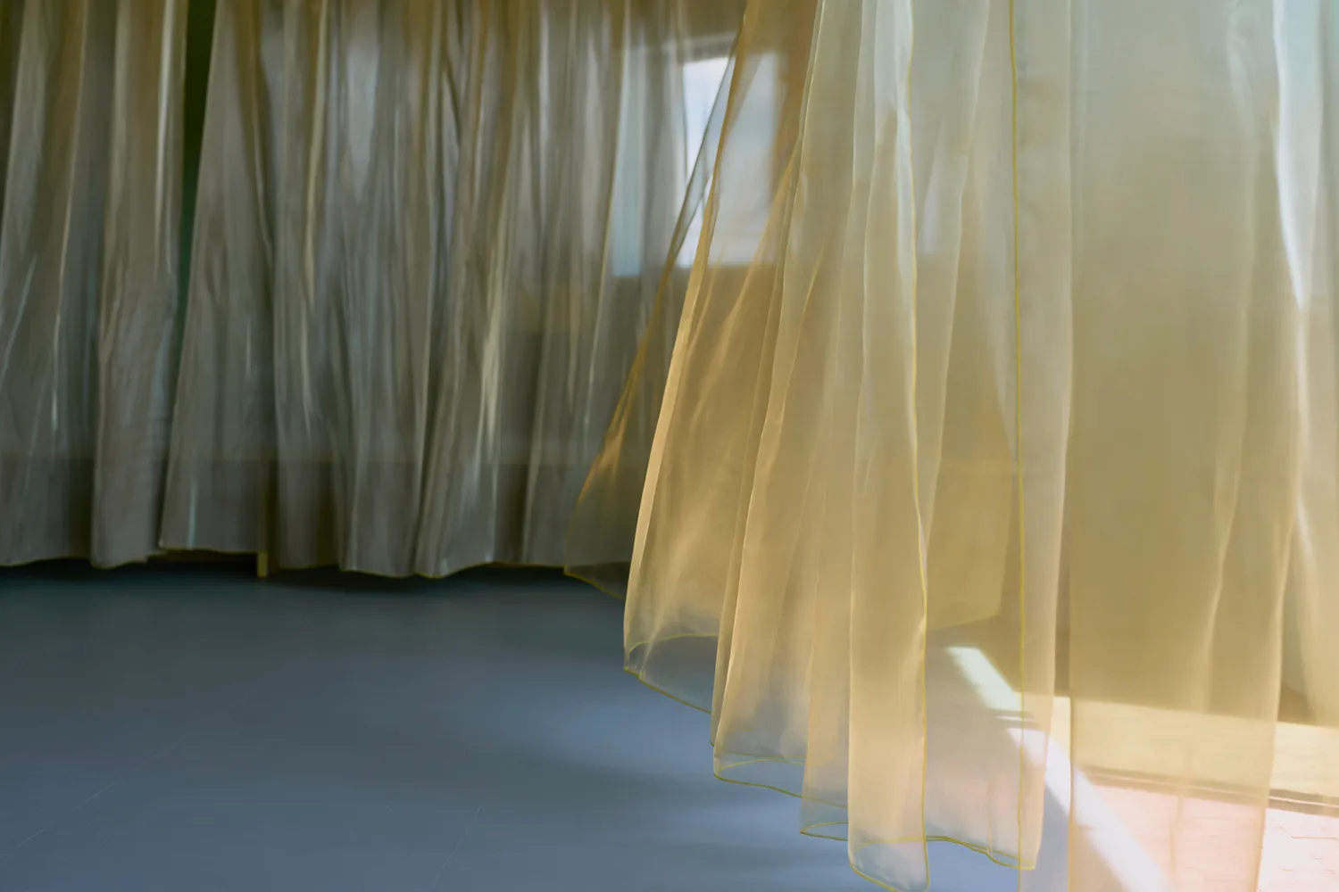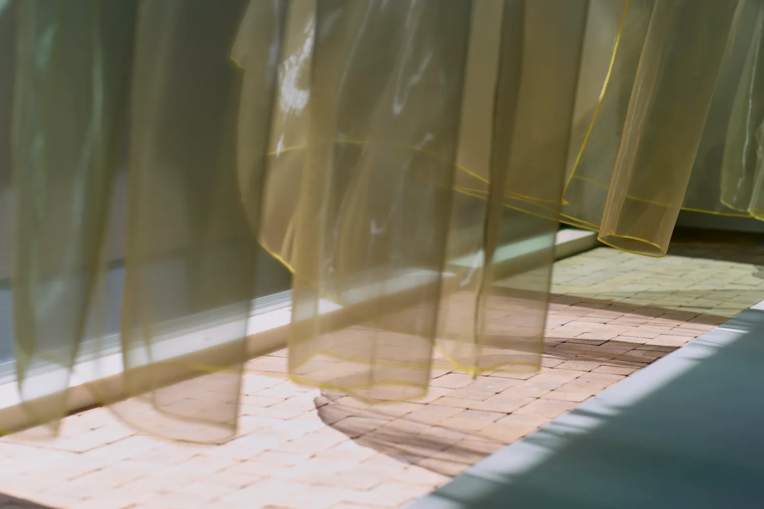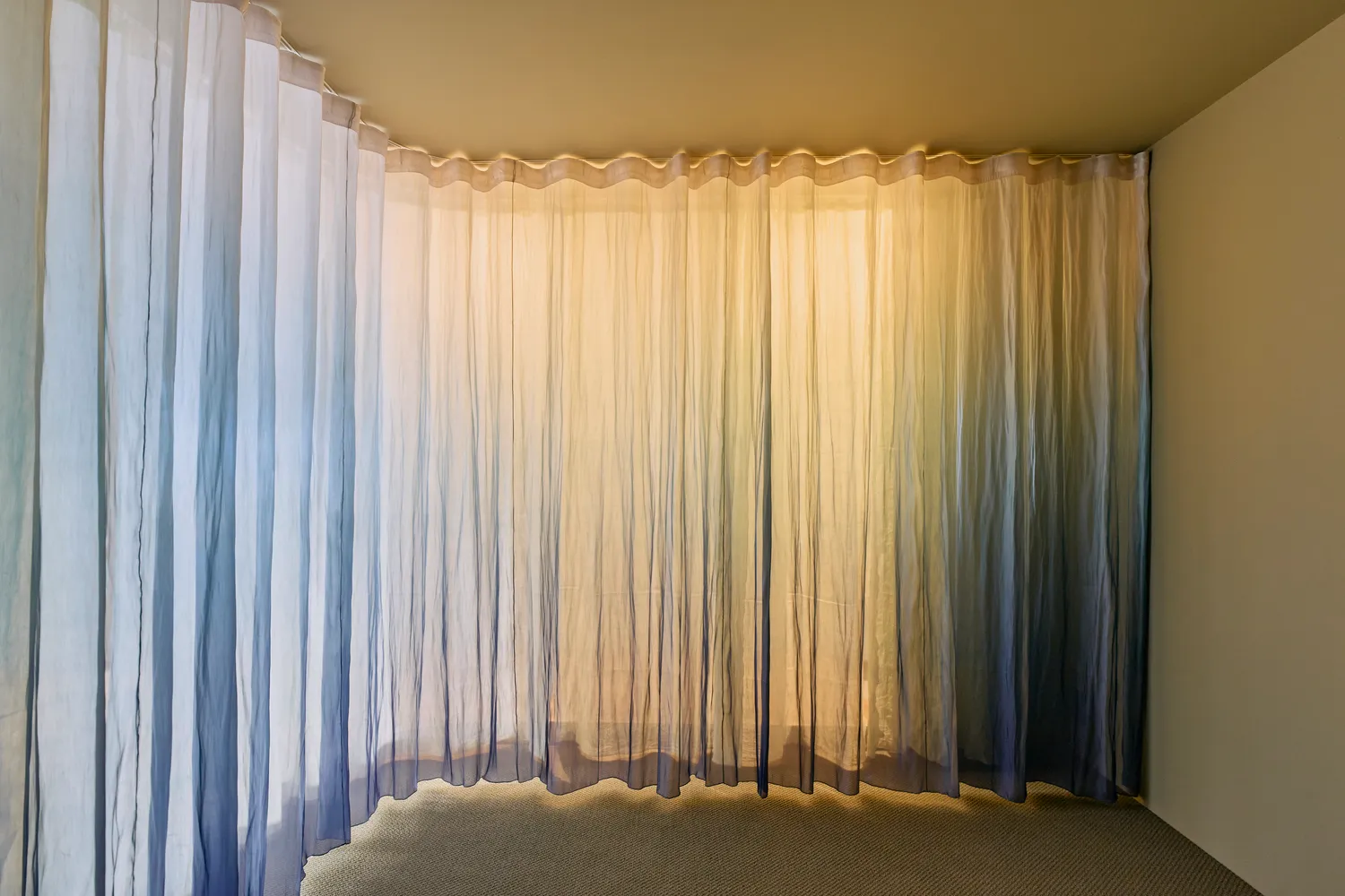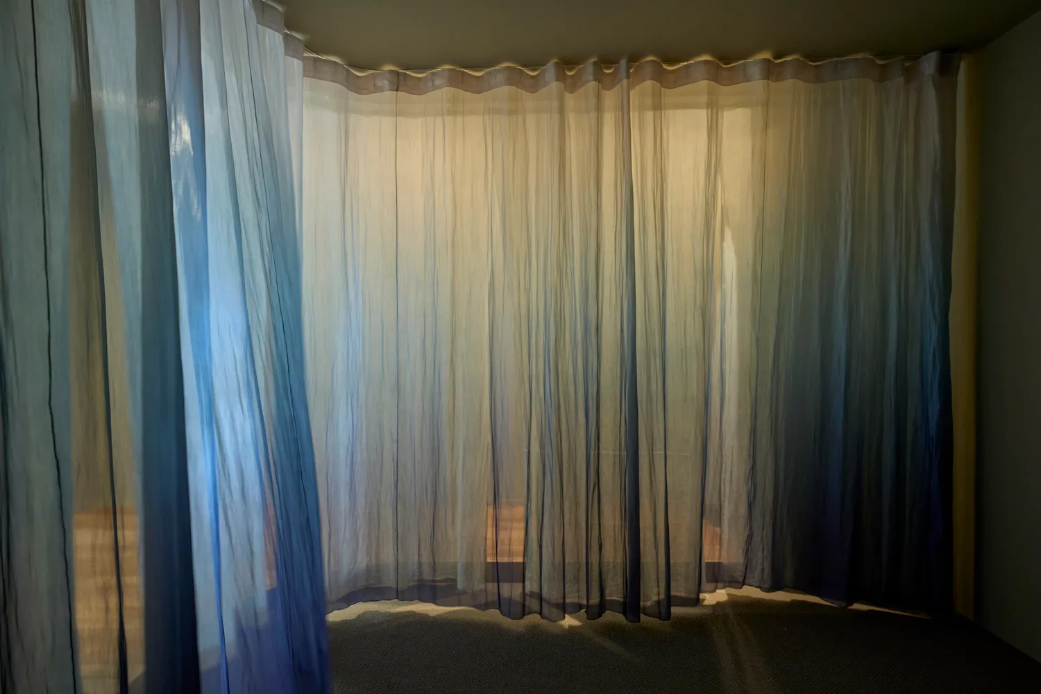 組み合わせとしている。どちらか一方に寄せた際に、透過面と不透過面が重なり遮光性能が上がる実験的な試み。