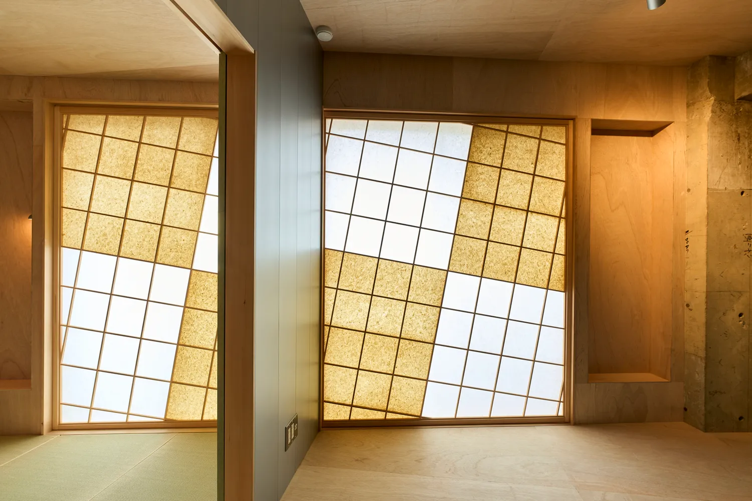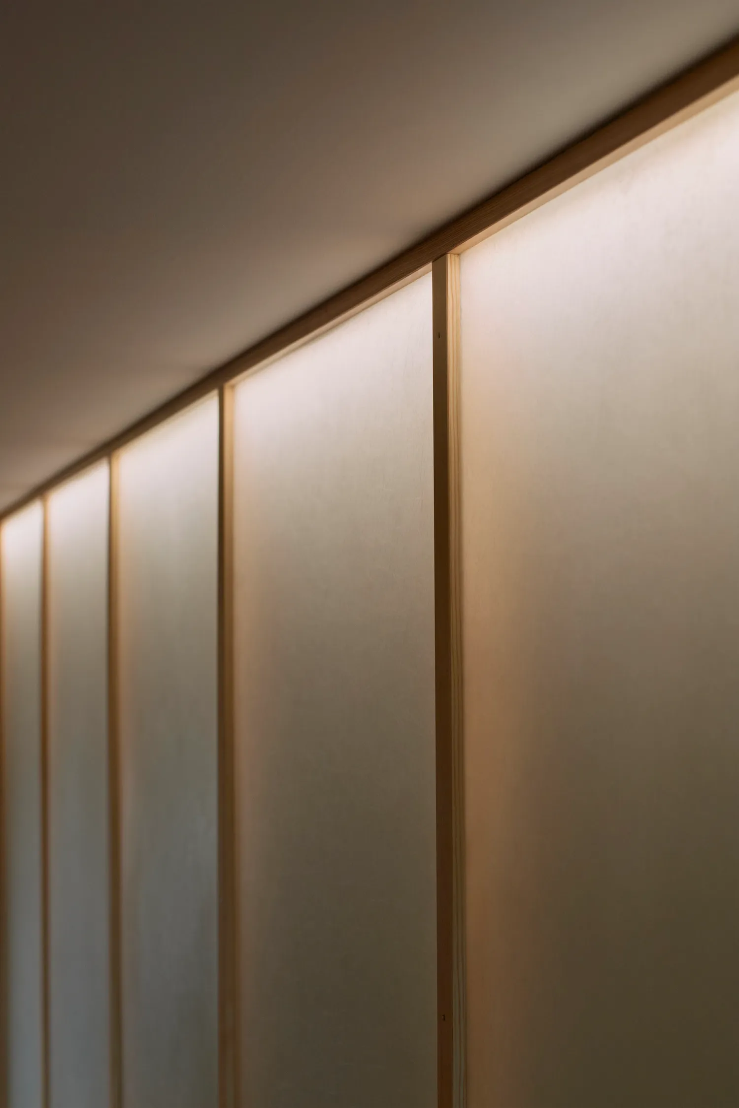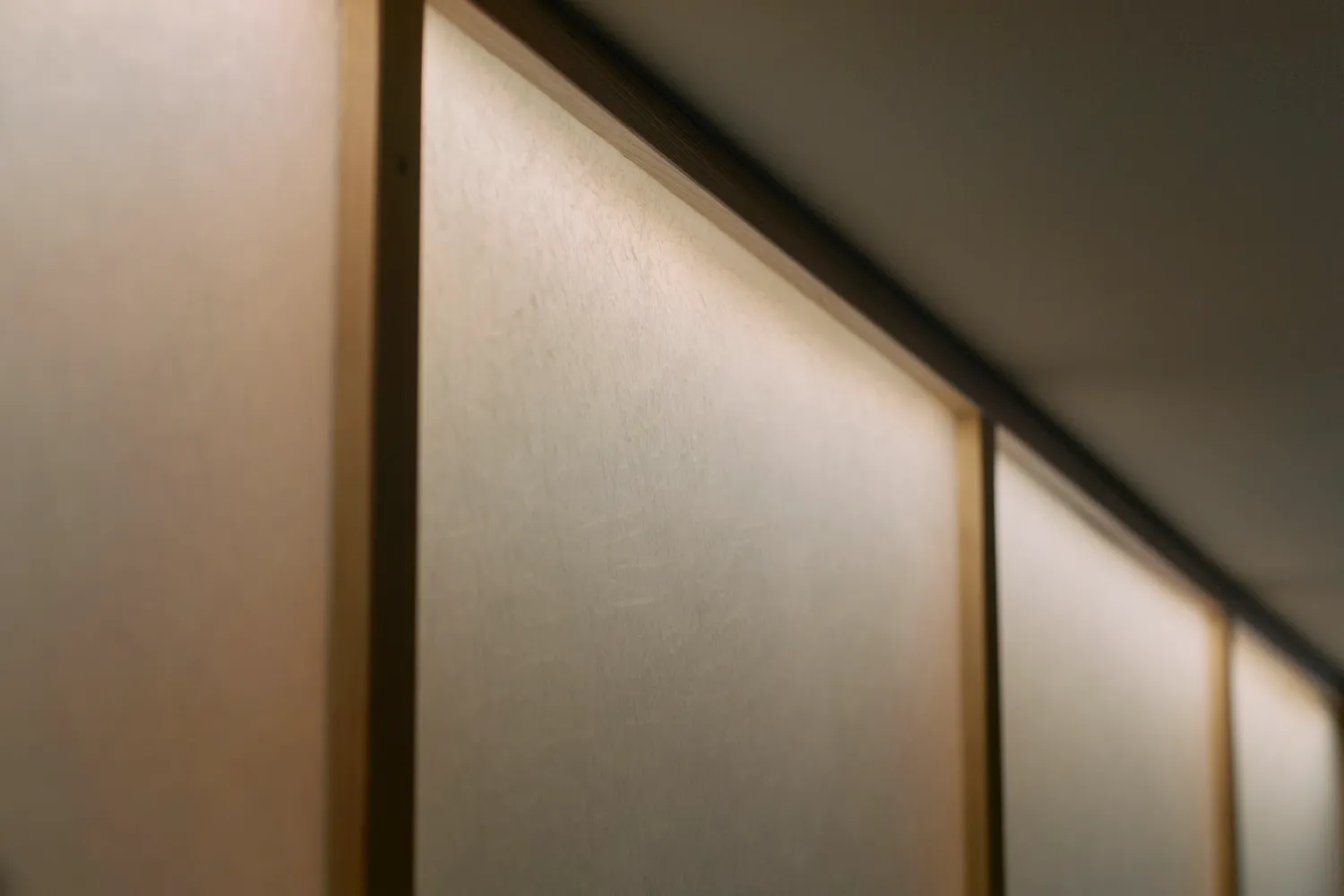 和紙は楮という木の皮を剥いで、表面の表皮や傷を取り除き、煮熟し、叩き、もう一度綺麗で使いやすい木の皮を作ることと考えています。なので、そんな和紙で包まれた空間は、木の皮で包まれているような心地良さと、人の手によるぬくもり、そして綺麗にしようという心がもたらす緊張感を備えています。