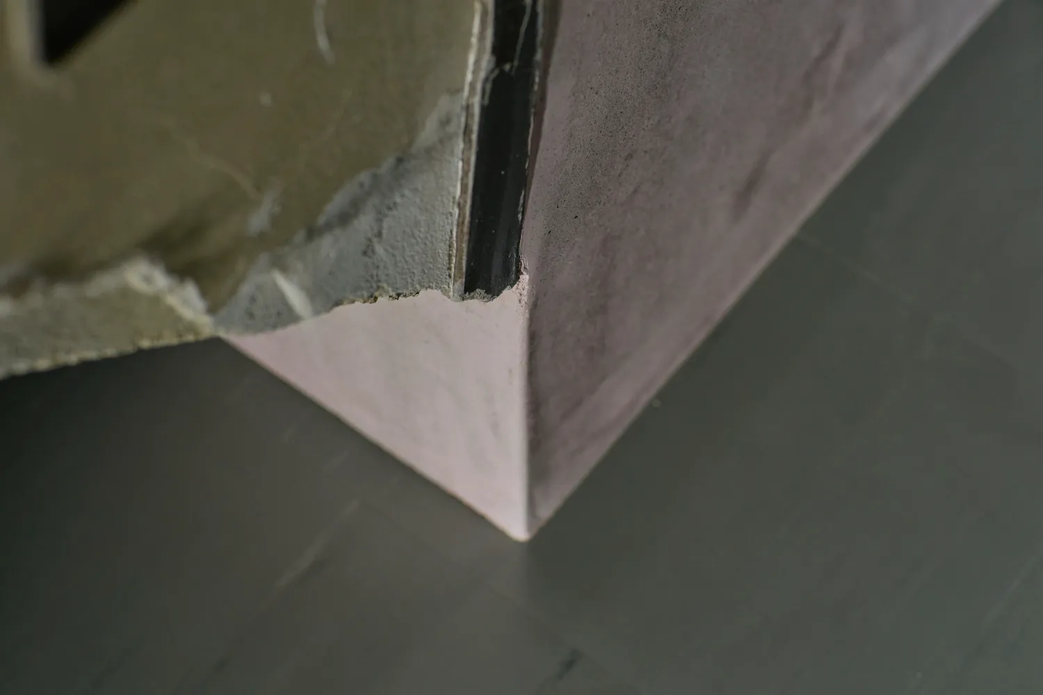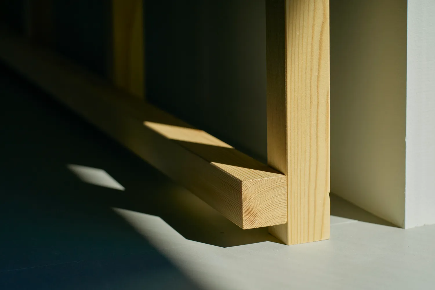 ①既存玄関戸と既存開口部から10度の角度を付けた壁を配置した。四角い部屋に対して10度のずれを基準にしたプランニングとすることで、単調さがなくなり、正面性もぼやけていく。