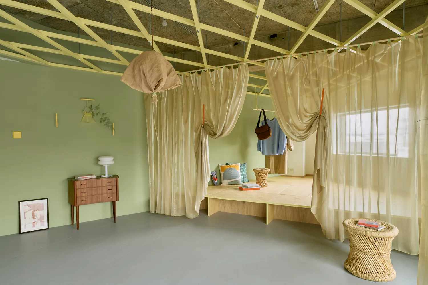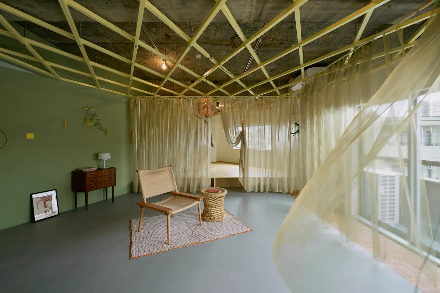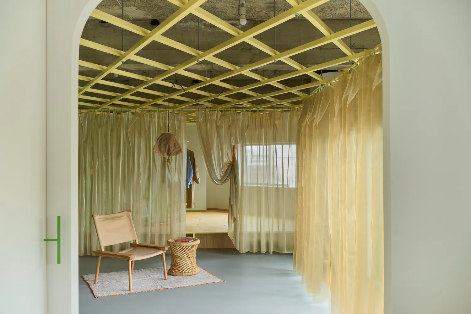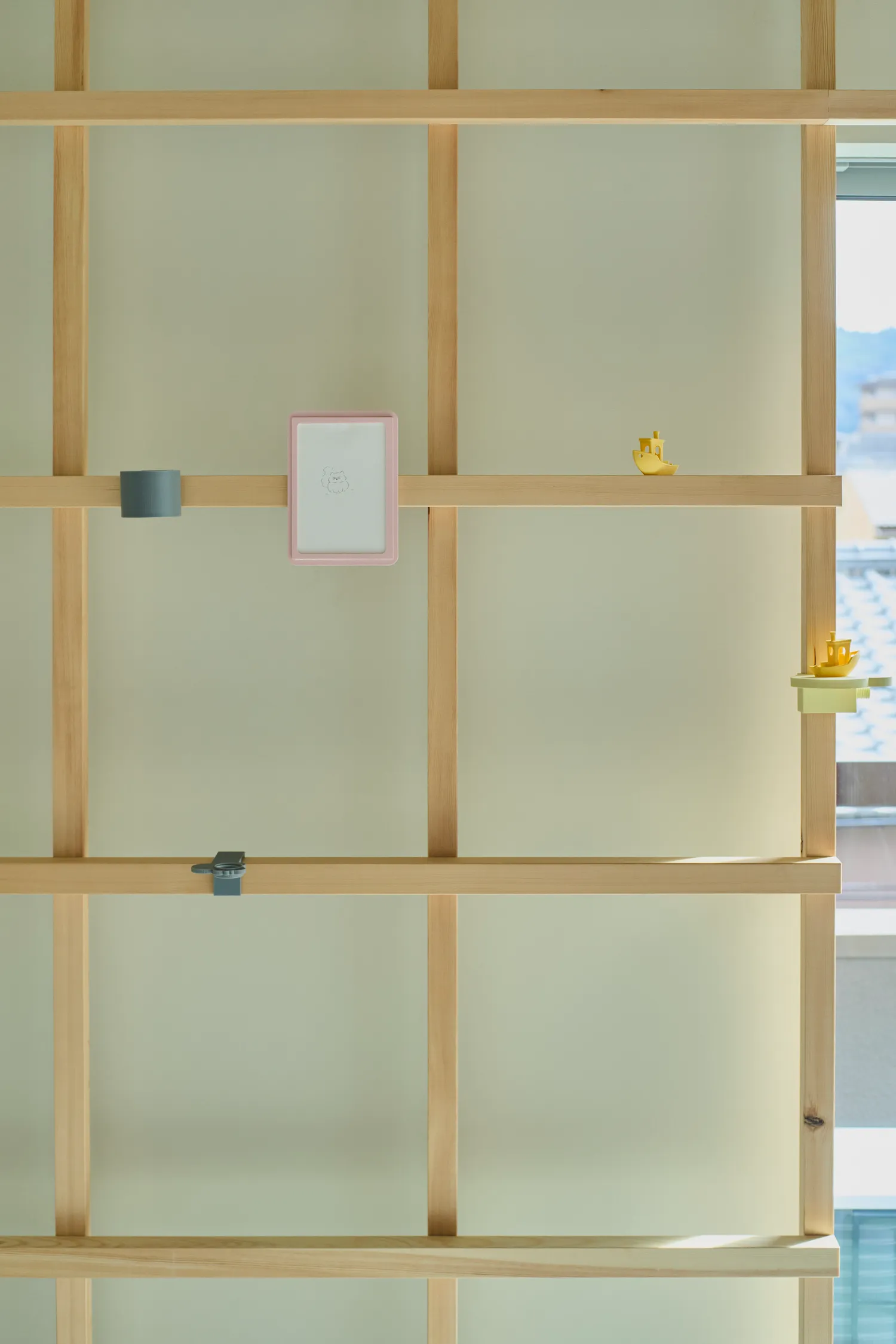 つる植物のように格子にあらゆるものを引っ掛けて空間を自由自在につくることができます。時にはファブリックを引っ掛けることで間仕切りとして機能させ、時にはポールを引っ掛けることでクローゼットとして機能させることができます。