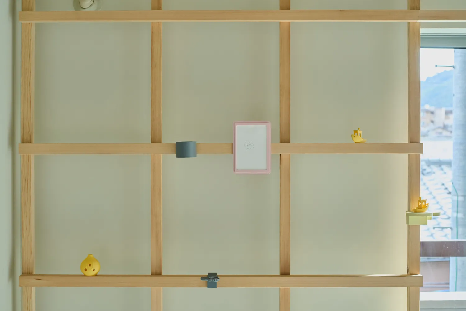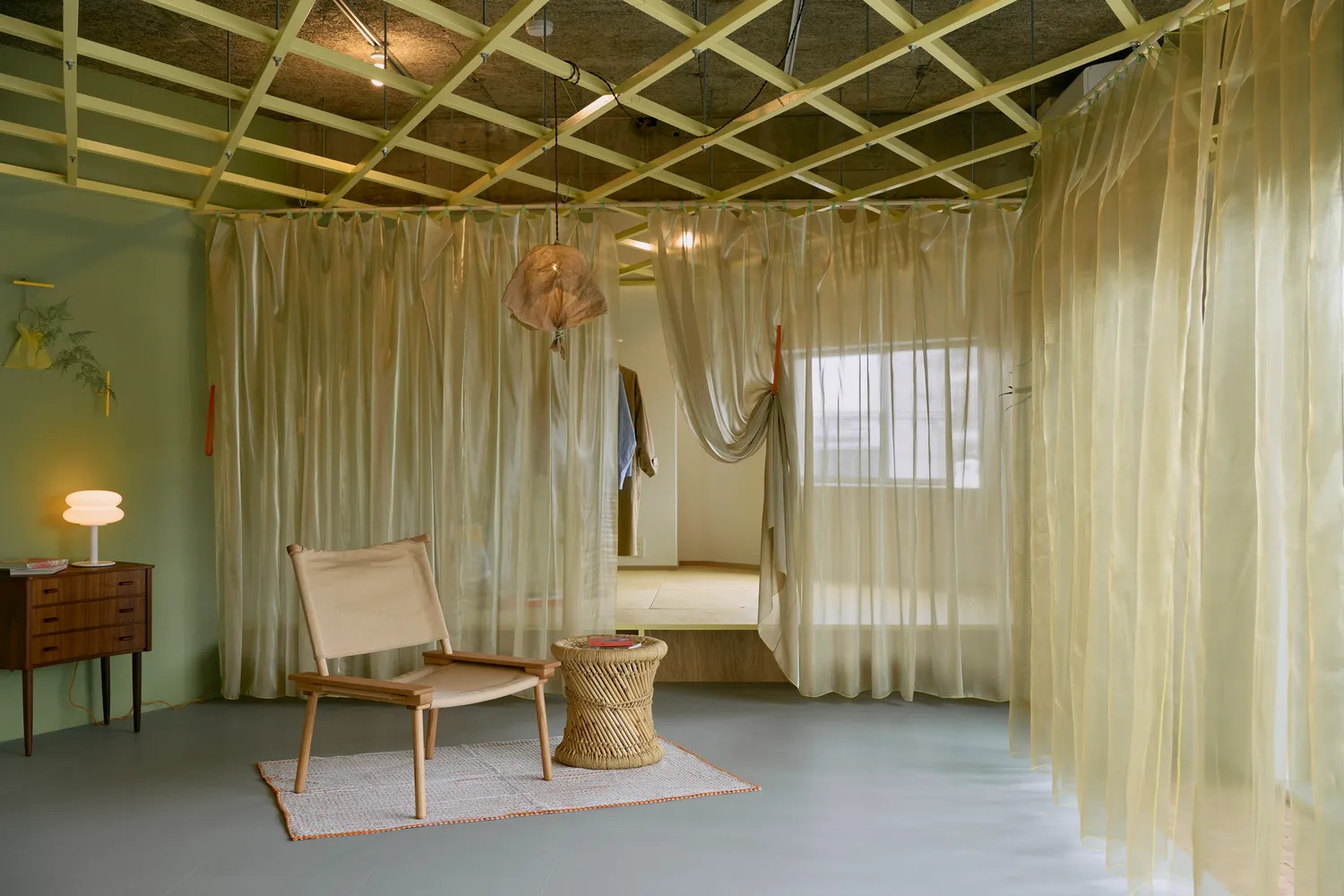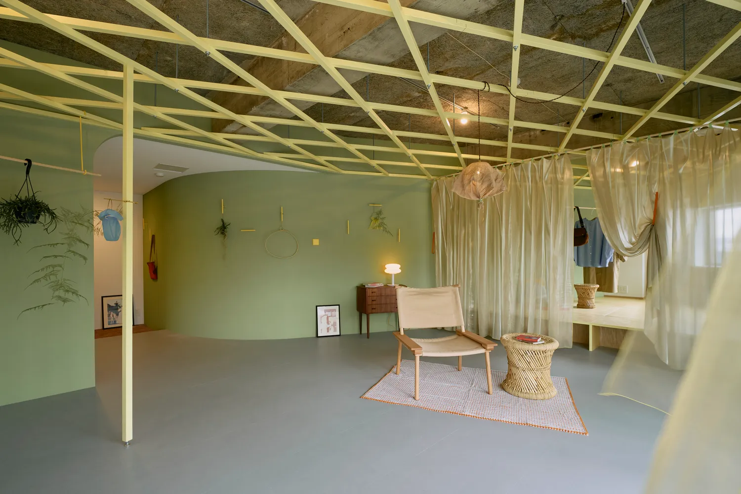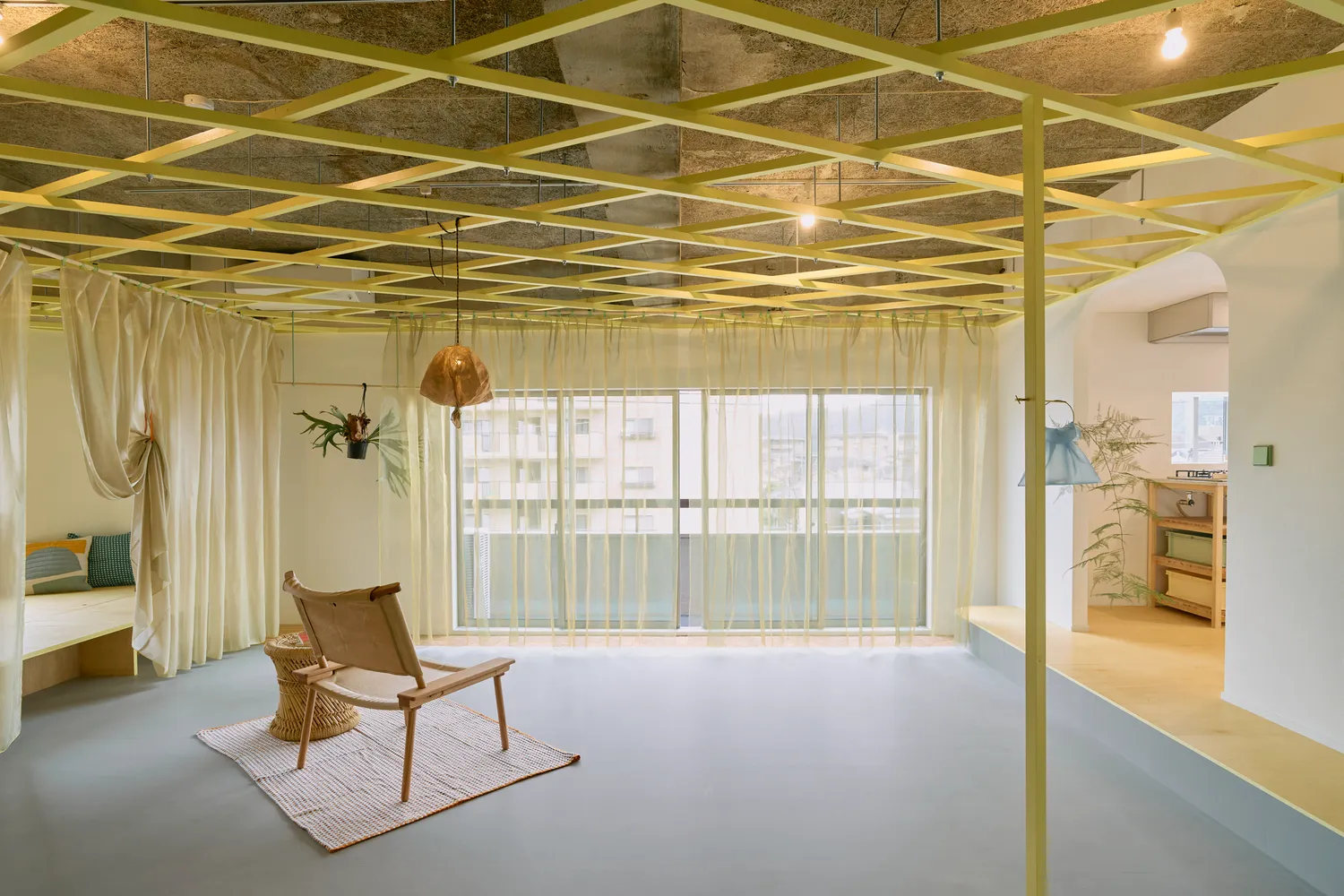 つる植物のように格子にあらゆるものを引っ掛けて空間を自由自在につくることができます。時にはファブリックを引っ掛けることで間仕切りとして機能させ、時にはポールを引っ掛けることでクローゼットとして機能させることができます。