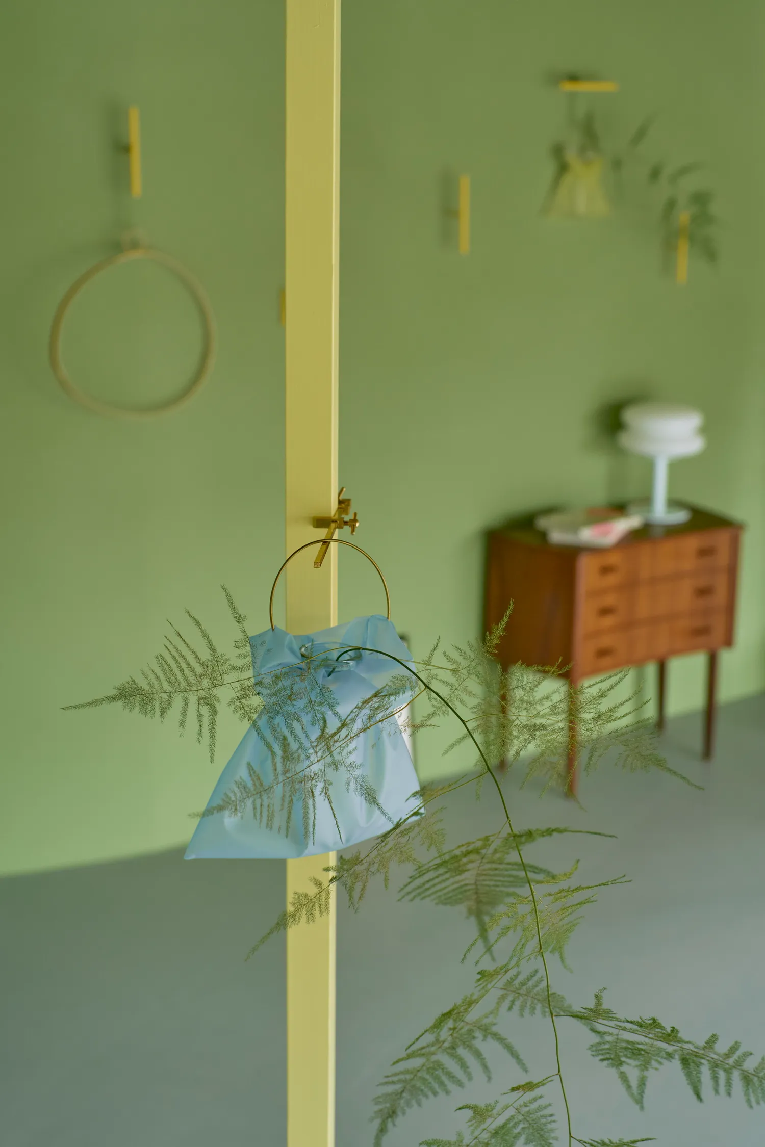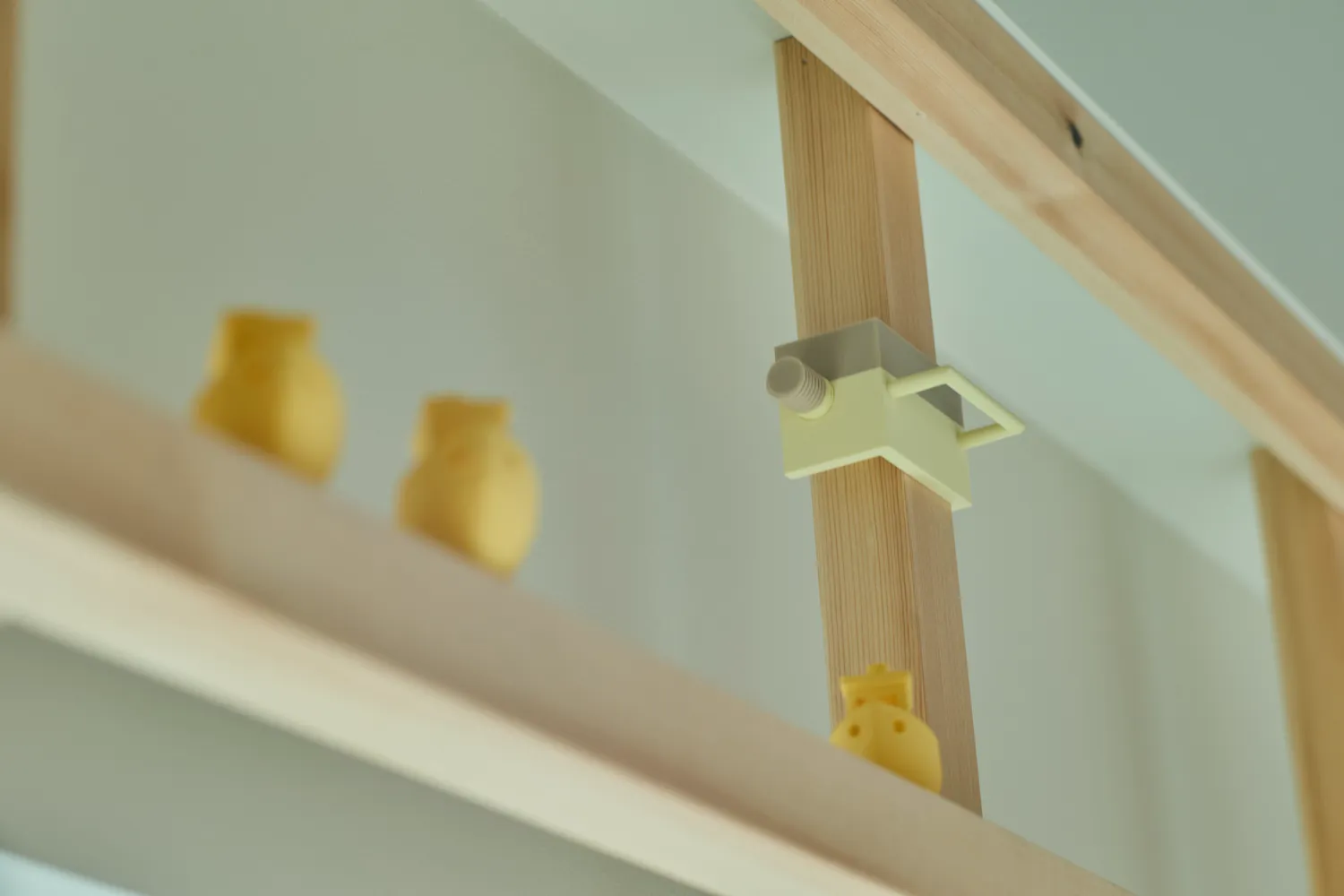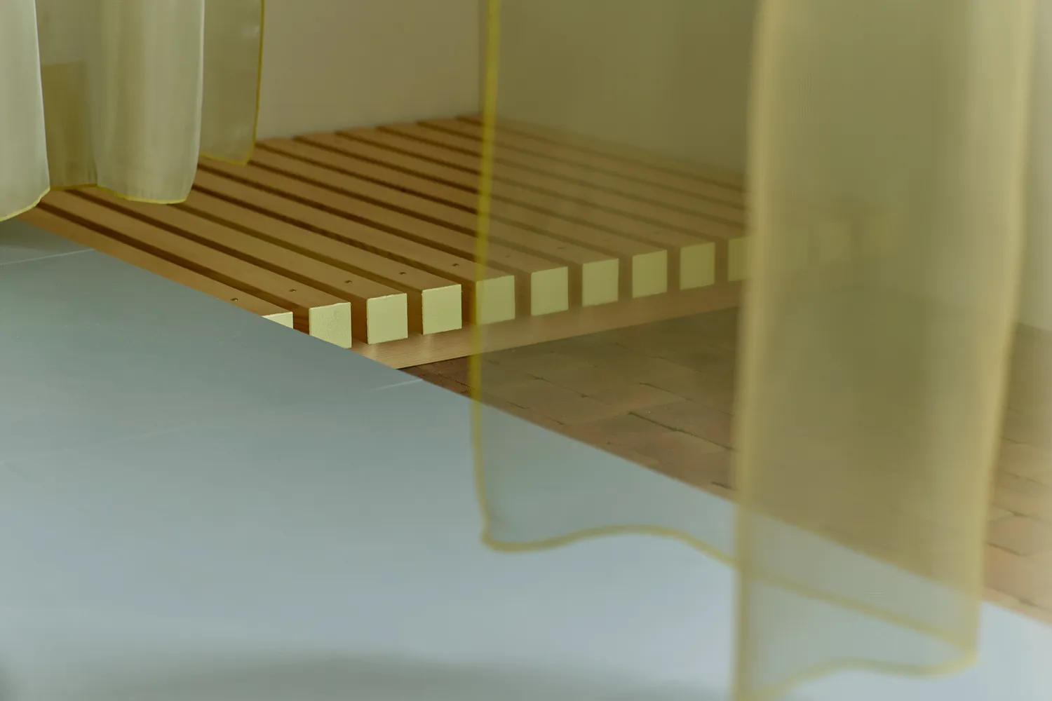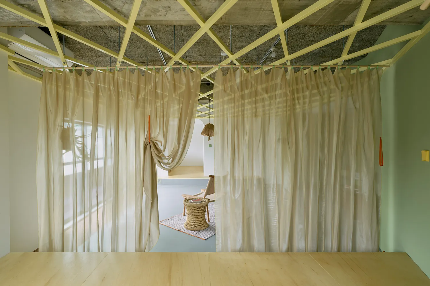 つる植物のように格子にあらゆるものを引っ掛けて空間を自由自在につくることができます。時にはファブリックを引っ掛けることで間仕切りとして機能させ、時にはポールを引っ掛けることでクローゼットとして機能させることができます。